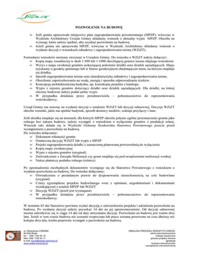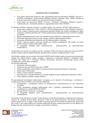 POZWOLENIE NA BUDOWĘ • • Jeśli gmina opracowała miejscowy plan zagospodarowania przestrzennego (MPZP), wówczas w Wydziale Architektury Urzędu Gminy składamy wniosek o aktualny wypis MPZP. Określa on wymogi, które naleŜy spełnić, aby uzyskać pozwolenie na budowę. JeŜeli gmina nie opracowała MPZP, wówczas w Wydziale Architektury składamy wniosek o wydanie decyzji o warunkach zabudowy i zagospodarowania terenu (WZiZT). Formularze wniosków moŜemy otrzymać w Urzędzie Gminy. Do wniosku o WZiZT naleŜy dołączyć: • Kopię mapy zasadniczej w skali 1:500 lub 1:1000 określającej granice terenu objętego wnioskiem • Wyrys z mapy ewidencji gruntów pokazującej połoŜenie działki oraz działek sąsiadujących. Mapy uzyskamy u geodety gminnego lub w biurze geodezyjnym obejmującym teren, na którym znajduje się działka. • Sposób zagospodarowania terenu oraz charakterystykę zabudowy i zagospodarowania terenu. • Określenie zapotrzebowania na wodę, energię i sposobu odprowadzania ścieków. • Koncepcję architektoniczną budynku, np. kserokopię projektu z katalogu. • Wypis z rejestru gruntów dotyczący działki oraz działek sąsiadujących. Dla działki, na której chcemy budować naleŜy podać pełny wypis • W przypadku działania przez przedstawiciela – pełnomocnictwo do reprezentowania wnioskodawcy. Urząd Gminy ma miesiąc na wydanie decyzji o ustalenie WZiZT lub decyzji odmownej. Decyzja WZiZT określa warunki, jakie ma spełnić budynek, sposób dostawy mediów, rodzaje przyłączy i inne. Jeśli działka znajduje się na terenach, dla których MPZP określa jedynie ogólne przeznaczenie gruntu jako rolnego bez zakazu budowy, naleŜy wystąpić z wnioskiem o wyłączenie gruntów z produkcji rolnej. Wniosek taki składa się w Wydziale Ochrony Środowiska Starostwa Powiatowego jeszcze przed wystąpieniem o pozwolenie na budowę. Do wniosku dołączamy: • Dokument własności gruntu • Ostateczną decyzję WZiZT lub wypis z MPZP • Projekt zagospodarowania działki z zaznaczoną planowaną powierzchnią do wyłączenia • Kopię mapy ewidencyjnej • Wypis z rejestru gruntów (oryginał) • Zaświadczenie z Zarządu Melioracji czy grunt znajduje się pod urządzeniami melioracji wodnej • Nakaz płatniczy podatku rolnego (rolnicy) Po zgromadzeniu niezbędnych dokumentów występuje się do Starostwa Powiatowego z wnioskiem o wydanie pozwolenia na budowę. Do wniosku dołączamy: • Oświadczenie o posiadanym prawie do dysponowania nieruchomością na cele budowlane (oryginał) • Cztery egzemplarze projektu budowlanego wraz z opiniami, uzgodnieniami i dokumentami wynikającymi z ustaleń MPZP lub WZiZT • Decyzję WZiZT (jeŜeli jest wymagana) • W przypadku działania przez przedstawiciela – pełnomocnictwo do reprezentowania wnioskodawcy. W terminie 65 dni Starostwo powinno wydać decyzję o zatwierdzeniu projektu i udzieleniu pozwolenia na budowę. Po wydaniu decyzji naleŜy poczekać 14 dni na jej uprawomocnienie. Od decyzji odmownej moŜna odwoływać się w ciągu 14 dni od daty otrzymania decyzji. Pozwolenie na budowę jest waŜne dwa lata. JeŜeli w tym czasie budowa nie zostanie rozpoczęta lub prace zostaną przerwane na czas dłuŜszy niŜ kolejne dwa lata, trzeba ponownie wystąpić o pozwolenie na budowę. ul. Obwodowa 31B/M26 84-240 Reda tel.: 058 / 740 54 10 faks: 058 / 740 54 11 e-mail: [email protected] www.skalar.pomorze.pl OBSŁUGA PROCESU INWESTYCYJNEGO: obrót nieruchomościami kredyty hipoteczne gotowe projekty domów geodezja budowa nieruchomości zarządzanie nieruchomością