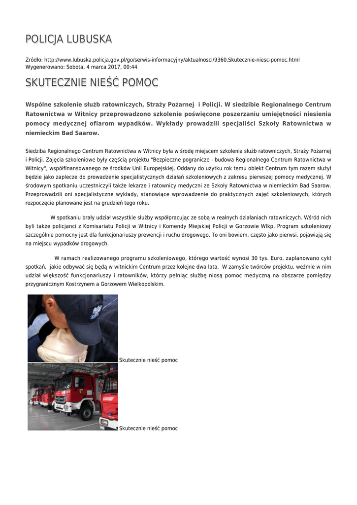 POLICJA LUBUSKA Źródło: http://www.lubuska.policja.gov.pl/go/serwis-informacyjny/aktualnosci/9360,Skutecznie-niesc-pomoc.html Wygenerowano: Sobota, 4 marca 2017, 00:44 SKUTECZNIE NIEŚĆ POMOC Wspólne szkolenie służb ratowniczych, Straży Pożarnej i Policji. W siedzibie Regionalnego Centrum Ratownictwa w Witnicy przeprowadzono szkolenie poświęcone poszerzaniu umiejętności niesienia pomocy medycznej ofiarom wypadków. Wykłady prowadzili specjaliści Szkoły Ratownictwa w niemieckim Bad Saarow. Siedziba Regionalnego Centrum Ratownictwa w Witnicy była w środę miejscem szkolenia służb ratowniczych, Straży Pożarnej i Policji. Zajęcia szkoleniowe były częścią projektu "Bezpieczne pogranicze - budowa Regionalnego Centrum Ratownictwa w Witnicy", współfinansowanego ze środków Unii Europejskiej. Oddany do użytku rok temu obiekt Centrum tym razem służył będzie jako zaplecze do prowadzenie specjalistycznych działań szkoleniowych z zakresu pierwszej pomocy medycznej. W środowym spotkaniu uczestniczyli także lekarze i ratownicy medyczni ze Szkoły Ratownictwa w niemieckim Bad Saarow. Przeprowadzili oni specjalistyczne wykłady, stanowiące wprowadzenie do praktycznych zajęć szkoleniowych, których rozpoczęcie planowane jest na grudzień tego roku. W spotkaniu brały udział wszystkie służby współpracując ze sobą w realnych działaniach ratowniczych. Wśród nich byli także policjanci z Komisariatu Policji w Witnicy i Komendy Miejskiej Policji w Gorzowie Wlkp. Program szkoleniowy szczególnie pomocny jest dla funkcjonariuszy prewencji i ruchu drogowego. To oni bowiem, często jako pierwsi, pojawiają się na miejscu wypadków drogowych. W ramach realizowanego programu szkoleniowego, którego wartość wynosi 30 tys. Euro, zaplanowano cykl spotkań, jakie odbywać się będą w witnickim Centrum przez kolejne dwa lata. W zamyśle twórców projektu, weźmie w nim udział większość funkcjonariuszy i ratowników, którzy pełniąc służbę niosą pomoc medyczną na obszarze pomiędzy przygranicznym Kostrzynem a Gorzowem Wielkopolskim. Skutecznie nieść pomoc Skutecznie nieść pomoc Skutecznie nieść pomoc Skutecznie nieść pomoc Skutecznie nieść pomoc Skutecznie nieść pomoc Ocena: 0/5 (0) Tweetnij