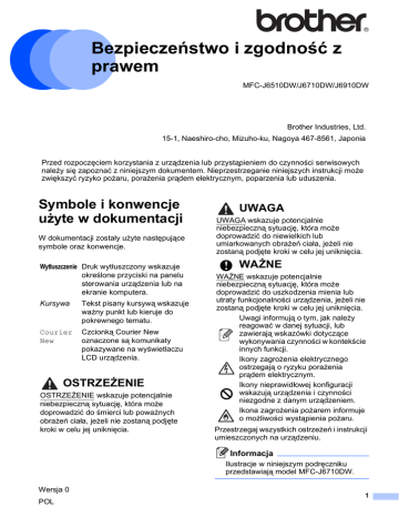 Bezpieczeństwo i zgodność z prawem 1 MFC-J6510DW/J6710DW/J6910DW Brother Industries, Ltd. 15-1, Naeshiro-cho, Mizuho-ku, Nagoya 467-8561, Japonia Przed rozpoczęciem korzystania z urządzenia lub przystąpieniem do czynności serwisowych należy się zapoznać z niniejszym dokumentem. Nieprzestrzeganie niniejszych instrukcji może zwiększyć ryzyko pożaru, porażenia prądem elektrycznym, poparzenia lub uduszenia. Symbole i konwencje użyte w dokumentacji W dokumentacji zostały użyte następujące symbole oraz konwencje. Wytłuszczenie Druk wytłuszczony wskazuje określone przyciski na panelu sterowania urządzenia lub na ekranie komputera. Kursywa Tekst pisany kursywą wskazuje ważny punkt lub kieruje do pokrewnego tematu. Courier New Czcionką Courier New oznaczone są komunikaty pokazywane na wyświetlaczu LCD urządzenia. OSTRZEŻENIE OSTRZEŻENIE wskazuje potencjalnie niebezpieczną sytuację, która może doprowadzić do śmierci lub poważnych obrażeń ciała, jeżeli nie zostaną podjęte kroki w celu jej uniknięcia. UWAGA 1 UWAGA wskazuje potencjalnie niebezpieczną sytuację, która może doprowadzić do niewielkich lub umiarkowanych obrażeń ciała, jeżeli nie zostaną podjęte kroki w celu jej uniknięcia. WAŻNE WAŻNE wskazuje potencjalnie niebezpieczną sytuację, która może doprowadzić do uszkodzenia mienia lub utraty funkcjonalności urządzenia, jeżeli nie zostaną podjęte kroki w celu jej uniknięcia. Uwagi informują o tym, jak należy reagować w danej sytuacji, lub zawierają wskazówki dotyczące wykonywania czynności w kontekście innych funkcji. Ikony zagrożenia elektrycznego ostrzegają o ryzyku porażenia prądem elektrycznym. Ikony nieprawidłowej konfiguracji wskazują urządzenia i czynności niezgodne z danym urządzeniem. Ikona zagrożenia pożarem informuje o możliwości wystąpienia pożaru. Przestrzegaj wszystkich ostrzeżeń i instrukcji umieszczonych na urządzeniu. Informacja Ilustracje w niniejszym podręczniku przedstawiają model MFC-J6710DW. Wersja 0 POL 1 Nota dotycząca opracowania i publikacji Niniejszy podręcznik został opracowany i wydany pod nadzorem firmy Brother Industries, Ltd. Zawiera on najnowsze opisy oraz dane techniczne produktu. Treść niniejszego podręcznika oraz dane techniczne produktu mogą ulec zmianie bez powiadomienia. Firma Brother zastrzega sobie prawo do wprowadzania zmian w specyfikacjach i dokumentacji zawartych w niniejszym podręczniku bez powiadomienia oraz nie ponosi odpowiedzialności za żadne szkody (również wynikowe) spowodowane korzystaniem z tych informacji, w tym także za błędy typograficzne i inne, które mogą występować w tej publikacji. 2 1 Wybór bezpiecznego miejsca dla urządzenia 1 Postaw urządzenie na płaskiej, stabilnej powierzchni, wolnej od drgań i wstrząsów, na przykład na biurku. Umieść urządzenie w pobliżu gniazda telefonicznego i standardowego gniazda elektrycznego z uziemieniem. Wybierz suche, dobrze wentylowane miejsce, w którym temperatura utrzymuje się w granicach od 10 °C do 35 °C. OSTRZEŻENIE NIE narażaj urządzenia na bezpośrednie działanie światła słonecznego, nadmierną temperaturę, otwarty ogień, słone lub korozyjne gazy, wilgoć lub kurz. NIE umieszczaj urządzenia na dywanie lub chodniku, ponieważ narazi je to na działanie kurzu. Może to spowodować ryzyko zwarcia elektrycznego lub pożaru. Może to również uszkodzić urządzenie i/lub spowodować, że będzie niesprawne. NIE umieszczaj urządzenia w pobliżu grzejników, klimatyzatorów, wody, środków chemicznych ani urządzeń, które zawierają magnesy bądź generują pole magnetyczne. Może to spowodować ryzyko zwarcia elektrycznego lub pożaru, jeżeli urządzenie będzie miało kontakt z wodą (dotyczy to również skraplania pary wodnej spowodowanego ogrzewaniem, klimatyzacją lub wentylacją). Szczeliny i otwory na obudowie z tyłu i na spodzie są otworami wentylacyjnymi. Aby zapewnić poprawne działanie urządzenia oraz zabezpieczyć je przed przegrzaniem, otwory te nie mogą być zablokowane ani zasłonięte. NIE umieszczaj urządzenia w miejscu, w którym jakiekolwiek jego szczeliny bądź otwory będą zasłonięte lub zablokowane. Te szczeliny i otwory służą do wentylacji. Zablokowanie wentylacji urządzenia może spowodować ryzyko przegrzania i/lub pożaru. WAŻNE • Urządzenie zawsze umieszczaj na stałej powierzchni — nigdy na łóżku, sofie, dywanie lub podobnych miękkich powierzchniach. • Nie umieszczaj urządzenia w pobliżu lub bezpośrednio nad kaloryferem lub grzejnikiem. • Nie umieszczaj urządzenia we „wbudowanej” instalacji. 3 WAŻNE • Na urządzeniu NIE należy kłaść żadnych przedmiotów. • NIE umieszczaj przed urządzeniem żadnych przedmiotów, które mogą blokować odbierane faksy. NIE umieszczaj niczego na drodze odbieranych faksów. • NIE umieszczaj urządzenia w pobliżu źródeł zakłóceń, takich jak głośniki lub stacje bazowe telefonów bezprzewodowych producentów innych niż firma Brother. Może to zakłócać działanie elektronicznych części urządzenia. • NIE umieszczaj urządzenia na pochyłej powierzchni. NIE przechylaj urządzenia po zainstalowaniu pojemników z tuszem. Może to spowodować wyciek tuszu i wewnętrzne uszkodzenie urządzenia. Ogólne środki ostrożności 1 OSTRZEŻENIE Do opakowania urządzenia użyto plastikowych worków. Aby uniknąć ryzyka uduszenia, worki te należy przechowywać w miejscu niedostępnym dla niemowląt i dzieci. Przez szczeliny w obudowie urządzenia nie wolno wkładać żadnych przedmiotów, gdyż mogą się zetknąć z elementami pod wysokim napięciem lub spowodować zwarcie elementów, wiążące się z ryzykiem pożaru lub porażenia prądem elektrycznym. Jeżeli do urządzenia dostaną się metalowe przedmioty, woda lub inne ciecze, należy je natychmiast odłączyć od gniazda elektrycznego. Zadzwoń do przedstawiciela firmy Brother lub do dzi