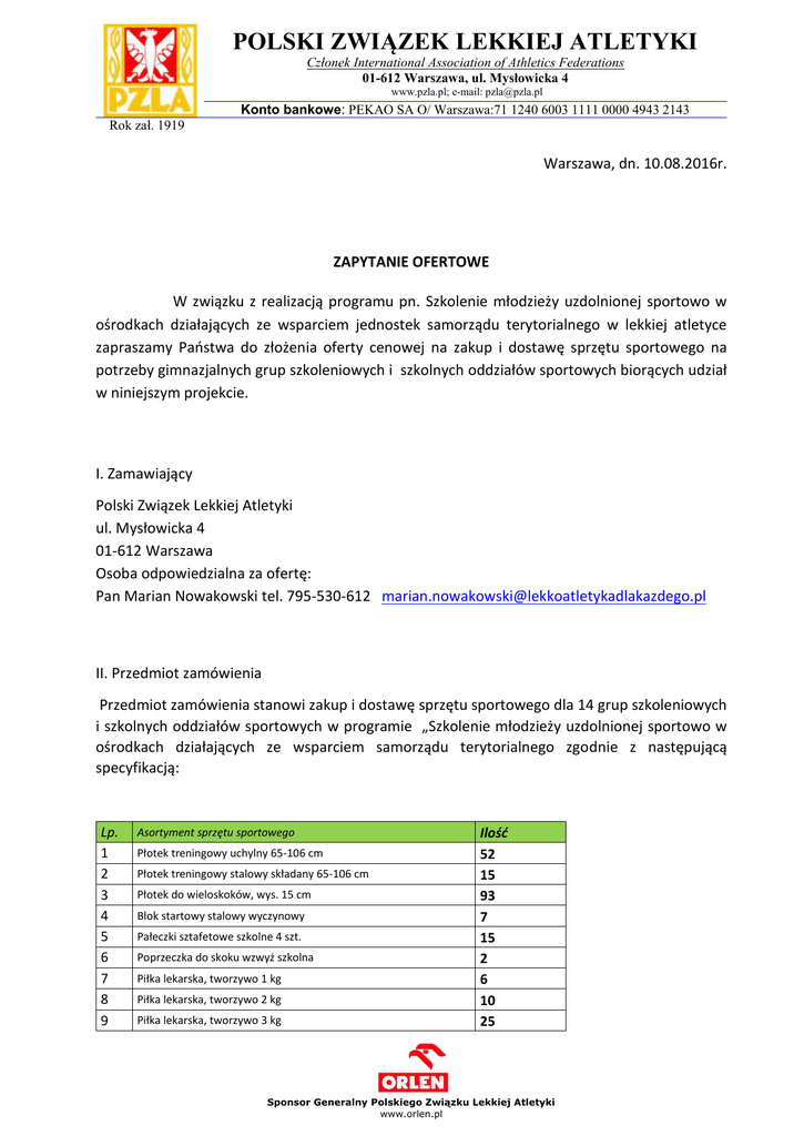 POLSKI ZWIĄZEK LEKKIEJ ATLETYKI Członek International Association of Athletics Federations 01-612 Warszawa, ul. Mysłowicka 4 www.pzla.pl; e-mail: [email protected] Konto bankowe: PEKAO SA O/ Warszawa:71 1240 6003 1111 0000 4943 2143 Rok zał. 1919 Warszawa, dn. 10.08.2016r. ZAPYTANIE OFERTOWE W związku z realizacją programu pn. Szkolenie młodzieży uzdolnionej sportowo w ośrodkach działających ze wsparciem jednostek samorządu terytorialnego w lekkiej atletyce zapraszamy Państwa do złożenia oferty cenowej na zakup i dostawę sprzętu sportowego na potrzeby gimnazjalnych grup szkoleniowych i szkolnych oddziałów sportowych biorących udział w niniejszym projekcie. I. Zamawiający Polski Związek Lekkiej Atletyki ul. Mysłowicka 4 01-612 Warszawa Osoba odpowiedzialna za ofertę: Pan Marian Nowakowski tel. 795-530-612 [email protected] II. Przedmiot zamówienia Przedmiot zamówienia stanowi zakup i dostawę sprzętu sportowego dla 14 grup szkoleniowych i szkolnych oddziałów sportowych w programie „Szkolenie młodzieży uzdolnionej sportowo w ośrodkach działających ze wsparciem samorządu terytorialnego zgodnie z następującą specyfikacją: Lp. 1 2 3 4 5 6 7 8 9 Asortyment sprzętu sportowego Płotek treningowy uchylny 65-106 cm Płotek treningowy stalowy składany 65-106 cm Płotek do wieloskoków, wys. 15 cm Blok startowy stalowy wyczynowy Pałeczki sztafetowe szkolne 4 szt. Poprzeczka do skoku wzwyż szkolna Piłka lekarska, tworzywo 1 kg Piłka lekarska, tworzywo 2 kg Piłka lekarska, tworzywo 3 kg Ilość 52 15 93 7 15 2 6 10 25 Sponsor Generalny Polskiego Związku Lekkiej Atletyki www.orlen.pl POLSKI ZWIĄZEK LEKKIEJ ATLETYKI Członek International Association of Athletics Federations 01-612 Warszawa, ul. Mysłowicka 4 www.pzla.pl; e-mail: [email protected] Konto bankowe: PEKAO SA O/ Warszawa:71 1240 6003 1111 0000 4943 2143 Rok zał. 1919 10 11 12 13 14 15 16 17 18 19 20 21 22 23 24 25 26 27 28 29 30 31 32 33 34 35 36 37 38 39 40 41 42 43 44 45 46 47 48 49 Piłka lekarska, gumowa 4 kg Piłka lekarska, gumowa 5 kg Piłka lekarska, gumowa 6 kg Kula treningowa stalowa 3 kg Kula treningowa stalowa 4 kg Kula treningowa stalowa 5 kg Kula gumowa TRIAL super miękka 3 kg Kula gumowa TRIAL super miękka 5 kg Kula treningowa z tworzywa 2 kg Kula treningowa z tworzywa 3 kg Kula treningowa z tworzywa 4 kg Kula treningowa z tworzywa 5 kg Oszczep szkolny 500 g z grotem gumowym Oszczep treningowy 500 g Oszczep treningowy 600 g Air Flyer oszczep wyczynowy 500 g Piłeczka oszczepnicza 400g z twardego PWC Piłeczka oszczepnicza 600g z twardego PWC Dysk TRIAL super miękki 1 kg Dysk treningowy plastikowy 1,75 kg Dysk wyczynowy plastikowy 0,75 kg z pierścieniem stalowym Dysk wyczynowy plastikowy 1 kg Dysk wyczynowy plastikowy 1,75 kg Młot treningowy stalowy 2 kg Młot treningowy stalowy 3 kg Cięgło do młota 970 mm Poprzeczka do skoku wzwyż wyczynowa Poprzeczka do skoku wzwyż treningowa Drabinka do treningu sprawnościowego, dł. 9 m Sanki treningowe Spadochron do treningu biegowego Uprząż treningowa z holem elastycznym Kamizelka z obciążeniem do 9kg Mata gimnastyczna dwustronna 2 x 1 x 0,1 [m] Taśma miernicza z włókna szklanego 10 m, w kasecie Taśma miernicza z włókna szklanego 20 m, w kasecie Taśma miernicza z włókna szklanego 30 m, w kasecie Taśma miernicza z włókna szklanego 100 m, z uchwytem Zegarek sportowy z pulsometrem Stoper z pamięcią 100 wyników Ilość asortymentu sprzętu sportowego 7 9 2 5 4 2 1 1 3 8 3 4 3 6 3 2 6 6 2 3 1 1 1 2 2 3 3 1 9 8 10 9 5 7 2 2 4 4 21 7 49 Sponsor Generalny Polskiego Związku Lekkiej Atletyki www.orlen.pl POLSKI ZWIĄZEK LEKKIEJ ATLETYKI Członek International Association of Athletics Federations 01-612 Warszawa, ul. Mysłowicka 4 www.pzla.pl; e-mail: [email protected] Konto bankowe: PEKAO SA O/ Warszawa:71 1240 6003 1111 0000 4943 2143 Rok zał. 1919 III. Termin realizacji zamówienia Termin realizacji zamówienia: 30 dni od dnia podpisania umowy. IV. Kryteria wyboru oferty: Oferty będą oceniane w oparciu o następujące kryteria: 1. Cena brutto – waga 75 punktów 2. Doświadczenie oferenta w realizacji podobnych projektów – waga 5 punktów 3. Jakość usługi / produktów - waga 10 punktów 4. Czas realizacji zamówienia – waga 10 punktów V. Wymagania stawiane wykonawcom Wykonawca musi spełniać następujące warunki: Do ofert należy dołączyć ogólne informacje o firmie wraz z kopiami wszelkich wymaganych zezwoleń na prowadzenie tego typu działalności oraz minimum 2 referencji z wykonanych projektów. O udzielenie zamówienia mogą się ubiegać wykonawcy, którzy spełniają następujące warunki: 1. posiadają uprawnienia do wykonywania określonej działalności lub czynności, jeżeli przepisy prawa nakładają obowiązek posiadania takich uprawnień, 2. posiadają niezbędną wiedzę i doświadczenie 3. dysponują potencjałem technicznym i zasobami zdolnymi do wykonania zamówienia, 4. znajdują się w sytuacji ekonomicznej i finansowej zapewniającej wykonanie zamówienia. V. a. Wykaz oświadczeń, dokumentów i informacji jakie mają dostarczyć Wykonawcy Ocena spełniania w/w warunków dokonana zostanie w oparciu o informacje zawarte w dokumentach i oświadczeniach złożonych przez Wykonawcę. Z treści załączonych dokumentów musi wynikać jednoznacznie, iż w/w warunki Wykonawca spełnił. Wykonawca zobowiązany jest złożyć oświadczenie o spełnianiu warunków udziału w postępowaniu i niepodleganiu Sponsor Generalny Polskiego Związku Lekkiej Atletyki www.orlen.pl POLSKI ZWIĄZEK LEKKIEJ ATLETYKI Członek International Association of Athletics Federations 01-612 Warszawa, ul. Mysłowicka 4 www.pzla.pl; e-mail: [email protected] Konto bankowe: PEKAO SA O/ Warszawa:71 1240 6003 1111 0000 4943 2143 Rok zał. 1919 wykluczeniu z postępowania, o treści zgodnej ze wzorem stanowiącym Załącznik nr 2 do niniejszego zapytania ofertowego, a także niżej wymienione dokumenty: 1) wypeł