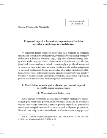Ius Matrimoniale 26 (2015) nr 4 Dorota Urbanowska-Wójcińska Przymus i bojaźń w kanonicznym prawie małżeńskim a groźba w polskim prawie rodzinnym W ostatnich latach wolność człowieka stale wzrasta ze względu na zmiany stosunków społecznych, zwłaszcza w relacjach pomiędzy rodzicami a dziećmi. Pomimo tego, sądy kościelne rozpatrują relatywnie wiele przypadków o nieważność małżeństwa z tytułu bojaźni1, także ustawodawca świecki uznaje wpływ groźby skierowanej w stosunku do nupturienta za wadę oświadczenia woli o wstąpieniu w związek małżeński. Mając na uwadze charakter niniejszej publikacji, w pierwszej kolejności zostaną przedstawione wybrane aspekty bojaźni w kanonicznym prawie małżeńskim, a następnie w polskim prawie rodzinnym celem końcowego ich zestawienia. 1. Małżeństwo zawarte pod wpływem przymusu i bojaźni w świetle prawa kanonicznego 1.1. Wprowadzenie historyczne Już w prawie rzymskim dostrzegano problem małżeństw zawieranych pod wpływem przymusu moralnego, uważano je jednak za ważne. Instytucja rozwodu, znana w prawie rzymskim, pozwalała rozwiązać związek małżeński zawarty pod wpływem przymusu. Kościół nauczając o nierozerwalności małżeństwa nie mógł przejąć 1 Zob. K. Lüdicke, Przymus i bojaźń w kan. 1087 KPK z 1917 r. i w kan. 1103 KPK z 1983r., Ius Matrimoniale 1 (6-7) 1996, s. 29. – 53 – Dorota Urbanowska-Wójcińska rozwiązań wypracowanych na gruncie prawa rzymskiego. Prawodawca kościelny uznaje za konieczne otoczenie ochroną prawną wolności decyzji o wyrażeniu zgody małżeńskiej i bronił nupturientów przed nadużyciami, jakie miały miejsce zarówno na terenie imperium jak i ludów germańskich2. Świadczą o tym synody z późniejszych czasów, które wielokrotnie ponawiają upomnienia i nakazy przeciwko tym, którzy zmuszali do małżeństwa dziewice, wdowy, a nawet osoby poświęcone Bogu3. Papież Urban II nie zakazuje osobie, która zawarła małżeństwo pod przymusem, zawrzeć nowego małżeństwa, powołując się na doktrynę i dawne prawa i kanony4. Zarówno Gracjan jak i Aleksander III dokładnie opisują przymus jako rozrywającą przeszkodę małżeńską. Późniejsi kanoniści byli zgodni co do rozrywającego charakteru wpływu bojaźni i przymusu na kanoniczne małżeństwo. KPK1917 w kan. 1087 § 1 stanowił: „Nieważne jest również małżeństwo zawarte z przymusu lub ciężkiej, zewnętrznej i niesprawiedliwie wywołanej bojaźni, od której żeby ktoś mógł się uwolnić, zmuszony jest wybrać małżeństwo”, zaś § 2 tego kanonu: „żadna inna bojaźń, choćby nawet stała się przyczyną umowy, nie unieważnia małżeństwa5. Także Sobór Watykański II zwrócił uwagę na wielkie znaczenie wolności w konstytucji Gaudium et spes6. 2 Zob. M. Żurowski, Kanoniczne prawo małżeńskie okresu posoborowego, Katowice 1976, s. 274. 3 Tamże, s. 274. 4 Tamże, s. 274. 5 KPK 17, can. 1087 § 1: “Invalidum quoque est matrimonium initum ob vim vel metum gravem ab extrinseco et iniuste incussum, a quo ut quis se liberet, eligere cogatur matrimonium”. § 2: “Nullus alius metus, etiamsi det causam contractui, matrimonii nullitatem secumfert”. 6 Sobór Watykański II, Konstytucja Gaudium et spes, nr 17. – 54 – Przymus i bojaźń w kanonicznym prawie małżeńskim… 1.2. Małżeństwo zawarte pod wpływem przymusu i bojaźni w świetle kan. 1103 KPK 83 w porównaniu do kan. 1087 § 1 KPK 17 W wyniku prac nad nową redakcją regulacji dotyczącej omawianej wady kanonicznej zgody małżeńskiej, powstał kan. 1103 KPK 83, który stanowi: „Nieważne jest małżeństwo zawarte pod przymusem lub pod wpływem ciężkiej bojaźni z zewnątrz, nawet nieumyślnie wywołanej, od którego żeby się uwolnić zmuszony jest ktoś wybrać małżeństwo”. Kanon ten jest przejawem chęci zagwarantowania nupturientom wolności kwalifikowanej. Kan. 1103 KPK 83 stanowi bowiem lex specialis w stosunku do kan. 125 § 2 KPK 83, który przewiduje nieważność aktu dokonanego pod wpływem ciężkiej i niesprawiedliwej bojaźni, chyba że prawo co innego zastrzega. Zwykły akt prawny może być w określonych warunkach (zgodnie z kan. 125 § 2 KPK 83), unieważniony, jeśli udowodni się, że został podjęty pod wpływem ciężkiej i niesprawiedliwej bojaźni. Oczywiście małżeństwo zawarte pod wpływem przymusu fizycznego byłoby nieważne na podstawie kan. 125 § 1 KPK 83. Małżeństwo nie może być jednak unieważnione, stąd potrzeba odrębnej regulacji. Ratio legis wskazanej regulacji jest konieczność ochrony wolności przymuszonego nupturienta, tak aby nie pozostał związany uciążliwym dla niego dozgonnym węzłem, który przymuszony zaakceptował7. W kan. 1103 KPK 83 mówi się o dwóch zjawiskach: przymusie i bojaźni. Przymus moralny to presja, nacisk wewnętrzny lub zewnętrzny, wywierający wpływ na wolę działającego. Jednym z rodzajów przymusu moralnego jest szantaż, który polega na wywieraniu presji na kogoś i wymuszaniu czegoś za pomocą zastraszenia lub groźby kompromitacji8. Przymusowi moralnemu często towarzyszą strach, lęk, bojaźń. Strach różni się zasadniczo od lęku i bojaźni. Strach jest 7 Zob. W. Góralski, Kanoniczna zgoda małżeńska (kanony: 1095-1107), Gdańsk 1991, s. 213. 8 Szantaż, w: Słownik języka polskiego, www.pwn.pl – 55 – Dorota Urbanowska-Wójcińska pewnym stanem niepokoju wywołanym przez niebezpieczeństwo lub rzecz nieznaną, która wydaje się groźna, a także przez myśl o czymś grożącym9. Lękiem nazywamy uczucie obawy przed złem grożącym, obawę, niepokój. To samo znaczenie ma bojaźń10. Bojaźń powoduje więc pewne zamieszanie, wstrząs duchowy, ze względu na aktualne lub w przyszłości grożące zło. Z racji stopnia dzieli się bojaźń na ciężką lub lekką, w zależności od stopnia wspomnianego wstrząsu duchowego. Bojaźń jest bezwzględnie wielka gdy potrafi przer