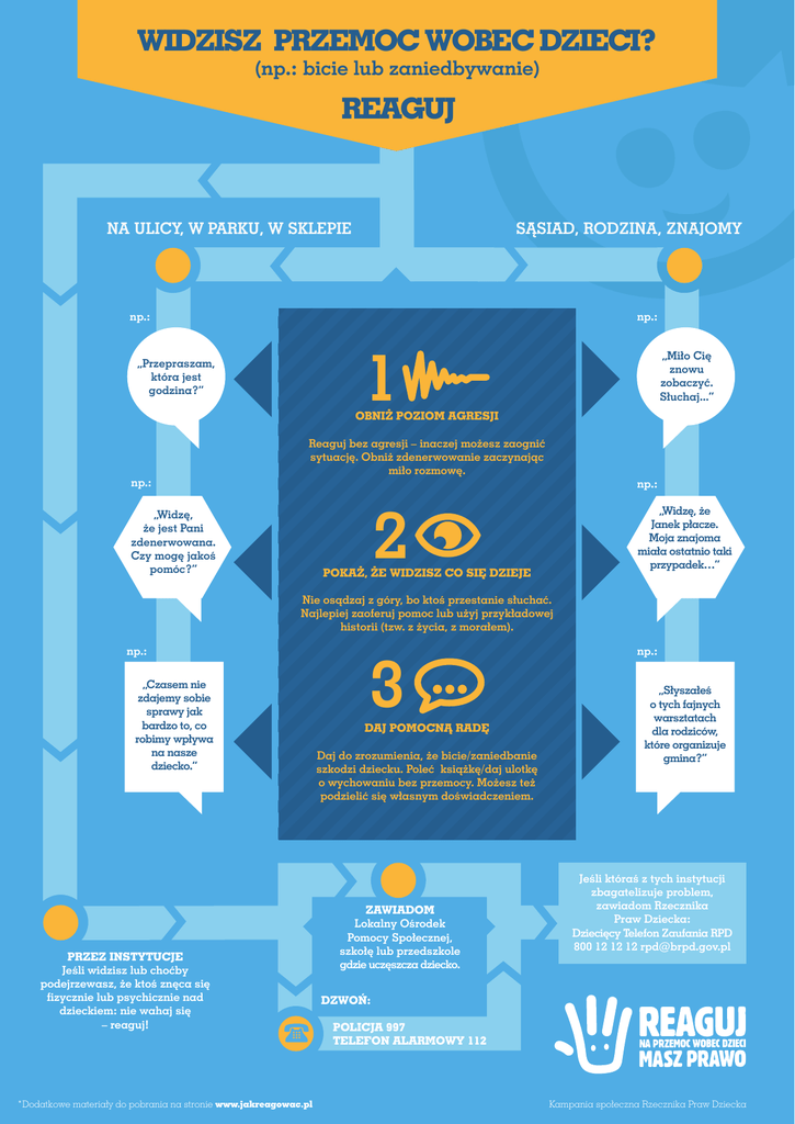WIDZISZ PRZEMOC WOBEC DZIECI? (np.: bicie lub zaniedbywanie) REAGUJ NA ULICY, W PARKU, W SKLEPIE SĄSIAD, RODZINA, ZNAJOMY np.: np.: 1 „Przepraszam, która jest godzina?” „Miło Cię znowu zobaczyć. Słuchaj...” OBNIŻ POZIOM AGRESJI np.: Reaguj bez agresji – inaczej możesz zaognić sytuację. Obniż zdenerwowanie zaczynając miło rozmowę. np.: 2 „Widzę, że jest Pani zdenerwowana. Czy mogę jakoś pomóc?” „Widzę, że Janek płacze. Moja znajoma miała ostatnio taki przypadek…” POKAŻ, ŻE WIDZISZ CO SIĘ DZIEJE Nie osądzaj z góry, bo ktoś przestanie słuchać. Najlepiej zaoferuj pomoc lub użyj przykładowej historii (tzw. z życia, z morałem). np.: „Czasem nie zdajemy sobie sprawy jak bardzo to, co robimy wpływa na nasze dziecko.” PRZEZ INSTYTUCJE Jeśli widzisz lub choćby podejrzewasz, że ktoś znęca się fizycznie lub psychicznie nad dzieckiem: nie wahaj się – reaguj! *Dodatkowe materiały do pobrania na stronie www.jakreagowac.pl 3 DAJ POMOCNĄ RADĘ Daj do zrozumienia, że bicie/zaniedbanie szkodzi dziecku. Poleć książkę/daj ulotkę o wychowaniu bez przemocy. Możesz też podzielić się własnym doświadczeniem. ZAWIADOM Lokalny Ośrodek Pomocy Społecznej, szkołę lub przedszkole gdzie uczęszcza dziecko. np.: „Słyszałeś o tych fajnych warsztatach dla rodziców, które organizuje gmina?” Jeśli któraś z tych instytucji zbagatelizuje problem, zawiadom Rzecznika Praw Dziecka: Dziecięcy Telefon Zaufania RPD 800 12 12 12 [email protected] DZWOŃ: POLICJA 997 TELEFON ALARMOWY 112 Kampania społeczna Rzecznika Praw Dziecka