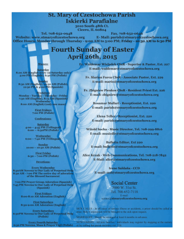 St. Mary of Czestochowa Parish Iskierki Parafialne 3010 South 48th Ct. Cicero, IL 60804 Tel. 708-652-0948 Fax. 708-652-0646 Website: www.stmaryofczestochowa.org E- Mail: [email protected] Office Hours: Monday through Thursday - 9:00 AM to 5:00 PM; Friday - 10:30 AM to 6:30 PM Fourth Sunday of Easter April 26th, 2015 Masses: Saturday 8.00 AM (English every 1st Saturday only) 5:00 PM (English), 6:30 PM (Polish) Sunday 8:30 AM (English), 10:30 AM (Polish), 12:30 PM & 4:00 PM (Spanish) Weekdays Monday - Tuesday - Thursday - Friday 7:30 AM (English), 8:15 AM (Spanish) Wednesday 8:00 AM (English) (only one mass) First Fridays 7:00 PM (Polish) Confessions: Saturday 4:00 – 4:45 PM (Trilingual) 6:00 — 6:30PM (Polish) Wednesday 6:00 – 7:40 PM (Trilingual) Sunday 10:00 – 10:30 AM (Polish) First Friday 6:30 – 7:00 PM (Polish) Devotions: Fr. Waldemar Wieladek CSsR - Superior & Pastor, Ext. 227 E-mail: [email protected] Fr. Marian Furca CSsR - Associate Pastor, Ext. 229 E-mail: [email protected] Fr. Zbigniew Pienkos CSsR - Resident Priest Ext. 226 E-mail: [email protected] Rosamar Mallari - Receptionist, Ext. 220 E-mail: [email protected] Elena Tellez - Receptionist, Ext. 220 E-mail: [email protected] Witold Socha - Music Director, Tel. 708-299-8816 E-mail: [email protected] Bulletin Editor, Ext 220 E-mail: [email protected] Alice Krzak - Web Communications, Tel. 708-218-7842 E-Mail: [email protected] Every Wednesday 8:30AM Novena to Our Lady of Perpetual Help 8:30 AM - 7:00 PM The entire day of adoration of the Blessed Sacrament Irene Saldaña - CCD E-mail: [email protected] 7:00 PM Prayer Group-Adoration (Spanish) 7:45 PM Novena to Our Lady of Perpetual Help (Spanish) Social Center First Fridays 8:00-8:10 AM Adoration (English) 5000 W. 31st St. Tel. 708-652-7118 E-mail: [email protected] First Saturdays 8:30-9:00 AM Adoration (English) Every Saturdays 6:30PM Novena to Our Lady of Perpetual Help (Polish) Every Fourth Saturday 6:30 PM Novena, Mass & Prayer Vigil (Polish) SICK CALLS - In all cases of serious illness or accidents, a priest should be called at once. Holy Communion will be brought to the sick upon request. MARRIAGES - Should be arranged at least 6 months in advance. NEWCOMERS - All new families / individuals may register by stopping at the rectory or by calling the parish secretary ext. 220. Sunday Iskierki Parafialne April 26, Fourth Sunday of Easter 8:30 †Mike and Anne Vavrek (family) †Michael R. Vavrek (family) 10:30 O Boże bł. dla Emilia Najda z okazji 3-ch urodzin i Paweł Najda z okazji urodzin (Rodzina Najda) O zdrowie, Boże bł. i opiekę Matki Bożej Częstochowskiej dla Rozalia Gutierrez O Boże bł., zdrowie i opiekę Matki Bożej Częstochowskiej dla syna (Mama) O zdrowie, Boże bł. i opiekę Matki Bożej Częstochowskiej dla córki (Rodzice) O zdrowie i Boże bł. dla Elżbiety i Roberta Chowaniec w 15 rocz. ślubu (Rodzice) O zdrowie, Boże bł. i opiekę Matki Bożej Częstochowskiej na dalsze lata życia dla Czesława Gil z okazji urodzin (Żona, Dzieci i Wnuki) †Aniela Rozalia Gancarczyk (mąż z synami) †Victoria Cwiok (Kathy Kowalska) †Mirosław Jurczyk w 30 dni od śmieci w Polsce †Maria i Tadeusz Słodyczka †Maria i Józef Jandura †Stanisław i Aniela Tylka w rocz. śm. (Siostra) †Stanisława Dworkowska †Zbigniew Dworkowski †Jan Gut †Antonina Węgrzyn 12:30 En acción de gracias en los 18 años deUriel Preciado (familia) Por la salud y pronta recuperacion de Rodolfo Alvarado (familia) †Sigifredo y Alfredo Gonzalez (familia) †Gavina Montiel, eterno descanso en su 5° aniversario (hijos y nietos) 4:00 †Rosalina Rodriguez, 4° aniversario luctuoso (familia) April 27, Monday, Easter Weekday 7:30 †Olga Vanis (Ceil Kandl) 8:15 Por los feligreses 7PM Special blessing for the students receiving the Sacrament of Confirmation April 28, Tuesday, Saint Peter Chanel, Priest and Martyr; Saint Louis Grignion de Montfort, Priest 7:30 Birthday wishes for Anna Byrnas (F. Balla) 8:15 †Holy Souls April 29, Wednesday, Saint Catherine of Siena, Virgin and Doctor of the Church 8 :00 †Antoinette Andelbrat (family) 8:30 Eucharistic Adoration until 7PM 7PM El Circulo de Oración 7:45 Novena a Nuestra Señora del Perpetuo Socorro April 30, Thursday, Easter Weekday 7:30 †Holy Souls in purgatory 8:15 †Por las almas inscritas en el libro de la memoria May 01, First Friday, Saint Joseph the Worker 7:30 †Holy Souls in Purgatory 8:15 Por los feligreses 7PM Polish Mass May 02, First Saturday, Saint Athanasius, Bishop and Doctor of the Church 8:00 First Saturday Mass 10:00 Special blessing for the students receiving First Holy Communion 5 PM †For the soul and spirit of Lucille Lippe †Julie Sosinski, birthday memorial (Joanne Sosinski) †John Stenson (Sophie Walkowiak) 6:30 W intencjach próśb i podziękowań do M. B. Nieustającej Pomocy Lector Schedule Saturday, May 2 5pm Sharon Wisnieski-Wente Sunday, May 3 8:30 Michele Cison-Carlson 10:30 Danuta Landt, Jarek Szyszlak 12:30 Hugo Arellano, Roberto Pasillas, Linda Ramirez 4:00 Rene Aviña, Mary Rodriguez, Rosalina Martinez Eucharistic Minister Saturday, May 2 5:00 PM Jean Yunker, Frances Balla 6:30 PM Adam Orszulak Sunday, May 3 8:30 Christine Zaragoza, Ann Twomey Maria C. Castañeda 10:30 Krzysztof Odbierzychleb, Jan Rozanski Jan Radomyski 12:30 Marisol Ortiz, Olivia Ortiz Javier Hernandez, Juana Salas 4:00 Martin Martinez, Anastacia Gonzalez Humberto Tellez Eternal rest……………… †Angeline Kowalski †Henry Chrusciel May God Who called you, take you home! St. Mary of Czestochowa Sunday Collection, April 19, 2015 Many thanks to those of you who have contributed to St. Mary of Czestochowa’s collection this past week. Your gifts are essential to our ministry, and we are grateful. Apr. 18 Apr. 19 5:00PM $845.00 6:30PM $203.00 8:30AM $1,541.30 10:30AM $1,273.00 12:30PM $1,295.00 4:00PM $860.00 TOTAL $6,017.30 “ ”It is better to take refuge in t he Lord than to trust in man. It i