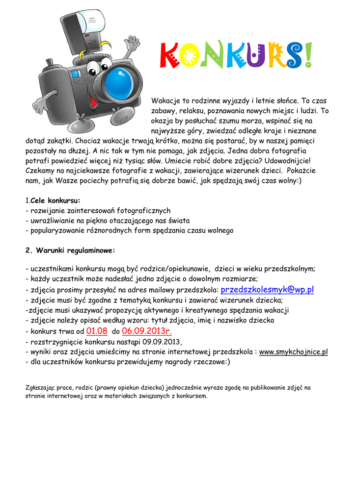KONKURS! Wakacje to rodzinne wyjazdy i letnie słońce. To czas zabawy, relaksu, poznawania nowych miejsc i ludzi. To okazja by posłuchać szumu morza, wspinać się na najwyższe góry, zwiedzać odległe kraje i nieznane dotąd zakątki. Chociaż wakacje trwają krótko, można się postarać, by w naszej pamięci pozostały na dłużej. A nic tak w tym nie pomaga, jak zdjęcia. Jedna dobra fotografia potrafi powiedzieć więcej niż tysiąc słów. Umiecie robić dobre zdjęcia? Udowodnijcie! Czekamy na najciekawsze fotografie z wakacji, zawierające wizerunek dzieci. Pokażcie nam, jak Wasze pociechy potrafią się dobrze bawić, jak spędzają swój czas wolny:) 1.Cele konkursu: - rozwijanie zainteresowań fotograficznych - uwrażliwianie na piękno otaczającego nas świata - popularyzowanie różnorodnych form spędzania czasu wolnego 2. Warunki regulaminowe: - uczestnikami konkursu mogą być rodzice/opiekunowie, dzieci w wieku przedszkolnym; - każdy uczestnik może nadesłać jedno zdjęcie o dowolnym rozmiarze; - zdjęcia prosimy przesyłać na adres mailowy przedszkola: [email protected] - zdjęcie musi być zgodne z tematyką konkursu i zawierać wizerunek dziecka; -zdjęcie musi ukazywać propozycję aktywnego i kreatywnego spędzania wakacji - zdjęcie należy opisać według wzoru: tytuł zdjęcia, imię i nazwisko dziecka - konkurs trwa od 01.08 do 06.09.2013r. rozstrzygnięcie konkursu nastąpi 09.09.2013, wyniki oraz zdjęcia umieścimy na stronie internetowej przedszkola : www.smykchojnice.pl dla uczestników konkursu przewidujemy nagrody rzeczowe:) Zgłaszając prace, rodzic (prawny opiekun dziecka) jednocześnie wyraża zgodę na publikowanie zdjęć na stronie internetowej oraz w materiałach związanych z konkursem.
