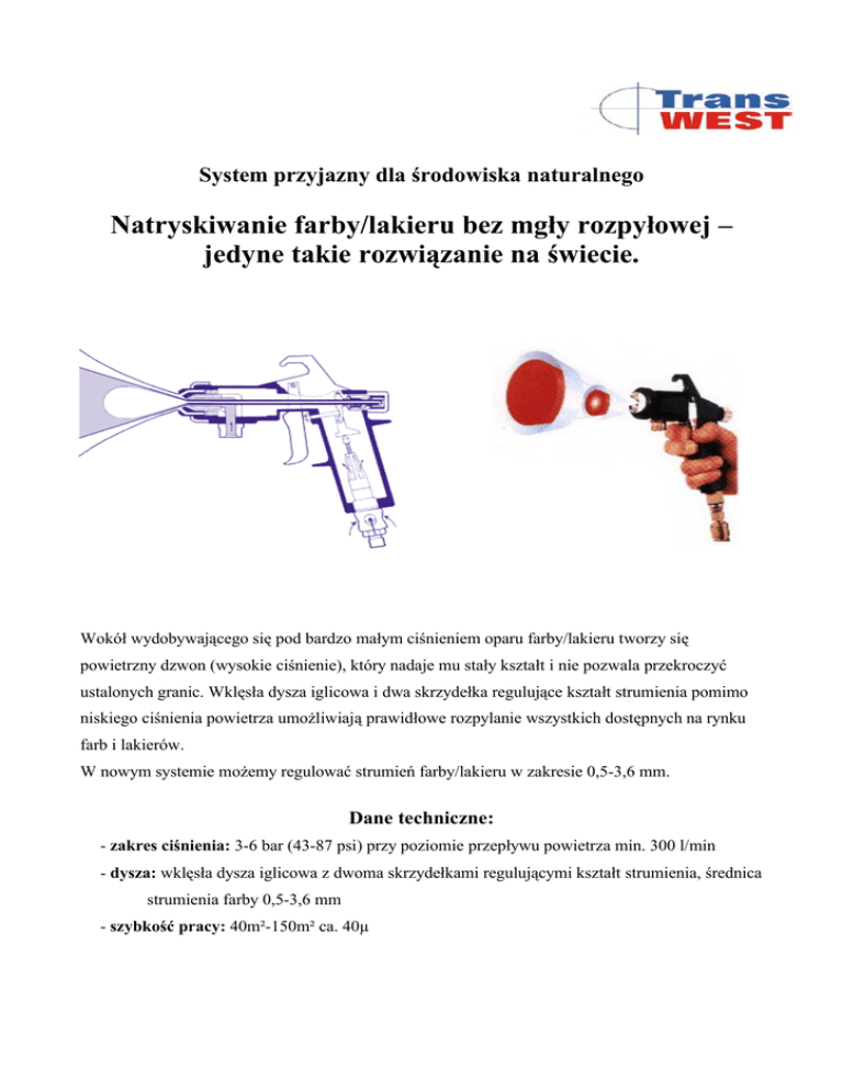 System przyjazny dla środowiska naturalnego Natryskiwanie farby/lakieru bez mgły rozpyłowej – jedyne takie rozwiązanie na świecie. Wokół wydobywającego się pod bardzo małym ciśnieniem oparu farby/lakieru tworzy się powietrzny dzwon (wysokie ciśnienie), który nadaje mu stały kształt i nie pozwala przekroczyć ustalonych granic. Wklęsła dysza iglicowa i dwa skrzydełka regulujące kształt strumienia pomimo niskiego ciśnienia powietrza umożliwiają prawidłowe rozpylanie wszystkich dostępnych na rynku farb i lakierów. W nowym systemie możemy regulować strumień farby/lakieru w zakresie 0,5-3,6 mm. Dane techniczne: - zakres ciśnienia: 3-6 bar (43-87 psi) przy poziomie przepływu powietrza min. 300 l/min - dysza: wklęsła dysza iglicowa z dwoma skrzydełkami regulującymi kształt strumienia, średnica strumienia farby 0,5-3,6 mm - szybkość pracy: 40m²-150m² ca. 40µ Zalety METACAP: Zlikwidowanie zjawiska rozprysku farby/lakieru podczas nanoszenia jej na powierzchnię pozwala nam zredukować koszty, dzięki mniejszemu zużyciu dowolnego lakieru lub farby od 20 do 50 %. Pracownik obsługujący nie musi przebywać w oparach farby/lakieru i nie ma potrzeby używania maski ochronnej. System jest przyjazny dla środowiska naturalnego. Porównanie działania: System METACAP System Wysokiego Ciśnienia Stosując pistolet METACAP oszczędzamy na ilości farby/lakieru oraz obniżamy koszty oczyszczania. Warianty przyłączenia pojemnika na farbę: METACAP®-pistolet U-2 / A 0,5 l pojemnik od spodu METACAP®-pistolet U-1 / A 1,0 l pojemnik od spodu METACAP®-pistolet O-2 /A 0,5 l pojemnik od góry Do malowania większych powierzchni służy tzw. aparat łączony o pojemności 2 litrów. Czyszczenie: Pozostałą po malowaniu farbę/lakier odprowadzamy do specjalnego pojemnika. Podłączamy pistolet do dopasowanego do pistoletu otworu i wypryskujemy przez niego resztę farby/lakieru. Dzięki temu możemy pozostałą farbę/lakier użyć ponownie. Przykładowe zastosowania: Malowanie elementów pojazdów Malowanie elementów ozdobnych Trans-West GmbH Sp. z o.o. tel./fax +48 61 285-26-63 63-000 Środa Wlkp Malowanie pomieszczeń ul. Prądzyńskiego 20 tel. +48 61 287-02-64 [email protected] www.transwest.pl