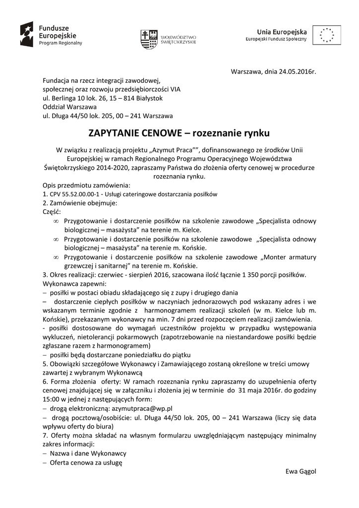 Warszawa, dnia 24.05.2016r. Fundacja na rzecz integracji zawodowej, społecznej oraz rozwoju przedsiębiorczości VIA ul. Berlinga 10 lok. 26, 15 – 814 Białystok Oddział Warszawa ul. Długa 44/50 lok. 205, 00 – 241 Warszawa ZAPYTANIE CENOWE – rozeznanie rynku W związku z realizacją projektu „Azymut Praca””, dofinansowanego ze środków Unii Europejskiej w ramach Regionalnego Programu Operacyjnego Województwa Świętokrzyskiego 2014-2020, zapraszamy Państwa do złożenia oferty cenowej w procedurze rozeznania rynku. Opis przedmiotu zamówienia: 1. CPV 55.52.00.00-1 - Usługi cateringowe dostarczania posiłków 2. Zamówienie obejmuje: Część: • Przygotowanie i dostarczenie posiłków na szkolenie zawodowe „Specjalista odnowy biologicznej – masażysta” na terenie m. Kielce. • Przygotowanie i dostarczenie posiłków na szkolenie zawodowe „Specjalista odnowy biologicznej – masażysta” na terenie m. Końskie. • Przygotowanie i dostarczenie posiłków na szkolenie zawodowe „Monter armatury grzewczej i sanitarnej” na terenie m. Końskie. 3. Okres realizacji: czerwiec - sierpień 2016, szacowana ilość łącznie 1 350 porcji posiłków. Wykonawca zapewni: − posiłki w postaci obiadu składającego się z zupy i drugiego dania – dostarczenie ciepłych posiłków w naczyniach jednorazowych pod wskazany adres i we wskazanym terminie zgodnie z harmonogramem realizacji szkoleń (w m. Kielce lub m. Końskie), przekazanym wykonawcy na min. 7 dni przed rozpoczęciem realizacji zamówienia. - posiłki dostosowane do wymagań uczestników projektu w przypadku występowania wykluczeń, nietolerancji pokarmowych (zapotrzebowanie na niestandardowe posiłki będzie zgłaszane razem z harmonogramem) − posiłki będą dostarczane poniedziałku do piątku 5. Obowiązki szczegółowe Wykonawcy i Zamawiającego zostaną określone w treści umowy zawartej z wybranym Wykonawcą 6. Forma złożenia oferty: W ramach rozeznania rynku zapraszamy do uzupełnienia oferty cenowej znajdującej się w załączniku i złożenia jej w terminie do 31 maja 2016r. do godziny 15:00 w jednej z następujących form: − drogą elektroniczną: [email protected] − drogą pocztową/osobiście: ul. Długa 44/50 lok. 205, 00 – 241 Warszawa (liczy się data wpływu oferty do biura) 7. Oferty można składać na własnym formularzu uwzględniającym następujący minimalny zakres informacji: − Nazwa i dane Wykonawcy − Oferta cenowa za usługę Ewa Gągol ..................................................... pieczęć Oferta cenowa dot. Wynajem sali szkoleniowej na doradztwo zawodowe w ramach projektu „Azymut Praca” dofinansowanego ze środków Unii Europejskiej w ramach Regionalnego Programu Operacyjnego Województwa Świętokrzyskiego 2014-2020: L.p. Wymagane informacje: 1. Nazwa Wykonawcy: 2. Adres pocztowy Wykonawcy: 3. Nr telefonu: 4. Nr faksu: 5. Adres e-mail: 6. REGON: 7. NIP: Informacje podane przez Wykonawcę: Oferujemy wykonanie usługi: a) Przygotowanie i dostarczenie posiłków na szkolenie zawodowe „Specjalista odnowy biologicznej – masażysta” na terenie Kielc. Cena za 1 posiłek (zupa, drugie danie)brutto:................................................................... zł Słownie złotych (brutto): ......................................................................................... b) Przygotowanie i dostarczenie posiłków na szkolenie zawodowe „Specjalista odnowy biologicznej – masażysta” na terenie m. Końskie. Cena za 1 posiłek (zupa, drugie danie)brutto:................................................................... zł Słownie złotych (brutto): ......................................................................................... c) Przygotowanie i dostarczenie posiłków na szkolenie zawodowe „Monter armatury grzewczej i sanitarnej” na terenie m. Końskie. Cena za 1 posiłek (zupa, drugie danie)brutto:................................................................... zł Słownie złotych (brutto): ......................................................................................... .......................................................................... Osoba wypełniająca ofertę (imię i nazwisko, podpis, data)