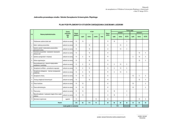 Załącznik do zarządzenia nr 19 Rektora Uniwersytetu Śląskiego w Katowicach z dnia 25 lutego 2014 r. Jednostka prowadząca studia: Szkoła Zarządzania Uniwersytetu Śląskiego PLAN PODYPLOMOWYCH STUDIÓW ZARZĄDZANIA ZASOBAMI LUDZKIMI L.p. Nazwa przedmiotu/modułu Forma zajęć w tym Forma zaliczenia: Egz/ Zal Razem godziny wykł. ćwicz. semin. inne Razem ECTS 3 wykł. ćwicz. semestr II ECTS 1 Podstawowe zadania działu kadr zalicznie na ocenę 15 2 Dobór i selekcja pracowników zalicznie na ocenę 15 15 3 15 3 zalicznie na ocenę 15 15 3 15 3 zalicznie na ocenę 15 15 4 10 5 10 3 3 4 Systemy szkoleń i doskonalenia pracowników planowanie kariery Ocenianie pracowników - budowanie i stosowanie arkuszy ocen 15 semestr I 5 15 wykł. ćwicz. ECTS 15 4 10 5 10 3 5 5 15 4 3 5 Systemy wynagrodzeń i motywacji zalicznie na ocenę 15 5 6 Kultura organizacyjna zalicznie na ocenę 10 7 Koumunikowanie się - stosunki międzyludzkie współpraca i rywalizacja zalicznie na ocenę 15 5 10 5 5 10 5 8 Zarządzanie konfliktem - prowadzenie negocjacji zalicznie na ocenę 15 5 10 5 5 10 5 9 Zarządzanie strategiczne - twórcze rozwiązywanie problemów zalicznie na ocenę 15 5 10 5 5 10 5 10 Zarządzanie zmianą zalicznie na ocenę 15 10 5 5 11 Trening umiejętności kierowniczych zalicznie na ocenę 15 15 4 12 Prawo handlowe zalicznie na ocenę 10 10 2 10 2 13 Prawo administracyjne zalicznie na ocenę 10 10 2 10 2 14 Prawo pracy 10 zalicznie na ocenę 10 10 3 10 3 Stosunki publiczne - budowanie image'u firmy i public 15 zalicznie na ocenę relations 10 10 3 10 3 16 Seminarium dyplomowe 10 egzamin Razem: 210 Liczba godzin w semestrze 85 115 10 5 10 60 50 60 110 ………………………………………………………… (podpis i pieczęć Kierownika studiów podyplomowych) 30 35 10 5 65 30 100 ………………………… (podpis i pieczęć Kierownika