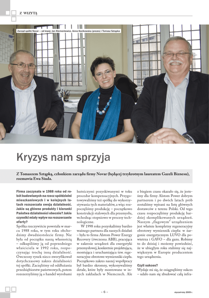 fot. E. Siuda z wizytą Zarząd spółki Novar – od lewej: Jan Klementowicz, Anna Kocikowska (prezes) i Tomasz Sztąpka Kryzys nam sprzyja Z Tomaszem Sztąpką, członkiem zarządu firmy Novar (będącej trzykrotnym laureatem Gazeli Biznesu), rozmawia Ewa Siuda. Firma zaczynała w 1988 roku od robót budowlanych na rzecz spółdzielni mieszkaniowych i w kolejnych latach rozszerzała swoją działalność. Jakie są główne produkty i kierunki Państwa działalności obecnie? Jakie czynniki miały wpływ na rozszerzanie oferty? Spółka rzeczywiście powstała w marcu 1988 roku, w tym roku obchodzimy dwudziestolecie firmy. Nie była od początku naszą własnością – odkupiliśmy ją od poprzedniego właściciela w 1992 roku, rozpoczynając trochę inną działalność. Ówczesny rynek nieco zweryfikował dotychczasowy zakres działalności tej spółki. Zaczęliśmy od oddłużania przedsiębiorstw państwowych, potem rozszerzyliśmy ją o handel wyrobami hutniczymi pozyskiwanymi w toku procedur kompensacyjnych. Przygotowywaliśmy też spółkę do wykorzystywania tych materiałów, a więc rozpoczęliśmy produkcję – początkowo konstrukcji stalowych dla przemysłu, wchodząc stopniowo w procesy technologiczne. W 1998 roku pozyskaliśmy bardzo ważnego partnera dla naszych działań – była to firma Alstom Power Energy Recovery (ówczesna ABB), pracująca w zakresie urządzeń dla energetyki przemysłowej, konkretnie projektująca, montująca i uruchamiająca tzw. regeneracyjne obrotowe wymienniki ciepła. Początkowo zakres naszej współpracy był bardzo skromny, wykonywaliśmy detale, które były montowane w innych zakładach w Niemczech. Ale –6– z biegiem czasu okazało się, że jesteśmy dla firmy Alstom Power dobrym partnerem i po dwóch latach prób zostaliśmy wpisani na listę głównych dostawców z terenu Polski. Od tego czasu rozpoczęliśmy produkcję bardziej skomplikowanych urządzeń. Naszym „flagowym” urządzeniem jest właśnie kompletny regeneracyjny obrotowy wymiennik ciepła: w żargonie energetycznym LUVO dla powietrza i GAVO – dla gazu. Robimy to do dzisiaj i możemy powiedzieć, że w ubiegłym roku staliśmy się największym w Europie producentem tego urządzenia. Czyli sukces? Wydaje mi się, że osiągnęliśmy sukces – udało nam się zbudować całą infra- styczeń-luty 2009 r. z wizytą strukturę techniczno-inżyniersko-organizacyjno-materiałową dla produkcji bardzo skomplikowanych urządzeń na rynek przemysłowy, ale równocześnie takich, które są stosowane w wielu zakładach na całym świecie. Czy myślą Państwo o kolejnym rozszerzeniu oferty produkcyjnej? W perspektywie najbliższych pięciu lat chcielibyśmy, po pierwsze, doposażyć firmę w maszyny, które pozwoliłyby produkować nasze urządzenia w łatwiejszy i bardziej precyzyjny sposób. Po drugie, chcielibyśmy uruchomić takie procesy, które do tej pory należą do naszych podwykonawców. Dotyczy to przede wszystkim całego zespołu zabezpieczenia antykorozyjnego, dla którego nie mamy na razie warunków na terenie naszego zakładu. W perspektywie dziesięciu lat chcielibyśmy zbudować „drugą nogę” – nie wiemy jeszcze, w jakim kierunku, ale chcielibyśmy wykorzystać cały dorobek techniczny, inżynierski, który w tej chwili prezentujemy i który z roku na rok się doskonali – są to przede wszystkim procesy spawalnicze oraz montażowe urządzeń i maszyn. W poprzednim numerze „Stali” rozmawialiśmy z przedstawicielami polskich firm działających w branży konstrukcji stalowych. Jak Pan ocenia ten rynek w Polsce? W jakiego typu konstrukcjach specjalizuje się Novar? Szeroko rozumiany rynek konstrukcji stalowych w Polsce jest rynkiem bardzo kapr yśnym. Koniunktura na tego typu konstrukcje jest zmienna, i to w stosunkowo krótkich okresach. Można podzielić ten rynek na konstrukcje typu budowlanego i konstrukcje maszynowe. Novar chyba nie jest przygotowany do tego, by produkować konstrukcje budowlane, natomiast bardzo dobrze sobie radzimy z konstrukcjami technologicznymi, a więc takimi, które zawierają elementy maszyn i urządzeń, wymagają wysokiej precyzji, obróbki skrawaniem, obróbki termicznej, są konstrukcjami o wyższym stopniu przetworzenia. W tym czujemy się znacznie lepiej i w tym widzimy swoją przyszłość. Wydaje nam się również, że ten rynek jest bardziej stabilny i nie podlega tak wielkim wahaniom jak rynek inwestycyjny w zakresie konstrukcji budowlanych. Jakich gatunków stali używają Państwo w produkcji dla energetyki? Jakie cechy przemawiają za ich zastosowaniem? W sumie używamy dwóch podstawowych gatunków: zwykłego S235 (dawny St3S) oraz odpornego na korozję gatunku Corten. Zyskuje on wielu zwolenników ze względu na bardzo dobre cechy wytrzymałościowe i ponadczterokrotnie wyższą odporność na korozję. Wszędzie tam, gdzie występuje zagrożenie warunkami klimatycznymi, używa się właśnie tych gatunków stali (np. w konstrukcjach mostowych oraz konstrukcjach pracujących w atmosferze agresywnej), gdyż ich odporność na korozję jest wieloletnia, a zmiana własności ze względu na wpływ warunków klimatycznych jest tutaj bardzo istotna. reklama Metale & Nowe Technologie –7– fot. NOVAR z wizytą Budowa wirnika obrotowego wymiennika ciepła Linia technologiczna do produkcji koszy grzewczych Produkcja obudowy rotora Magazyn koszy grzewczych Gdzie znajdują zastosowanie obrotowe regeneracyjne wymienniki ciepła LUVO i GAVO? Gdzie w Polsce i na świecie pracują podgrzewacze wyprodukowane przez Państwa firmę? Te urządzenia mają zastosowanie we wszystkich zakładach produkujących ciepło – od bardzo małych elektrowni miejskich, zakładowych po potężne koncerny energetyczne. Spełniają one swoją rolę w odzyskiwaniu ciepła ze spalin, w związku z tym są zgodne z dyrektywą europejską mówiącą o tym, by nie wypuszczać zbędnego ciepła do atmosfery, a równocześnie w zasad
