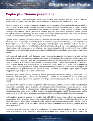Popko.pl - Ciemna przemiana Jej podlega każdy człowiek spadający z duchowej drabiny, tak z własnej woli, jak i z woli i poprzez działania sił ciemności. Wszyscy sekciarze jej podlegają w większym lub mniejszym stopniu. Ciemna przemiana to proces przemiany energetyczno-duchowej struktury człowieka, podczas której cała duchowa istota ludzka zostaje wypisana z energii jedynej i przeniesiona w rewiry energii przeciwnej, przez co raz na zawsze zostają zerwane wszelkie więzy z przestrzeniami duchowymi, które stworzyły ludzkie ciało i duszę. Jeśli dusza zostanie wypisana z Archiwum Zrodzenia, nawet Stwórca nie będzie w stanie odzyskać jej dla tego świata. Nie dlatego, że nie dysponuje taką mocą, ale dlatego, że sam nie może zaprzeczać Prawu, na którym całość zbudował. Ogólnie proces ciemnej przemiany dotyczy czterech parametrów: wzorców energetycznych, które decydują o stanie fizycznym materialnego ciała (zdrowiu), szyfrów świadomości, , oraz dotyczy ciała duchowego i ponadduchowego. Degradacja tych poszczególnych części decyduje o stanie zapisów w Archiwum, miejscu, gdzie powstał ludzki duch. Tak jak każdy człowiek ma swoją szpitalną metrykę, tak i duch ludzki jest wyposażony w zapis łączący go z całością duchowych przestrzeni. Z tym wszakże założeniem, że zapis ten stale się zmienia, odzwierciedlając aktualny duchowo-energetyczny stan istoty ludzkiej. Jeśli człowiek staje się zły, jeśli duchowe zasady tego świata mu nie odpowiadają, wtedy z wolna zatraca się w znieprawieniu i powolutku przemienia swoją energetykę, dopasowując ją do wibracji, jakie tworzą siły ciemności. Gdy proces przemiany się zamknie, albo osiągnie poziom całkowitego rozbicia zapisów w Archiwum, dusza i duch zaczynają podlegać prawom tamtego świata. Po śmierci taki człowiek zostaje albo wykorzystany do ataków na innych ludzi, albo rozbity na protoplazmę (karmę), albo po dalszej obróbce, zwanej kodowaniem (nowych wartości), zasila armię przeklętych lub jest bezpośrednio przenoszony do świata Morrra. Niemniej w każdym z tych wymienionych przypadków jego los jest nie do pozazdroszczenia. Pół biedy, gdy proces ciemnej przemiany zdołał tylko częściowo rozbić zapisy w Archiwum. Taki człowiek po śmierci przechodzi proces czyszczenia i wznosi się na powrót do świata astralnego, czekając na kolejne zejście w te wymiary, by w tyglu karmicznym naprawić to, co w swej postawie stracił. Jeśli całkowite rozbicie zapisów nie przekroczyło zielonej linii (18%), dusza ludzka bez zbędnych formalności przechodzi wprost do naszej astralnej poczekalni. Proces ten jest nieco zawieszony i może trwać jakiś czas, w którym odrzucane jest niskowibracyjne ciało eteryczne. Takich problemów nie ma człowiek czystego serca, który z ciałem eterycznym stanowi integralną całość. On, zespolony z ciałem eterycznym, w całości mknie na zasłużony odpoczynek i nie przechodzi pośmiertnego zamroczenia. Jeśli rozbicie zapisów sięgnie niebieskiej linii (18-28%), mamy niewątpliwie do czynienia z człowiekiem, który przejdzie proces oczyszczania się (czyściec). Gdy wartość rozbicia ustalimy na 28-40% (czerwona linia), dusza takiego osobnika trafia do specjalnie przygotowanych światów, gdzie w toku wypalania emocji może on utknąć na bardzo długo. Niemniej i on zostaje odzyskany poprzez swoje nawrócenie. Los ludzi, których rozbicie zapisów w Archiwum sięgnęło czarnej kreski (od 41%) jest nie do pozazdroszczenia i prócz ogólnego wprowadzenia lepiej tego tematu nie poruszać. Nawet na Strona: 1/3 http://www.popko.pl/ciemna,przemiana.xhtml [2017-03-04 00:53:34] warsztatach staram się swoje wywody ograniczać do minimum, bo sam termin piekło rodzi wiele kontrowersji, zwłaszcza u tych, którym do piekła blisko. Na skali ciemnej przemiany widać zasadniczo cztery obszary, które mówią o łamaniu człowieka. Biała kreska jest tu standardem i mówi tylko tyle, że powstało zagrożenie. Dopiero kolejny zielony obszar, sklasyfikowany jako człowiek sam może ten proces cofnąć, daje znać, iż powinna się rozpocząć walka o duchowe przetrwanie. Uwięzienie w ciele to już poważna sprawa, ale przy pomocy kogoś życzliwego, kto poda pomocną dłoń i wytrwa w tym postanowieniu, wyjście z kryzysu jest możliwe. Jednak realia świadczą o czymś zupełnie innym. A to dlatego, że modyfikowany człowiek w niczym nie przypomina siebie dawnego, potrafi być nerwowy, napastliwy, niewdzięczny, fałszywy, totalnie zagubiony i egoistyczny, skutecznie do pomocy wszystkich zniechęcający. Jeśli na dodatek ma uwalone wzorce energetyczne i myślenie, to z kimś takim na dłuższą metę nikt nie wytrzyma. Trzeba nadludzkiej cierpliwości i wytrwałości, by w kimś takim wzbudzić nadzieję zmian na lepsze, by przypomnieć mu o świetle, by w jego imieniu walczyć z ciemnymi siłami. Bez konkretnej wiedzy na ten temat i tak wysiłek wszelkich pomocników pójdzie na marne. Gdy dusza ludzka zostaje uwięziona poza ciałem, nie tylko żaden karmiczny człowiek nie jest tu w stanie nic wskórać, ale i Opiekun musi bezradnie rozłożyć ręce. Tylko siła archanioła jest w stanie wyrwać takiego człowieka z duchowego otępienia. Ale któż z was potrafi wejść z nim w układy? Przy czarnej kresce praktycznie nie ma szansy na uratowanie duszy. W bardzo rzadkich przypadkach może się powieść interwencja Sił Wyższych, ale znów pojawia się pytanie, gdzie znaleźć odpowiednie do kontaktu z Nimi osoby, by zadziałało prawo łaski? Po przekroczeniu czarnej kreski (55%) jest po człowieku. Pewna dygresja. Ponieważ jestem najniższym fundamentem budowli, która otwiera bramy dla odzyskanych, ponieważ potrafię wchodzić już w przestrzenie kilku stwórców, czasem gdy Góra na to zezwoli, zwracam ludziom ich zapisy albo wyprowadzam z ciemności dusze, które były już stracone. Wyposażono mnie bowiem w moc, która 