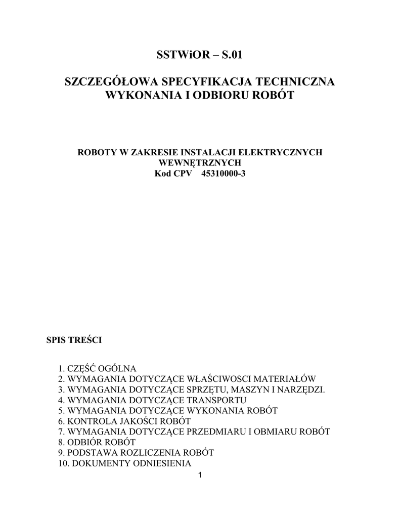 SSTWiOR – S.01 SZCZEGÓŁOWA SPECYFIKACJA TECHNICZNA WYKONANIA I ODBIORU ROBÓT ROBOTY W ZAKRESIE INSTALACJI ELEKTRYCZNYCH WEWNĘTRZNYCH Kod CPV 45310000-3 SPIS TREŚCI 1. CZĘŚĆ OGÓLNA 2. WYMAGANIA DOTYCZĄCE WŁAŚCIWOSCI MATERIAŁÓW 3. WYMAGANIA DOTYCZĄCE SPRZĘTU, MASZYN I NARZĘDZI. 4. WYMAGANIA DOTYCZĄCE TRANSPORTU 5. WYMAGANIA DOTYCZĄCE WYKONANIA ROBÓT 6. KONTROLA JAKOŚCI ROBÓT 7. WYMAGANIA DOTYCZĄCE PRZEDMIARU I OBMIARU ROBÓT 8. ODBIÓR ROBÓT 9. PODSTAWA ROZLICZENIA ROBÓT 10. DOKUMENTY ODNIESIENIA 1 1. CZĘŚĆ OGÓLNA 1.1. Nazwa nadana zamówieniu przez zamawiającego Przedmiotem niniejszej szczegółowej specyfikacji technicznej są wymagania dotyczące wykonania i odbioru robót w zakresie instalacji elektrycznych wewnętrznych, prowadzonych w ramach projektu: "Remont oraz dostosowanie instalacji elektrycznej do obowiązujących przepisów dla Sali Operacyjnej oraz Sali OIOM w Zakładzie Karnym nr 2, z siedzibą przy ulicy Kraszewskiego 1/5, 93-161 Łódź." 1.2. Przedmiot ST Przedmiotem niniejszej specyfikacji technicznej (SST) są wymagania dotyczące wykonania i odbioru robót związanych z układaniem i montażem elementów instalacji elektrycznej (układanie kabli i przewodów, montaż osprzętu i opraw) w obiektach kubaturowych oraz obiektach budownictwa inżynieryjnego. 1.3. Zakres stosowania ST Specyfikacja techniczna szczegółowa (SST), stosowanej jest jako dokument przetargowy i kontraktowy przy zlecaniu i realizacji robót wymienionych w pkt. 1.2. Projektant sporządzający dokumentację projektową i odpowiednie szczegółowe specyfikacje techniczne wykonania i odbioru robót budowlanych może wprowadzać do niniejszej standardowej specyfikacji zmiany, uzupełnienia lub uściślenia, odpowiednie dla przewidzianych projektem robót, uwzględniające wymagania Zamawiającego oraz konkretne warunki realizacji robót, niezbędne do uzyskania wymaganego standardu i jakości tych robót. Odstępstwa od wymagań podanych w niniejszej specyfikacji mogą mieć miejsce tylko w przypadkach prostych robót o niewielkim znaczeniu, dla których istnieje pewność, że podstawowe wymagania będą spełnione przy zastosowaniu metod wykonania wynikających z doświadczenia oraz uznanych reguł i zasad sztuki budowlanej. 1.4. Przedmiot i zakres robót objętych ST Ustalenia zawarte w niniejszej specyfikacji technicznej (SST) dotyczą zasad wykonywania i odbioru robót związanych z: układaniem kabli i przewodów elektrycznych, w tym szynoprzewodów montowanych poza rozdzielnicami, montażem opraw, osprzętu, urządzeń i odbiorników energii elektrycznej, wraz z przygotowaniem podłoża i robotami towarzyszącymi, dla obiektów kubaturowych oraz obiektów budownictwa inżynieryjnego. ST dotyczy wszystkich czynności mających na celu wykonanie robót związanych z: kompletacja wszystkich materiałów potrzebnych do wykonania podanych wyżej prac, wykonaniem wszelkich robót pomocniczych w celu przygotowania podłoża (w szczególności roboty murarskie, ślusarsko-spawalnicze montaż elementów osprzętu instalacyjnego itp.), ułożeniem wszystkich materiałów w sposób i w miejscu zgodnym z dokumentacją techniczną, wykonaniem oznakowania zgodnego z dokumentacją techniczną wszystkich elementów wyznaczonych w dokumentacji, ułożeniem drutu stalowego (dla instalacji prowadzonych w rurkach lub kanałach zamkniętych), ułatwiającego docelowe wciąganie zaprojektowanych przewodów (np. dla sieci teleinformatycznych), wykonaniem oznakowania zgodnego z dokumentacja techniczna wszystkich wyznaczonych kabli i przewodów, 2 - przeprowadzeniem wymaganych prób i badań oraz potwierdzenie protokołami kwalifikującymi montowany element instalacji elektrycznej. 1.5. Określenia podstawowe, definicje Określenia podane w niniejszej specyfikacji technicznej (ST) są zgodne z odpowiednimi normami oraz określeniami podanymi w ST „Wymagania ogólne” Kod CPV 45000000-7, pkt 1.4. a także podanymi poniżej: Specyfikacja techniczna – dokument zawierający zespół cech wymaganych dla procesu wytwarzania lub dla samego wyrobu, w zakresie parametrów technicznych, jakości, wymogów bezpieczeństwa, wielkości charakterystycznych a także co do nazewnictwa, symboliki, znaków i sposobów oznaczania, metod badań i prób oraz odbiorów i rozliczeń. Aprobata techniczna – dokument stwierdzający przydatność dane wyrobu do określonego obszaru zastosowania. Zawiera ustalenia techniczne co do wymagań podstawowych wyrobu oraz metodykę badań dla potwierdzenia tych wymagań. Deklaracja zgodności – dokument w formie oświadczenia wydany przez producenta, stwierdzający zgodność z kryteriami określonymi odpowiednimi aktami prawnymi, normami, przepisami, wymogami lub specyfikacją techniczną dla danego materiału lub wyrobu. Certyfikat zgodności – dokument wydany przez upoważnioną jednostkę badającą (certyfikującą), stwierdzający zgodność z kryteriami określonymi odpowiednimi aktami prawnymi, normami, przepisami, wymogami lub specyfikacją techniczną dla badanego materiału lub wyrobu. Część czynna – przewód lub inny element przewodzący, wchodzący w skład instalacji elektrycznej lub urządzenia, który w warunkach normalnej pracy instalacji elektrycznej może być pod napięciem a nie spełnia funkcji przewodu ochronnego (przewody ochronne PE i PEN nie są częścią czynną). Połączenia wyrównawcze – elektryczne połączenie części przewodzących dostępnych lub obcych w celu wyrównania potencjału. Kable i przewody – materiały służące do dostarczania energii elektrycznej, sygnałów, impulsów elektrycznych w wybrane miejsce. Osprzęt instalacyjny do kabli i przewodów – zespół materiałów dodatkowych, stosowanych przy układaniu przewodów, ułatwiający ich montaż oraz dotarcie w przypadku awarii, zabezpieczający przed uszkodzeniami, wytyczający trasy ciągów równoległych przewodów itp. Grupy materiałów stanowią