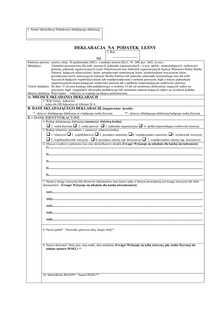 1. Numer Identyfikacji Podatkowej składającego deklarację ................................................................ DEKLARACJA NA PODATEK LEŚNY 2. Rok na ...................... Podstawa prawna: ustawa z dnia 30 października 2002 r. o podatku leśnym (Dz.U. Nr 200, poz. 1682, ze zm.). Składający: Formularz przeznaczony dla osób prawnych, jednostek organizacyjnych , w tym spółek, nieposiadających osobowości prawnej, jednostek organizacyjnych Lasów Państwowych oraz Jednostek organizacyjnych Agencji Własności Rolnej Skarbu Państwa będących właścicielami lasów, posiadaczami samoistnymi lasów, użytkownikami wieczystymi lasów, posiadaczami lasów stanowiących własność Skarbu Państwa lub jednostki samorządu terytorialnego oraz dla osób fizycznych będących współwłaścicielami lub współposiadaczami z osobami prawnymi, bądź z innymi jednostkami organizacyjnymi nieposiadającymi osobowości prawnej lub z spółkami nieposiadającymi osobowości prawnej. Termin składania: Do dnia 15 stycznia każdego roku podatkowego; w terminie 14 dni od zaistnienia okoliczności mających wpływ na powstanie, bądź wygaśnięcie obowiązku podatkowego lub zaistnienia zdarzeń mających wpływ na wysokość podatku. Miejsce składania: Wójt Gminy właściwy ze względu na miejsce położenia lasu. A. MIEJSCE SKŁADANIA DEKLARACJI 3. Wójt Gminy Jejkowice Adres 44-290 Jejkowice ul. Główna 38 A B. DANE SKŁADAJĄCEGO DEKLARACJĘ (niepotrzebne * - dotyczy składającego deklarację ni e będącego osobą fizyczną skreślić) ** - dotyczy składającego deklarację będącego osobą fizyczną B.1 DANE IDENTYFIKACYJNE 4. Rodzaj składającego deklarację (zaznaczyć właściwą kratkę)  1. osoba fizyczna  2. osoba prawna  3. jednostka organizacyjna  4. spółka nieposiadająca osobowości prawnej 5. Rodzaj własności, posiadania ( zaznaczyć właściwą kratkę)  1. właściciel  2. współwłaściciel  3. posiadacz samoistny 4. współposiadacz samoistny 5. użytkownik wieczysty  5. współużytkownik wieczysty  6. posiadacz zależny (np. dzierżawca)  7. współposiadasz zależny (np. dzierżawca) 6. Miejsce/a (adres/y) położenia lasu oraz identyfikator/y działek (Uwaga! Wykazuje się odrębnie dla każdej nieruchomości) 1)......................................................................................................................................................................................................... 2)......................................................................................................................................................................................................... 3)......................................................................................................................................................................................................... 4)......................................................................................................................................................................................................... 5)......................................................................................................................................................................................................... 7. Numer/y księgi wieczystej lub zbioru/ów dokumentów oraz nazwa sądu, w którym prowadzona jest księga wieczysta lub zbiór dokumentów (Uwaga! Wykazuje się odrębnie dla każdej nieruchomości) Ad1).................................................................................................................................................................................................... Ad2).................................................................................................................................................................................................... Ad3).................................................................................................................................................................................................... Ad4).................................................................................................................................................................................................... Ad5).................................................................................................................................................................................................... 8. Nazwa pełna* / Nazwisko, pierwsze imię, drugie imię** 9. Nazwa skrócona* /Imię ojca, imię matki, data urodzenia (Uwaga! Wykazuje się tylko wówczas, gdy osobie fizycznej nie nadano numeru PESEL) ** 10. Identyfikator REGON* / Numer PESEL** B.2 ADRES SIEDZIBY* / ADRES ZAMIESZKANIA** 11. Kraj 12. Województwo 13. Powiat 14. Gmina 15. Ulica 16. Nr domu/Nr lokalu 17. Miejscowość 18. Kod pocztowy 19. Poczta C. OKOLICZNOŚCI POWODUJĄCE KONIECZNOŚĆ ZŁOŻENIA DEKLARACJI 20. Okoliczności (zaznaczyć właściwą kratkę)  1. deklaracja roczna  2. korekta deklaracji rocznej D. DANE DOTYCZĄCE PRZEDMIOTÓW OPODATKOWANIA (Uwaga! Wykazujemy z dokładnością do 1 m kw. tj. do czwartego miejsca po przecinku) D.1 Z WYJĄTKIEM ZWOLNIONYCH Wyszczególnienie Powierzchnia w hektarach fizycznych Stawka podatku (0,220 m3 drewna x cena drewna) w zł, gr 2 3 1 Podatek w zł, gr (rubr. 2 x rubr.3) 4 1. Lasy ochronne 2. Lasy wchodzące w skład rezerwatów przyrody i parków narodowych 3. Lasy pozostałe (nie wymienione w w. 1 i 2) 4. Razem (w. 1–3)*** ( zaokrąglić do pełnych złotych ) E. INFORMACJA O PRZEDMIOTACH ZWOLNIONYCH (podać powierzchnię zwolnionego lasu oraz przepis prawa - z jakiego tytułu występuje zwolnienie) F. OŚWIADCZENIE I PODPIS SKŁADAJĄCEGO / OSOBY REPREZENTUJĄCEJ SKŁADAJĄCEGO Oświadczam, że podane przeze mnie dane są zgodne z prawdą. 21. Imię 23. Data wypełnienia (dzień - miesiąc - rok) 22. Nazwisko 24. Podpis (pieczęć) skła