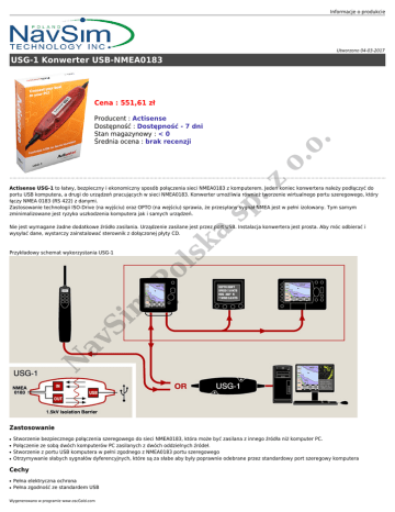 Informacje o produkcie Utworzono 04-03-2017 USG-1 Konwerter USB-NMEA0183 Cena : 551,61 zł .z o. o. Producent : Actisense Dostępność : Dostępność - 7 dni Stan magazynowy : < 0 Średnia ocena : brak recenzji sp Actisense USG-1 to łatwy, bezpieczny i ekonomiczny sposób połączenia sieci NMEA0183 z komputerem. Jeden koniec konwertera należy podłączyć do portu USB komputera, a drugi do urządzeń pracujących w sieci NMEA0183. Konwerter umożliwia również tworzenie wirtualnego portu szeregowego, który łączy NMEA 0183 (RS 422) z danymi. Zastosowanie technologii ISO-Drive (na wyjściu) oraz OPTO (na wejściu) sprawia, że przesyłany sygnał NMEA jest w pełni izolowany. Tym samym zminimalizowane jest ryzyko uszkodzenia komputera jak i samych urządzeń. ka Nie jest wymagane żadne dodatkowe źródło zasilania. Urządzenie zasilane jest przez port USB. Instalacja konwertera jest prosta. Aby móc odbierać i wysyłać dane, wystarczy zainstalować sterownik z dołączonej płyty CD. N av Si m Po ls Przykładowy schemat wykorzystania USG-1 Zastosowanie ● ● ● ● Stworzenie bezpiecznego połączenia szeregowego do sieci NMEA0183, która może być zasilana z innego źródła niż komputer PC. Połączenie ze sobą dwóch komputerów PC zasilanych z dwóch oddzielnych źródeł. Stworzenie z portu USB komputera w pełni zgodnego z NMEA0183 portu szeregowego Otrzymywanie słabych sygnałów dyferencyjnych, które są za słabe aby były poprawnie odebrane przez standardowy port szeregowy komputera Cechy ● ● Pełna elektryczna ochrona Pełna zgodność ze standardem USB Wygenerowano w programie www.oscGold.com ● ● Możliwość podłączenie zarówno do portu COM komputera jak i do interfejsów morskiej sieci NMEA0183 (NMEA0183/RS422/RS232 Obsługa szybkiego transferu danych (do 115,2kbps) N av Si m Po ls ka sp .z o. o. Projektowanie i montaż sieci NMEA NavSim świadczy także profesjonalne usługi projektowania i montażu rozbudowanych sieci NMEA0183 i NMEA2000. W razie pytań prosimy o kontakt.