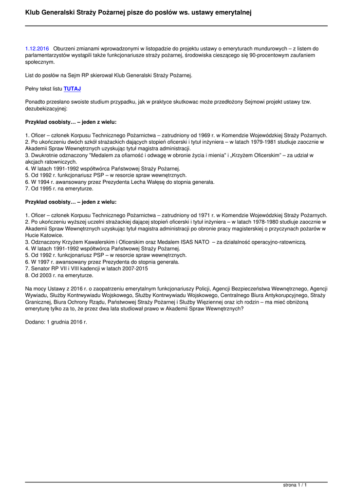 Klub Generalski Straży Pożarnej pisze do posłów ws. ustawy emerytalnej 1.12.2016 Oburzeni zmianami wprowadzonymi w listopadzie do projektu ustawy o emeryturach mundurowych – z listem do parlamentarzystów wystąpili także funkcjonariusze straży pożarnej, środowiska cieszącego się 90-procentowym zaufaniem społecznym. List do posłów na Sejm RP skierował Klub Generalski Straży Pożarnej. Pełny tekst listu TUTAJ Ponadto przesłano swoiste studium przypadku, jak w praktyce skutkowac może przedłożony Sejmowi projekt ustawy tzw. dezubekizacyjnej: Przykład osobisty… – jeden z wielu: 1. Oficer – członek Korpusu Technicznego Pożarnictwa – zatrudniony od 1969 r. w Komendzie Wojewódzkiej Straży Pożarnych. 2. Po ukończeniu dwóch szkół strażackich dających stopień oficerski i tytuł inżyniera – w latach 1979-1981 studiuje zaocznie w Akademii Spraw Wewnętrznych uzyskując tytuł magistra administracji. 3. Dwukrotnie odznaczony "Medalem za ofiarność i odwagę w obronie życia i mienia" i „Krzyżem Oficerskim” – za udział w akcjach ratowniczych. 4. W latach 1991-1992 współtwórca Państwowej Straży Pożarnej. 5. Od 1992 r. funkcjonariusz PSP – w resorcie spraw wewnętrznych. 6. W 1994 r. awansowany przez Prezydenta Lecha Wałęsę do stopnia generała. 7. Od 1995 r. na emeryturze. Przykład osobisty… – jeden z wielu: 1. Oficer – członek Korpusu Technicznego Pożarnictwa – zatrudniony od 1971 r. w Komendzie Wojewódzkiej Straży Pożarnych. 2. Po ukończeniu wyższej uczelni strażackiej dającej stopień oficerski i tytuł inżyniera – w latach 1978-1980 studiuje zaocznie w Akademii Spraw Wewnętrznych uzyskując tytuł magistra administracji po obronie pracy magisterskiej o przyczynach pożarów w Hucie Katowice. 3. Odznaczony Krzyżem Kawalerskim i Oficerskim oraz Medalem ISAS NATO – za działalność operacyjno-ratowniczą. 4. W latach 1991-1992 współtwórca Państwowej Straży Pożarnej. 5. Od 1992 r. funkcjonariusz PSP – w resorcie spraw wewnętrznych. 6. W 1997 r. awansowany przez Prezydenta do stopnia generała. 7. Senator RP VII i VIII kadencji w latach 2007-2015 8. Od 2003 r. na emeryturze. Na mocy Ustawy z 2016 r. o zaopatrzeniu emerytalnym funkcjonariuszy Policji, Agencji Bezpieczeństwa Wewnętrznego, Agencji Wywiadu, Służby Kontrwywiadu Wojskowego, Służby Kontrwywiadu Wojskowego, Centralnego Biura Antykorupcyjnego, Straży Granicznej, Biura Ochrony Rządu, Państwowej Straży Pożarnej i Służby Więziennej oraz ich rodzin – ma mieć obniżoną emeryturę tylko za to, że przez dwa lata studiował prawo w Akademii Spraw Wewnętrznych? Dodano: 1 grudnia 2016 r. strona 1 / 1
