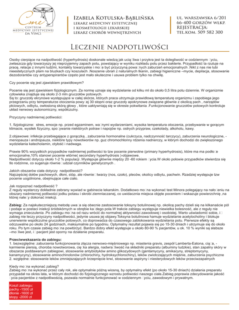 Osoby cierpiące na nadpotliwość (hyperhydrosis) doskonale wiedzą jak uciążliwa i przykra jest ta dolegliwość w codziennym życiu, zwłaszcza gdy towarzyszy jej nieprzyjemny zapach potu, powstający w wyniku rozkładu potu przez bakterie. Przypadłość ta rzutuje na pracę, relacje z innymi ludźmi, kontakty towarzyskie i może być przyczyną poważnych zaburzeń emocjonalnych .Nikt z nas nie lubi nieestetycznych plam na bluzkach czy koszulach .Noszenie ubrań z naturalnych tkanin, zabiegi higieniczne –mycie, depilacja, stosowanie dezodorantów czy antyperspirantów często jest mało skuteczne i usuwa problem tylko na chwilę. Czy pocenie się jest zjawiskiem prawidłowym? Pocenie się jest zjawiskiem fizjologicznym. Za normę uznaje się wydzielanie od kilku ml do około 0,5 litra potu dziennie. W organizmie człowieka znajduje się około 2-3 mln gruczołów potowych. Są to: gruczoły ekrynowe występujące w całej skórze, których praca utrzymuje prawidłową temperaturę organizmu i zapobiega jego przegrzaniu przy temperaturze otoczenia powyżej 30 stopni oraz gruczoły apokrynowe związane głównie z okolicą pach , narządów płciowych, odbytu, owłosioną skórą głowy , które uaktywniają się w okresie pokwitania .Funkcjonowanie gruczołów potowych kontroluje układ nerwowy autonomiczny, współczulny. Przyczyny nadmiernej potliwości: 1. fizjologiczne: stres, emocje np. przed egzaminem, ważnymi wydarzeniami, wysoka temperatura otoczenia, przebywanie w gorącym klimacie, wysiłek fizyczny, spożywanie niektórych potraw i napojów np. ostrych przypraw, czekolady, alkoholu, kawy. 2.objawowe: infekcje przebiegające z gorączką , zaburzenia hormonalne (cukrzyca, nadczynność tarczycy), zaburzenia neurologiczne, menopauza i andropauza, niektóre typy nowotworów np. guz chromochłonny rdzenia nadnerczy, w którym dochodzi do zwiększonego wydzielania katecholamin, otyłość i nadwaga. Prawie 90% wszystkich przypadków nadmiernej potliwości to tzw pocenie pierwotne (primary hyperhydrosis), które ma ma podłoże emocjonalne,10% stanowi pocenie wtórne( secondary hyperhydrosis )-objawowe. Nadpotliwość dotyczy około 1-2 % populacji .Występuje głównie między 20 -60 rokiem życia.W około połowie przypadków stwierdza się tło rodzinne, co sugeruje również udział czynników genetycznych . Jakich obszarów ciała dotyczy nadpotliwość? Najczęściej dołów pachowych, dłoni, stóp, ale również twarzy (nos, czoło), pleców, okolicy odbytu, pachwin. Rzadziej występuje tzw pocenie uogólnione, obejmujące całe ciało. Jak rozpoznać nadpotliwość ? Z reguły wystarczy dokładnie zebrany wywiad w gabinecie lekarskim. Dodatkowo można wykonać test Minora polegający na nałożeniu na obszary nadmiernej potliwości jodku potasu i skrobi ziemniaczanej, co uwidacznia miejsca objęte poceniem i wskazuje powierzchnię ,na której należy dokonać iniekcji. Zabieg: Za najskuteczniejszą metodę uważa się obecnie zastosowanie toksyny botulinowej np. okolicę pachy dzieli się na kilkanaście pól i podaje w postaci iniekcji śródskórnych w obrębie każdego pola.W trakcie zabiegu występuje niewielka bolesność, ale z reguły nie wymaga znieczulenia .Po zabiegu można od razu wrócić do normalnej aktywności zawodowej i osobistej. Warto uświadomić sobie, iż zabieg nie leczy przyczyny nadpotliwości, jedynie usuwa jej objawy.Toksyna botulinowa hamuje wydzielanie acetylocholiny i blokuje unerwienie współczulne gruczołów potowych, co doprowadza do czasowego zablokowania wydzielania potu. Pierwsze efekty są odczuwalne po około 24 godzinach, maksymalnie po tygodniu. Optymalny rezultat pojawia się po 15-30 dniach i utrzymuje się do około roku. Po tym czasie zabieg można powtórzyć. Bardzo dobry efekt występuje u około 80-90 % pacjentów, u ok. 10 % wyniki są słabsze –możliwe jest, iż pacjent jest oporny na działanie preparatu. Przeciwwskazania do zabiegu: 1. bezwzględne: zaburzenia funkcjonowania złącza nerwowo-mięśniowego np. miastenia gravis, zespół Lamberta-Eatona, ciąża, karmienie piersią, choroba nowotworowa, ciężka alergia, nadwrażliwość na składniki preparatu (albuminy ludzkie), stan zapalny skóry w obszarze poddawanym zabiegowi, stosowanie antybiotyków amino glikozydowych (gentamycyny, amikacyny, streptomycyny, kanamycyny), stosowanie aminochinolonów (chlorochiny, hydroksychlorochiny), leków zwiotczających mięśnie, zaburzenia psychiczne 2. względne: stosowanie leków zmniejszających krzepnięcie krwi, stosowanie aspiryny i niesterydowych leków przeciwzapalnych Kiedy można wykonać zabieg? Zabieg można wykonać przez cały rok, ale optymalnie późną wiosną, by optymalny efekt (po około 15-30 dniach) działania preparatu przypadał na okres lata, w którym dochodzi do fizjologicznego wzrostu potliwości naszego ciała.Zabieg poprawia zdecydowanie jakość życia pacjentów z nadpotliwością, pozwala normalnie funkcjonować w codziennym życiu, zawodowym i prywatnym. Koszt zabiegu: pachy -1500 zł dłonie -1600 zł stopy -2000 zł