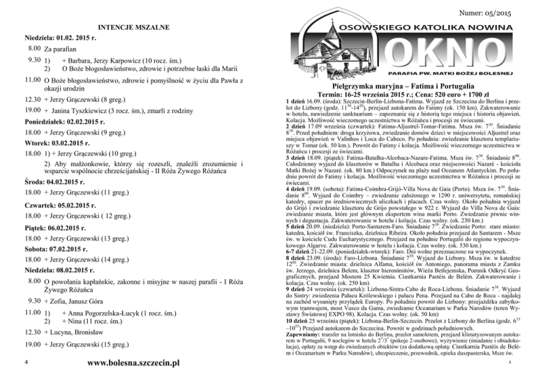 Numer: 05/2015 INTENCJE MSZALNE Niedziela: 01.02. 2015 r. 8.00 Za parafian 9.30 1) 2) + Barbara, Jerzy Karpowicz (10 rocz. śm.) O Boże błogosławieństwo, zdrowie i potrzebne łaski dla Marii 11.00 O Boże błogosławieństwo, zdrowie i pomyślność w życiu dla Pawła z okazji urodzin 12.30 + Jerzy Grączewski (8 greg.) 19.00 + Janina Tyszkiewicz (3 rocz. śm.), zmarli z rodziny Poniedziałek: 02.02.2015 r. 18.00 + Jerzy Grączewski (9 greg.) Wtorek: 03.02.2015 r. 18.00 1) + Jerzy Grączewski (10 greg.) 2) Aby małżonkowie, którzy się rozeszli, znaleźli zrozumienie i wsparcie wspólnocie chrześcijańskiej - II Róża Żywego Różańca Środa: 04.02.2015 r. 18.00 + Jerzy Grączewski (11 greg.) Czwartek: 05.02.2015 r. 18.00 + Jerzy Grączewski ( 12 greg.) Piątek: 06.02.2015 r. 18.00 + Jerzy Grączewski (13 greg.) Sobota: 07.02.2015 r. 18.00 + Jerzy Grączewski (14 greg.) Niedziela: 08.02.2015 r. 8.00 O powołania kapłańskie, zakonne i misyjne w naszej parafii - I Róża Żywego Różańca 9.30 + Zofia, Janusz Góra 11.00 1) 2) + Anna Pogorzelska-Łucyk (1 rocz. śm.) + Nina (11 rocz. śm.) 12.30 + Lucyna, Bronisław 19.00 + Jerzy Grączewski (15 greg.) 4 www.bolesna.szczecin.pl Pielgrzymka maryjna – Fatima i Portugalia Termin: 16-25 września 2015 r.; Cena: 520 euro + 1700 zł 1 dzień 16.09. (środa): Szczecin-Berlin-Lizbona-Fatima. Wyjazd ze Szczecina do Berlina i przelot do Lizbony (godz. 1130-1420), przejazd autokarem do Fatimy (ok. 150 km). Zakwaterowanie w hotelu, nawiedzenie sanktuarium – zapoznanie się z historią tego miejsca i historia objawień. Kolacja. Możliwość wieczornego uczestnictwa w Różańcu i procesji ze świecami. 2 dzień 17.09 września (czwartek): Fatima-Aljustrel-Tomar-Fatima. Msza św. 730. Śniadanie 830. Przed południem: droga krzyżowa, zwiedzanie domów dzieci w miejscowości Aljustrel oraz miejsca objawień w Valinhos i Loca do Cabeco. Po południu: zwiedzanie klasztoru templariuszy w Tomar (ok. 50 km.). Powrót do Fatimy i kolacja. Możliwość wieczornego uczestnictwa w Różańcu i procesji ze świecami. 3 dzień 18.09. (piątek): Fatima-Batalha-Alcobaca-Nazare-Fatima. Msza św. 730. Śniadanie 800. Całodzienny wyjazd do klasztorów w Batalha i Alcobaca oraz miejscowości Nazaré - kościoła Matki Bożej w Nazaré. (ok. 80 km.) Odpoczynek na plaży nad Oceanem Atlantyckim. Po południu powrót do Fatimy i kolacja. Możliwość wieczornego uczestnictwa w Różańcu i procesji ze świecami. 4 dzień 19.09. (sobota): Fatima-Coimbra-Grijó-Villa Nova de Gaia (Porto). Msza św. 730. Śniadanie 800. Wyjazd do Coimbry – zwiedzanie założonego w 1290 r. uniwersytetu, romańskiej katedry, spacer po średniowiecznych uliczkach i placach. Czas wolny. Około południa wyjazd do Grijó i zwiedzanie klasztoru de Grijo powstałego w 922 r. Wyjazd do Villa Nova de Gaia: zwiedzanie miasta, które jest głównym eksportem wina marki Porto. Zwiedzanie piwnic winnych i degustacja. Zakwaterowanie w hotelu i kolacja. Czas wolny. (ok. 230 km.) 5 dzień 20.09. (niedziela): Porto-Santarem-Faro. Śniadanie 730. Zwiedzanie Porto: stare miasto: katedra, kościół św. Franciszka, dzielnica Ribeira. Około południa przejazd do Santarem - Msze św. w kościele Cudu Eucharystycznego. Przejazd na południe Portugalii do regionu wypoczynkowego Algarve. Zakwaterowanie w hotelu i kolacja. Czas wolny. (ok. 530 km.) 6-7 dzień 21-22.09. (poniedziałek-wtorek): Faro. Dni wolne przeznaczone na wypoczynek. 8 dzień 23.09. (środa): Faro-Lizbona. Śniadanie 730. Wyjazd do Lizbony. Msza św. w katedrze 1200. Zwiedzanie miasta: dzielnica Alfama, kościół św Antoniego, panorama miasta z Zamku św. Jerzego, dzielnica Belem, klasztor hieronimitów, Wieża Betlejemska, Pomnik Odkryć Geograficznych, przejazd Mostem 25 Kwietnia. Ciastkarnia Pastéis de Belém. Zakwaterowanie i kolacja. Czas wolny. (ok. 250 km) 9 dzień 24 września (czwartek): Lizbona-Sintra-Cabo de Roca-Lizbona. Śniadanie 730. Wyjazd do Sintry: zwiedzenia Pałacu Królewskiego i pałacu Pena. Przejazd na Cabo de Roca - najdalej na zachód wysunięty przylądek Europy. Po południu powrót do Lizbony: przejażdżka zabytkowym tramwajem, most Vasco da Gama, zwiedzanie Oceanarium w Parku Narodów (teren Wystawy Światowej EXPO 98). Kolacja. Czas wolny. (ok. 50 km) 10 dzień 25 września (piątek): Lizbona-Berlin-Szczecin. Przelot z Lizbony do Berlina (godz. 6 15 –1055) Przejazd autokarem do Szczecina. Powrót w godzinach południowych . Zapewniamy: transfer na lotnisko do Berlina, przelot samolotem, przejazd klimatyzowanym autokarem w Portugalii, 9 noclegów w hotelu 2*/3* (pokoje 2-osobowe), wyżywienie (śniadanie i obiadokolacja), opłaty za wstęp do zwiedzanych obiektów (za dodatkową opłatą: Ciastkarnia Pastéis de Belém i Oceanarium w Parku Narodów), ubezpieczenie, przewodnik, opieka duszpasterska, Msze św. 1 Liturgia słowa – IV niedziela zwykła I czytanie (Pwt 18,15-20) Pan, Bóg twój, wzbudzi ci proroka spośród braci twoich, podobnego do mnie. Jego będziesz słuchał. Właśnie o to prosiłeś Pana, Boga swego, na Horebie, w dniu zgromadzenia: Niech więcej nie słucham głosu Pana, Boga mojego, i niech już nie widzę tego wielkiego ognia, abym nie umarł. I odrzekł mi Pan: Dobrze powiedzieli. Wzbudzę im proroka spośród ich braci, takiego jak ty, i włożę w jego usta moje słowa, będzie im mówił wszystko, co rozkażę. Jeśli ktoś nie będzie słuchać moich słów, które on wypowie w moim imieniu, Ja od niego zażądam zdania sprawy. Lecz jeśli który prorok odważy się mówić w moim imieniu to, czego mu nie rozkazałem, albo wystąpi w imieniu bogów obcych - taki prorok musi ponieść śmierć. II czytanie (1 Kor 7,32-35) Chciałbym, żebyście byli wolni od utrapień. Człowiek bezżenny troszczy się o sprawy Pana, o to, jak by się przypodobać Panu. Ten zaś, kto wstąpił w związek małżeński, zabiega o sprawy świata, o to, jak by się przypodobać żo