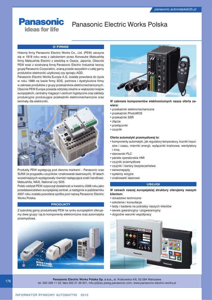 panasonic.automatykab2b.pl Panasonic Electric Works Polska O FIRMIE Historia firmy Panasonic Electric Works Co., Ltd. (PEW) zaczyna się w 1918 roku wraz z założeniem przez Konosuke Matsushitę firmy Matsushita Electric z siedzibą w Osace, Japonia. Obecnie PEW wraz z siostrzaną firmą Panasonic Electric Industrial tworzy grupę Panasonic Corporation, znaną przede wszystkim z całej gamy produktów elektroniki użytkowej czy sprzętu AGD. Panasonic Electric Works Europe A.G. została powołana do życia w roku 1989 na bazie firmy SDS, partnera i dystrybutora firmy w zakresie produktów z grupy przekaźników elektromechanicznych. Obecnie PEW Europe posiada oddziały lokalne w większości krajów europejskich, centralny magazyn i centrum logistyczne oraz zakłady produkcyjne produkujące przekaźniki elektromechaniczne oraz laminaty dla elektroniki. Produkty PEW występują pod dwoma markami – Panasonic oraz SUNX (w przypadku czujników i znakowarek laserowych). W latach wcześniejszych występowały również następujące znaki handlowe: Matsushita, NAiS, National czy SDS. Polski oddział PEW rozpoczął działalność w kwietniu 2006 roku jako przedstawicielstwo europejskiej centrali, a następnie w październiku 2007 roku została powołana spółka pod nazwą Panasonic Electric Works Polska. PRODUKTY Z szerokiej gamy produktowej PEW na rynku europejskim oferujemy dwie grupy i są to komponenty elektroniczne oraz automatyka przemysłowa. 176 W zakresie komponentów elektronicznych nasza oferta zawiera: przekaźniki elektromechaniczne przekaźniki PhotoMOS przekaźniki SSR złącza przełączniki czujniki Oferta automatyki przemysłowej to: komponenty automatyki, jak regulatory temperatury, liczniki impulsów i czasu, mierniki energii, wyłączniki krańcowe, wentylatory i inne, sterowniki PLC panele operatorskie HMI czujniki przemysłowe czujniki i bariery bezpieczeństwa serwonapędy systemy wizyjne znakowarki laserowe USŁUGI W ramach naszej europejskiej struktury oferujemy naszym klientom: doradztwo techniczne szkolenia i konsultacje testy i badania na potrzeby naszych klientów serwis gwarancyjny i pogwarancyjny dogodne warunki współpracy Panasonic Electric Works Polska Sp. z o.o., al. Krakowska 4/6, 02-284 Warszawa tel. 022 338 11 33, faks 022 21 39 501, [email protected], www.panasonic-electric-works.pl I N F O R M AT O R R Y N KO W Y AU T O M AT Y K I 2010