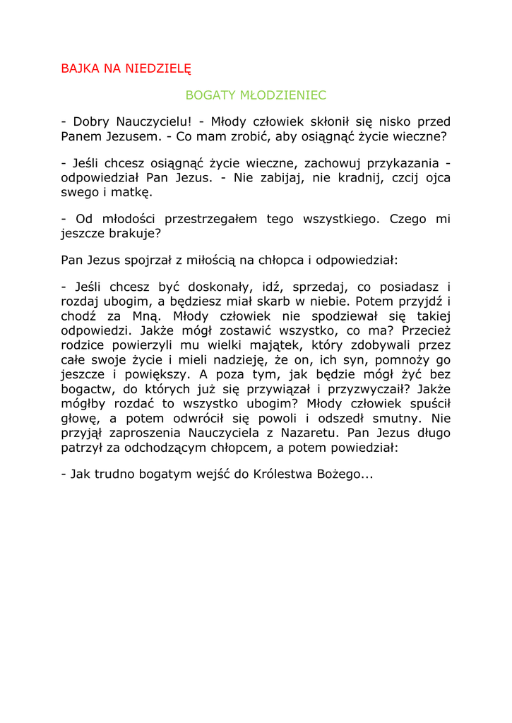 BAJKA NA NIEDZIELĘ BOGATY MŁODZIENIEC - Dobry Nauczycielu! - Młody człowiek skłonił się nisko przed Panem Jezusem. - Co mam zrobić, aby osiągnąć życie wieczne? - Jeśli chcesz osiągnąć życie wieczne, zachowuj przykazania odpowiedział Pan Jezus. - Nie zabijaj, nie kradnij, czcij ojca swego i matkę. - Od młodości przestrzegałem tego wszystkiego. Czego mi jeszcze brakuje? Pan Jezus spojrzał z miłością na chłopca i odpowiedział: - Jeśli chcesz być doskonały, idź, sprzedaj, co posiadasz i rozdaj ubogim, a będziesz miał skarb w niebie. Potem przyjdź i chodź za Mną. Młody człowiek nie spodziewał się takiej odpowiedzi. Jakże mógł zostawić wszystko, co ma? Przecież rodzice powierzyli mu wielki majątek, który zdobywali przez całe swoje życie i mieli nadzieję, że on, ich syn, pomnoży go jeszcze i powiększy. A poza tym, jak będzie mógł żyć bez bogactw, do których już się przywiązał i przyzwyczaił? Jakże mógłby rozdać to wszystko ubogim? Młody człowiek spuścił głowę, a potem odwrócił się powoli i odszedł smutny. Nie przyjął zaproszenia Nauczyciela z Nazaretu. Pan Jezus długo patrzył za odchodzącym chłopcem, a potem powiedział: - Jak trudno bogatym wejść do Królestwa Bożego...
