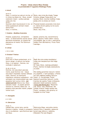 Propria – teksty własne Mszy Świętej na poniedziałek IV tygodnia Wielkiego Postu 4. Introit Ps 53, 3-4 Deus, in nomine tuo salvum me fac, et in virtute tua libera me : Deus, exaudi orationem meam : auribus percipe verba oris mei. Boże, ratuj mnie dla chwały Twego Imienia, potęgą Twoją obroń mą sprawę. Boże, słuchaj modlitwy mojej, podaj ucho na słowa ust moich. Ps 53, 5 Quoniam alieni insurrexerunt in me : et Powstali bowiem przeciwko mnie dumfortes quaesierunt animam meam. ni, ludzie okrutni godzą na me życie. Gloria Patri... Chwała Ojcu... Deus, in nomine... Boże, ratuj mnie... 7. Kolekta – Modlitwa Kościelna Praesta, quaesumus, omnipotens Deus : ut observationes sacras annua devotione recolentes, et corpore tibi placeamus et mente. Per Dominum nostrum... Spraw, prosimy Cię, wszechmocny Boże, abyśmy Tobie ciałem i duszą się podobali, gdy co roku z wiernością święty Post obchodzimy. Przez Pana naszego... 8. Lekcja ( 1 Krl 3, 16-28 ) 9. Graduał i Traktus Ps 30,3; 70, 1 Esto mihi in Deum protectorem, et in locum refugii, ut salvum me facias. Deus, in te speravi : Domine, non confudar in aeternum. Ps 102, 10; 78, 8-9 Domine, non secundum peccata nostra, quae fecimus nos : neque secundum iniquitates nostras retibuas nobis. Domine, ne memineris iniquitatum nostrarum antiquarum : cito anticipent nos misericordiae tuae, quia pauperes facti sumus nimis. (HIC GENUFLECITUR) Adiuva nos, Deus salutaris noster : et propter gloriam nominis tui, Domine, libera nos : et propitius esto peccatis nostris, propter nomen tuum. Bądź dla mnie skałą niezdobytą i miejs-cem bezpiecznym dla mego ratunku. W Tobie, Boże, nadzieję pokładam, Panie, niechże nie będę zawstydzony na wieki. Nie według grzechów naszych, któreśmy popełnili, z nami postępuj, o Panie; ani nam odpłacaj według naszych złości. O, nie pamiętaj, Panie, dawnych grzechów naszych; rychło niechaj nas spotka Twoje zmiłowanie, albowiem biedni jesteśmy bardzo (TUTAJ SIĘ PRZYKLĘKA). Wspomóż nas, Boże, nasz Zbawicielu; dla chwały Imienia Twego wybaw nas, Panie, i przebacz nam grzechy ze względu na Imię Twoje. 11. Ewangelia ( J 2, 13-25 ) 14. Ofertorium Ps 99, 1-2 Iubilate Deo, omnis terra, servite Domino in laetitia : intrate in conspectu eius in exultatione : quia Dominus ipse est Deus. Wykrzykuj Bogu, wszystka ziemio, służcie Panu z weselem, spieszcie przed Jego oblicze z radością. Albowiem Pan jest Bogiem 22. Sekreta Oblatum tibi, Domine, sacrificium vivi- Ofiara, Panie, Tobie złożona, niechaj ficet nos semper, et muniat. Per Domi- nas zawsze ożywia i wzmacnia. Przez num nostrum... Pana naszego... 23. Prefacja ( Wielkopostna ) Vere dignum et iustum est, aequum et salutare, nos tibi semper et ubique gratias agere : Domine, sancte Pater, omnipotens aeterne Deus. Qui corporali ieiunio vitia comprimis, mentem elevas, virtutem largiris et praemia : per Christum Dominum nostrum. Per quem maiestatem tuam laudant Angeli, adorant Dominationes, tremunt Potestates. Caeli caelorumque Virtutes, ac beata Seraphim socia exultatione concelebrant. Cum quibus et nostras voces ut admitti iubeas, deprecamur, supplici confessione dicentes: Prawdziwie godnie jest to i sprawiedliwie, słusznie i zbawiennie, byśmy zawsze i wszędzie dzięki Tobie czynili, Panie, święty Ojcze, wszechmogący, wiekuisty Boże. Który przez post ciała występki powściągasz, ducha podnosisz, cnotę dajesz i nagrodę przez Chrystusa Pana naszego. Przez Niego Majestat Twój wychwalają Aniołowie, wielbią Panowania, ze drżeniem czczą Mocarstwa. A wspólnie z nimi w radosnym uniesieniu sławią Niebiosa, Moce niebieskie, i błogosławione Serafiny. Dozwól, błagamy, aby i nasze głosy przyłączyły się do nich i ze czcią uniżoną wymawiały: 39. Komunia Ps 18, 13.14 Ab occultis meis munda me, Domine : et ab alienis parce servo tuo. Oczyść mnie, Panie, od moich grzechów ukrytych i od jawnych złości zachowaj sługę swego. 40. Pokomunia Sumptis, Domine, salutaribus sacra-mentis : ad redemptionis aeterne, quae-sumus, proficiamus augmentum. Per Dominum nostrum... Prosimy Cię Panie niechaj Sakramenty, które spożyliśmy pomnożą w nas łaskę wiecznego odkupienia. Przez Pana naszego... Modlitwa nad ludem Oremus. Humiliate capita vestra Deo. Deprecationem nostram, quaesumus, Domine, benignus exaudi : et quibus supplicandi praestas affectum, tribue defensionis auxilium. Per Dominum nostrum... Módlmy się. Schylcie przed Bogiem głowy wasze. Wysłuchaj łaskawie, prosimy Cię, błagania nasze, a skoro pobudzasz nas do tej modlitwy, racz nam udzielić pomocy i obrony twojej. Przez Pana naszego...