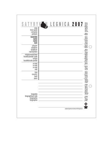 imiê first name vorname prénom nazwisko name name nom ulica/nr street/nr straße/nr rue/numéro miejscowoœæ/kod locality/postal code ort/pzl localité/code postal e-mail e-mail e-mail mél kraj country land pays biografia biographical note biographie biographie podpis/signature/unterschrift/signature karta zg³oszenia application card teilnahmekarte déclaration de presénce SATYRYKON LEGNICA 2007 karta zg³oszenia application card teilnahmekarte déclaration de presénce SATYRYKON LEGNICA 2007 humor i satyra tytu³ humour and satire title humor und satire titel humor et satire titre kot tytu³ cat title die katze titel chat titre zwrot return rückgabe retour z w rubryce zwrot prosimy zaznaczyæ û prace, które organizatorzy mog¹ w³¹czyæ do galerii satyrykonu. z in the box return, please mark û works which can be included in the collection of the satyrykon gallery by the organizers. z in the rubrik rückgabe markieren sie bitte mit û diese arbeiten, die teil der sammlung der satyrykon galerie bleiben können. z dans la rubrique „retour” marquez les travaux que les organisateurs peuvent joindre à la galerie de Satyrykon.