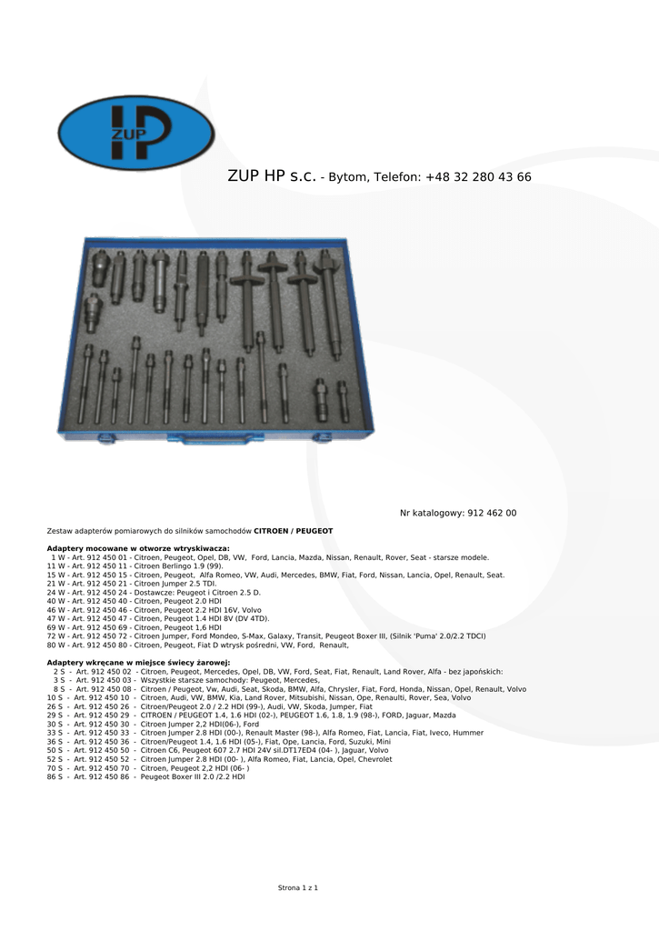 ZUP HP s.c. - Bytom, Telefon: +48 32 280 43 66 Nr katalogowy: 912 462 00 Zestaw adapterów pomiarowych do silników samochodów CITROEN / PEUGEOT Adaptery mocowane w otworze wtryskiwacza: 1 W - Art. 912 450 01 - Citroen, Peugeot, Opel, DB, VW, Ford, Lancia, Mazda, Nissan, Renault, Rover, Seat - starsze modele. 11 W - Art. 912 450 11 - Citroen Berlingo 1.9 (99). 15 W - Art. 912 450 15 - Citroen, Peugeot, Alfa Romeo, VW, Audi, Mercedes, BMW, Fiat, Ford, Nissan, Lancia, Opel, Renault, Seat. 21 W - Art. 912 450 21 - Citroen Jumper 2.5 TDI. 24 W - Art. 912 450 24 - Dostawcze: Peugeot i Citroen 2.5 D. 40 W - Art. 912 450 40 - Citroen, Peugeot 2.0 HDI 46 W - Art. 912 450 46 - Citroen, Peugeot 2.2 HDI 16V, Volvo 47 W - Art. 912 450 47 - Citroen, Peugeot 1.4 HDI 8V (DV 4TD). 69 W - Art. 912 450 69 - Citroen, Peugeot 1,6 HDI 72 W - Art. 912 450 72 - Citroen Jumper, Ford Mondeo, S-Max, Galaxy, Transit, Peugeot Boxer III, (Silnik 'Puma' 2.0/2.2 TDCI) 80 W - Art. 912 450 80 - Citroen, Peugeot, Fiat D wtrysk pośredni, VW, Ford, Renault, Adaptery wkręcane w miejsce świecy żarowej: 2 S - Art. 912 450 02 - Citroen, Peugeot, Mercedes, Opel, DB, VW, Ford, Seat, Fiat, Renault, Land Rover, Alfa - bez japońskich: 3 S - Art. 912 450 03 - Wszystkie starsze samochody: Peugeot, Mercedes, 8 S - Art. 912 450 08 - Citroen / Peugeot, Vw, Audi, Seat, Skoda, BMW, Alfa, Chrysler, Fiat, Ford, Honda, Nissan, Opel, Renault, Volvo 10 S - Art. 912 450 10 - Citroen, Audi, VW, BMW, Kia, Land Rover, Mitsubishi, Nissan, Ope, Renaulti, Rover, Sea, Volvo 26 S - Art. 912 450 26 - Citroen/Peugeot 2.0 / 2.2 HDI (99-), Audi, VW, Skoda, Jumper, Fiat 29 S - Art. 912 450 29 - CITROEN / PEUGEOT 1.4, 1.6 HDI (02-), PEUGEOT 1.6, 1.8, 1.9 (98-), FORD, Jaguar, Mazda 30 S - Art. 912 450 30 - Citroen Jumper 2,2 HDI(06-), Ford 33 S - Art. 912 450 33 - Citroen Jumper 2.8 HDI (00-), Renault Master (98-), Alfa Romeo, Fiat, Lancia, Fiat, Iveco, Hummer 36 S - Art. 912 450 36 - Citroen/Peugeot 1.4, 1.6 HDI (05-), Fiat, Ope, Lancia, Ford, Suzuki, Mini 50 S - Art. 912 450 50 - Citroen C6, Peugeot 607 2.7 HDI 24V sil.DT17ED4 (04- ), Jaguar, Volvo 52 S - Art. 912 450 52 - Citroen Jumper 2.8 HDI (00- ), Alfa Romeo, Fiat, Lancia, Opel, Chevrolet 70 S - Art. 912 450 70 - Citroen, Peugeot 2,2 HDI (06- ) 86 S - Art. 912 450 86 - Peugeot Boxer III 2.0 /2.2 HDI Strona 1 z 1