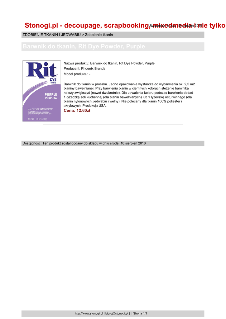 środa, 10 sierpień i2016 Stonogi.pl - decoupage, scrapbooking,Utworzono: mixedmedia nie tylko. ZDOBIENIE TKANIN I JEDWABIU > Zdobienie tkanin Barwnik do tkanin, Rit Dye Powder, Purple Nazwa produktu: Barwnik do tkanin, Rit Dye Powder, Purple Producent: Phoenix Brands Model produktu: Barwnik do tkanin w proszku. Jedno opakowanie wystarcza do wybarwienia ok. 2,5 m2 tkaniny bawełnianej. Przy barwieniu tkanin w ciemnych kolorach stężenie barwnika należy zwiększyć (nawet dwukrotnie). Dla utrwalenia koloru podczas barwienia dodać 1 łyżeczkę soli kuchennej (dla tkanin bawełnianych) lub 1 łyżeczkę octu winnego (dla tkanin nylonowych, jedwabiu i wełny). Nie polecany dla tkanin 100% poliester i akrylowych. Produkcja USA. Cena: 12.60zł Dostępność: Ten produkt został dodany do sklepu w dniu środa, 10 sierpień 2016 http://www.stonogi.pl | [email protected] | | Strona 1/1