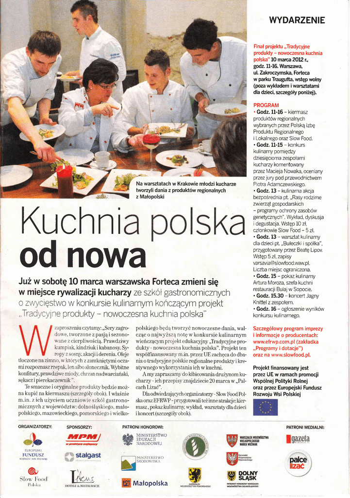 WYDARZEN!E Finał projektu,,Tradycyjne prcduĘ - nowoczesna kuchnia polska" l0 marca 2012r,, godz. 11-16. Warczawa, ul. Zakrcczymska, Fońeca w parku Traugutta, wstęp wolny (poza wykładem i warsztatami dla dzieci, szcząGy poniżej). PRoGRAM . Godz. 11-16 - kiermasz produktów regionalnych wybra nych pzez P olską lzbę Produktu Regionalnego i Lokalnego oraz Slow Food. . Godz. 11-15 - konkurs kulinarny pomiędzy dziesięcioma zespołami kuchazy komentowany pzez Maciela Nowaka, ocen iany pzez jury pod paewodnictwem Piotra Adamczewskiego. . Godz. 13 - kulinarna akcla bezpośrednia pt. ,,Rasy rodzime zwierząt gospodarskich - programy ochrony zasobów genetycznych". Wykład, dyskusja i degustacja, Wstęp 10 zł członkowie S|ow Food - 5 zł. . Godz. 13 - warsżat kulinarny dla dzieci pt. ,,Bułeczki i spółka", paygotowany paez Beatę Llpov Na warsztatach w krakowie młodzi kuchaze twozyli dania z produktów regionalnych z Małopolski Kuchni od nowa Wstęp 5 Już w sobotę 10 marca wa§zawska Fońeca zmieni się w miejsce rywalizacji kucharuy zeszkcl gastronomicznych c zwycięstwo w konkursie kulinarnym konczącym projekt Tradycylne produkty zaproszeniu cz;tamy:,,Sery za§ro- k-unlpiak, kindziuk i kabanosy. Syropt z sosny, akacji i derenia. Oleje tłoczone na zimno. rv który-ch z zamkniętJ,,rni oczami rozpoznasz rz epalr len albo słonecznik. łlubitne konfitury prawdzirve miod1. chrzan nadwarciański, sękacz i pierekaczewnik ''. Te smaczne i oryginalne produkty będ zie można kupić na kiermaszu (szczegół;,obok). I właśnie m.in. z ich użyciem uczniorvie szkół gastrono- micznych z województw: dolnośląskie§o, mało- polskiego, mazowieckiego, pomorskie go i wielkoORGANlZATORZY DIa odwiedzająrych oąuizatnr4l ska oraz EFRWP - przygotowa]i W9l Pol §KtE| MTNI§TĘRSTWO EDU]6CJI NARODOWEJ li1\,]S]l_RSIwO sRoDó\\'IsKł @y Slrlrl, Iłlilll l),ll,ka konkursu kulinarnego. - Slow Food Po]- też inne atrakcj o kier masz , pokaz kulinarny, wykład, warsztaty dla dzieci i koncert (szczegóły obok). ĘL ROPEjsRl FUNDUSZ Knittel z zespołem. . Godz. 16 - ogłoszenie wyników polskiego będą trvorzyć nowoczesne dania, walcząc o najwyższą notę w konkursie kulinarnym wieńczącpn proj ekt edukacyjny,,Tradycyjne produkty - nowoczesna kuchnia polska". Projekt ten współfinansowany m.in. przez UE zachęca do dbania o tradyryjne poiskie regionalne produkty i kreatywnego wykorzystania ich w kuchni. A my zapraszamy do kibicowania druĄmom kucharzy - ich przepisy znajdziecie 20 marca w ,,PaIcachLizać". PATRON| HONOROWI: ffi Rozwq! restauracji Bulaj w Sopocre, . Godz. 15.30 - koncert Jagny - nowoczesna kuchnla polska" dorr e. tworzone z pasją i sezono\\ ane z cierpliwością. Prawdziwy Małopolska zl,zapisy [email protected] pl. Liczba miejsc ograniczona. . Godz. 15 - pokaz kulinarny Artura Moroza, szefa kuchni Szczegółowy program imprezy i informacje o producentach: www.ef rwp.com.pl (zakładka ,,Programy i dotacje") oraz na www.slowfood.pl. Projekt f inansowany jest paez UE w ramach promocji Wspólnej Polityki Rolnej oraz przez Europejski Fundusz Rozwoju WsiPolskiej
