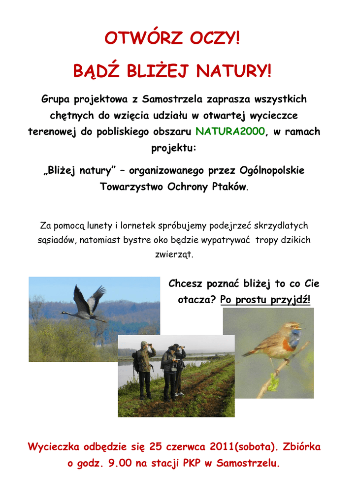 OTWÓRZ OCZY! BĄDŹ BLIŻEJ NATURY! Grupa projektowa z Samostrzela zaprasza wszystkich chętnych do wzięcia udziału w otwartej wycieczce terenowej do pobliskiego obszaru NATURA2000, w ramach projektu: „Bliżej natury” – organizowanego przez Ogólnopolskie Towarzystwo Ochrony Ptaków. Za pomocą lunety i lornetek spróbujemy podejrzeć skrzydlatych sąsiadów, natomiast bystre oko będzie wypatrywać tropy dzikich zwierząt. Chcesz poznać bliżej to co Cie otacza? Po prostu przyjdź! Wycieczka odbędzie się 25 czerwca 2011(sobota). Zbiórka o godz. 9.00 na stacji PKP w Samostrzelu.