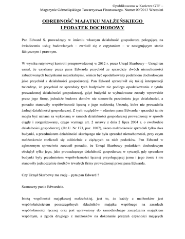 Opublikowano w Kurierze GTF – Magazynie Górnośląskiego Towarzystwa Finansowego. Numer 09/2013 Wrzesień ODRĘBNOŚĆ MAJĄTKU MAŁŻEŃSKIEGO I PODATEK DOCHODOWY Pan Edward S. prowadzący w imieniu własnym działalność gospodarczą polegającą na świadczeniu usług budowlanych – zwrócił się z zapytaniem – w następującym stanie faktycznym i prawnym. W wyniku rutynowej kontroli przeprowadzonej w 2012 r. przez Urząd Skarbowy – Urząd ten uznał, że uzyskany przez pana Edwarda przychód ze sprzedaży dwóch nieruchomości zabudowanych budynkami mieszkalnymi, winien być opodatkowany podatkiem dochodowym jako przychód z działalności gospodarczej. Pan Edward sprzeciwił się takiej interpretacji twierdząc, że przychód ze sprzedaży tych budynków nie podlega opodatkowaniu z tytułu prowadzonej działalności gospodarczej, gdyż budynki te wybudowane zostały wprawdzie przez jego firmę, jednakże budowa domów nie stanowiła przedmiotu jego działalności, a ponadto stanowiły współwłasność łączną z jego małżonką Urszulą, która nie prowadziła żadnej działalności gospodarczej. Z tych względów – zdaniem pana Edwarda - sprzedaż ta nie mogła być uznana za wykonaną w ramach działalności gospodarczej prowadzonej w sposób ciągły i zorganizowany, czego wymaga art. 2 ustawy z dnia 2 lipca 2004 r. o swobodzie działalności gospodarczej (Dz.U. Nr 173, poz. 1807), skoro małżonkowie sprzedali tylko dwa budynki, a przedmiotem działalności skarżącego nie była sprzedaż nieruchomości, przy czym małżonkowie rozliczali się oddzielnie z ciążących na nich podatków. Pan Edward w zgłoszonym sprzeciwie zarzucił ponadto, że Urząd Skarbowy podatkiem dochodowym obciążył tylko jego, jako prowadzącego działalność gospodarczą w sytuacji, gdy sprzedane budynki były przedmiotem współwłasności łącznej przysługującej jemu i jego żonie i nie stanowiły jednocześnie środków trwałych firmy prowadzonej przez pana Edwarda. Czy Urząd Skarbowy ma rację – pyta pan Edward ? Szanowny panie Edwardzie. Istotą wspólności majątkowej małżeńskiej, jest to, że każdy z małżonków jest współwłaścicielem poszczególnych składników majątku wspólnego na zasadach współwłasności łącznej oraz jest uprawniony do samodzielnego zarządzania majątkiem wspólnym, a zgoda drugiego z małżonków na dokonanie przezeń czynności mających charakter działalności gospodarczej, nie oznacza, że przez jej wyrażenie staje się on przedsiębiorcą czy wspólnikiem prowadzonej przez jednego z małżonków działalności. Wybudował pan dwa budynki mieszkalne (wykorzystując moce przerobowe pańskiej firmy budowlanej, a zatem de facto w ramach prowadzonej działalności gospodarczej) na gruncie stanowiącym współwłasność małżeńską, a następnie dokonał ich zbycia wspólnie z żoną. Stosownie do treści art. 10 ust. 1 pkt 8 Ustawy o podatku dochodowym od osób fizycznych z dnia 26 lipca 1991 r. tekst jednolity z dnia 17 stycznia 2012 r. (Dz.U. z 2012 r. poz. 361) osiągniętego przychodu nie można kwalifikować jako pochodzącego ze wspólnej własności, skoro odpłatne zbycie przedmiotowych nieruchomości nastąpiło w wykonaniu prowadzonej przez pana działalności gospodarczej. Odpłatne zbycie nieruchomości stanowiącej współwłasność małżeńską dokonane w ramach działalności gospodarczej prowadzonej przez jednego z małżonków, wyłącza możliwość zaliczenia tak uzyskanego przychodu do innego źródła przychodu, niż działalność gospodarcza, gdyż przychód ze sprzedaży nieruchomości, który został uzyskany w ramach działalności gospodarczej nie podlega opodatkowaniu na zasadach przewidzianych w art. 28 ust. 1 i 2 w/w ustawy. Jeżeli jeden z małżonków, pozostających we wspólności majątkowej małżeńskiej, prowadzi działalność gospodarczą, to dochody z tej działalności, zwłaszcza jeśli małżonkowie nie skorzystali z możliwości wspólnego opodatkowania - co w pana przypadku miało miejsce opodatkowane są odrębnie, zaś obowiązek podatkowy z tytułu przychodu osiągniętego w wyniku prowadzonej działalności gospodarczej, dotyczy tylko tego małżonka, który prowadzi tę działalność nawet, jeśli w ramach tej działalności wykorzystuje rzeczy należące do majątku wspólnego małżonków. Radca Prawny Zbigniew Labocha z Kancelarii prawniczej „L&D”