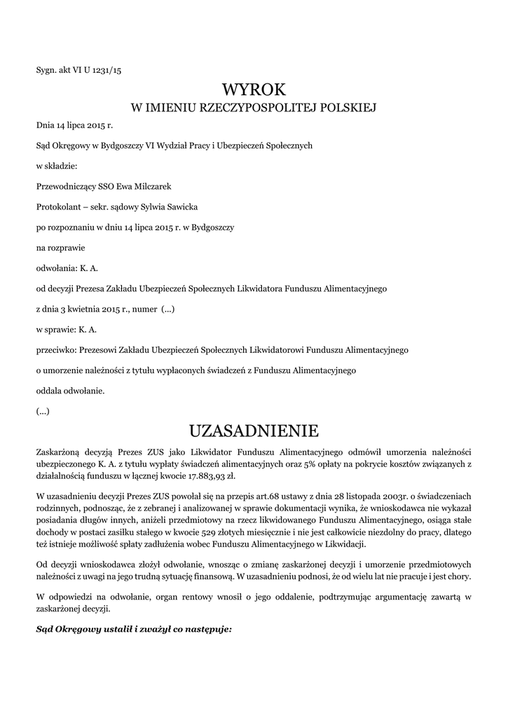 Sygn. akt VI U 1231/15 WYROK W IMIENIU RZECZYPOSPOLITEJ POLSKIEJ Dnia 14 lipca 2015 r. Sąd Okręgowy w Bydgoszczy VI Wydział Pracy i Ubezpieczeń Społecznych w składzie: Przewodniczący SSO Ewa Milczarek Protokolant – sekr. sądowy Sylwia Sawicka po rozpoznaniu w dniu 14 lipca 2015 r. w Bydgoszczy na rozprawie odwołania: K. A. od decyzji Prezesa Zakładu Ubezpieczeń Społecznych Likwidatora Funduszu Alimentacyjnego z dnia 3 kwietnia 2015 r., numer (...) w sprawie: K. A. przeciwko: Prezesowi Zakładu Ubezpieczeń Społecznych Likwidatorowi Funduszu Alimentacyjnego o umorzenie należności z tytułu wypłaconych świadczeń z Funduszu Alimentacyjnego oddala odwołanie. (...) UZASADNIENIE Zaskarżoną decyzją Prezes ZUS jako Likwidator Funduszu Alimentacyjnego odmówił umorzenia należności ubezpieczonego K. A. z tytułu wypłaty świadczeń alimentacyjnych oraz 5% opłaty na pokrycie kosztów związanych z działalnością funduszu w łącznej kwocie 17.883,93 zł. W uzasadnieniu decyzji Prezes ZUS powołał się na przepis art.68 ustawy z dnia 28 listopada 2003r. o świadczeniach rodzinnych, podnosząc, że z zebranej i analizowanej w sprawie dokumentacji wynika, że wnioskodawca nie wykazał posiadania długów innych, aniżeli przedmiotowy na rzecz likwidowanego Funduszu Alimentacyjnego, osiąga stałe dochody w postaci zasiłku stałego w kwocie 529 złotych miesięcznie i nie jest całkowicie niezdolny do pracy, dlatego też istnieje możliwość spłaty zadłużenia wobec Funduszu Alimentacyjnego w Likwidacji. Od decyzji wnioskodawca złożył odwołanie, wnosząc o zmianę zaskarżonej decyzji i umorzenie przedmiotowych należności z uwagi na jego trudną sytuację finansową. W uzasadnieniu podnosi, że od wielu lat nie pracuje i jest chory. W odpowiedzi na odwołanie, organ rentowy wnosił o jego oddalenie, podtrzymując argumentację zawartą w zaskarżonej decyzji. Sąd Okręgowy ustalił i zważył co następuje: K. A. z zawodu jest technikiem budowlanym maszyn i urządzeń budowlanych. Jest po rozwodzie z żoną, z którą posiada dziecko na które miał zasądzone alimenty. Świadczeń alimentacyjnych na rzecz uprawnionego dokonywał ZUS, na podstawie art.7 ustawy z dnia 18 lipca 1974r. o funduszu alimentacyjnym (Dz. U. z 1991r. Nr 45, poz. 200 z późn. zm.) i wypłacał alimenty z funduszu alimentacyjnego do rąk matki jako przedstawiciela ustawowego dziecka. Zaległość wynosi na datę decyzji 17.883,93zł. Zadłużenie z tytułu wypłaconych świadczeń z funduszu alimentacyjnego nie zostało spłacone. Wnioskodawca mieszka w miejscowości G. w mieszkaniu należącym obecnie do jego siostry G. P.. Wnioskodawca odziedziczył razem z siostrą mieszkanie po matce, która zmarła(...). i był współwłaścicielem tego mieszkania do czerwca 2015r., kiedy to przekazał darowizną swoją część mieszkania siostrze. Wnioskodawca mieszka więc u siostry, która zobowiązała się utrzymywać wnioskodawcę i pokrywać koszty utrzymania mieszkania. Wnioskodawca otrzymuje zasiłek stały, przyznany do lipca 2015r. i złożył wniosek o przyznanie mu dodatku na dalszy okres. Wnioskodawca posiada umiarkowany stopień niepełnosprawności, ostatnio przyznany decyzją z dnia 14.07.2014r., choruje na epilepsję, zapalenie wątroby, dyskopatię i przebył gruźlicę. Nie posiada orzeczenia, że jest całkowicie niezdolny do pracy. Wnioskodawca pracował w (...)do 1985r., potem w (...) (...)do 1988r. a po 1988r. przebywał w N. do 1992r. i dostawał tam świadczenie socjalne w 1992r. Dwie zaległe raty alimentów zapłacił po powrocie z N.. Od 1993r. wnioskodawca jest bezrobotny. Wnioskodawcę utrzymywała jego mama do chwili śmierci. Po 1992r. wnioskodawca pracował jedynie dorywczo na budowie. Nie posiada obecnie nikogo na utrzymaniu. Wnioskodawca stara się o pracę tylko w zakładach pracy chronionej z uwagi na stan zdrowia. dowód: dokumenty w aktach rentowych wnioskodawcy, zeznania wnioskodawcy-zapis protokołu rozprawy k.20 Sąd uznał, że odwołanie nie zasługuje na uwzględnienie. Zgodnie z art.68 ust.1 ustawy z dnia 28 listopada 2003r. o świadczeniach rodzinnych (Dz. U. z 2013r. poz. 1456) w szczególnie uzasadnionych wypadkach związanych z sytuacją zdrowotną i rodzinną osoby, przeciwko której prowadzona jest egzekucja alimentów, lub osoby zobowiązanej do zwrotu bezpodstawnie pobranych świadczeń z funduszu, likwidator może umorzyć, rozłożyć na raty lub odroczyć termin płatności należności likwidowanego funduszu z tytułu wypłaconych lub bezprawnie pobranych świadczeń z funduszu. Powyższy przepis art.68 ustawy z dnia 28 listopada 2003r. o świadczeniach rodzinnych ma charakter wyjątkowy i dotyczy osób szczególnie pokrzywdzonych poprzez nagłą zmianę ich sytuacji zdrowotnej czy rodzinnej. W oparciu o zebrany materiał dowodowy w postaci akt ZUS, zeznań wnioskodawcy Sąd uznał, że w niniejszej sprawie nie zachodzą okoliczności przemawiające za uwzględnieniem wniosku. Wnioskodawca nie legitymuje się całkowitą niezdolnością do pracy. Posiada orzeczony umiarkowany stopień niepełnosprawności, co umożliwia mu podjęcie pracy w określonych zakładach pracy. Otrzymuje zasiłek stały co miesiąc, obecnie przyznany do końca lipca 2015r. Wnioskodawca złożył wniosek o przyznanie świadczenia na kolejny rok. Jest osobą w średnim wieku. Wnioskodawca mieszka sam w mieszkaniu, które odziedziczył razem z siostrą po matce. Mieszkanie o powierzchni 49,5 m jest warte około 80 000 zł i składa się z dwóch pokoi i kuchni. Wnioskodawca nie ponosi kosztów utrzymania mieszkania, bowiem na mocy umowy z siostrą ponosi je G. P., mieszkająca na stałe w W., która kupuje bratu także niezbędne leki i odzież. Wnioskodawca posiada wykształcenie zawodowe gwarantujące mu utrzymanie. Wnioskodawca nie posiada innych długów na rzecz osób fizycznych i prawnych. Na rozprawę stawił się sam, był zadbany, sprawny ruchowo, w dobrym