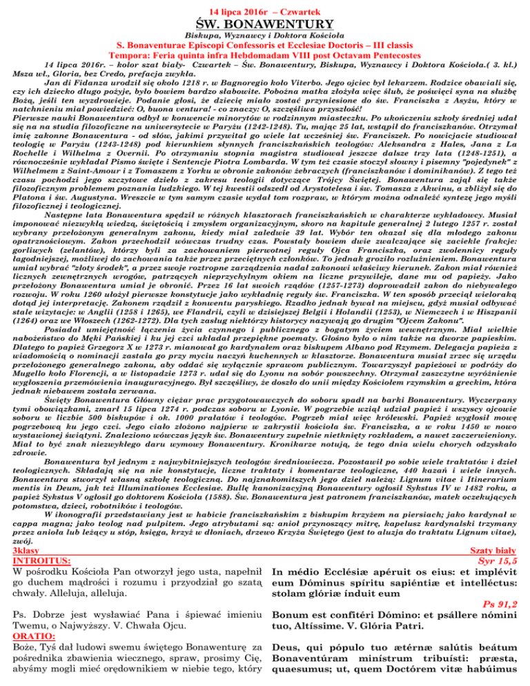 14 lipca 2016r – Czwartek ŚW. BONAWENTURY Biskupa, Wyznawcy i Doktora Kościoła S. Bonaventurae Episcopi Confessoris et Ecclesiae Doctoris – III classis Tempora: Feria quinta infra Hebdomadam VIII post Octavam Pentecostes 14 lipca 2016r. – kolor szat biały- Czwartek – Św. Bonawentury, Biskupa, Wyznawcy i Doktora Kościoła.( 3. kl.) Msza wł., Gloria, bez Credo, prefacja zwykła. Jan di Fidanza urodził się około 1218 r. w Bagnoregio koło Viterbo. Jego ojciec był lekarzem. Rodzice obawiali się, czy ich dziecko długo pożyje, było bowiem bardzo słabowite. Pobożna matka złożyła więc ślub, że poświęci syna na służbę Bożą, jeśli ten wyzdrowieje. Podanie głosi, że dziecię miało zostać przyniesione do św. Franciszka z Asyżu, który w natchnieniu miał powiedzieć: O, buona ventura! - co znaczy: O, szczęśliwa przyszłość! Pierwsze nauki Bonawentura odbył w konwencie minorytów w rodzinnym miasteczku. Po ukończeniu szkoły średniej udał się na na studia filozoficzne na uniwersytecie w Paryżu (1242-1248). Tu, mając 25 lat, wstąpił do franciszkanów. Otrzymał imię zakonne Bonawentura - od słów, jakimi przywitał go wiele lat wcześniej św. Franciszek. Po nowicjacie studiował teologię w Paryżu (1243-1248) pod kierunkiem słynnych franciszkańskich teologów: Aleksandra z Hales, Jana z La Rochelle i Wilhelma z Overnii. Po otrzymaniu stopnia magistra studiował jeszcze dalsze trzy lata (1248-1251), a równocześnie wykładał Pismo święte i Sentencje Piotra Lombarda. W tym też czasie stoczył słowny i pisemny "pojedynek" z Wilhelmem z Saint-Amour i z Tomaszem z Yorku w obronie zakonów żebraczych (franciszkanów i dominikanów). Z tego też czasu pochodzi jego szczytowe dzieło z zakresu teologii dotyczące Trójcy Świętej. Bonawentura zajął się także filozoficznym problemem poznania ludzkiego. W tej kwestii odszedł od Arystotelesa i św. Tomasza z Akwinu, a zbliżył się do Platona i św. Augustyna. Wreszcie w tym samym czasie wydał tom rozpraw, w którym można odnaleźć syntezę jego myśli filozoficznej i teologicznej. Następne lata Bonawentura spędził w różnych klasztorach franciszkańskich w charakterze wykładowcy. Musiał imponować niezwykłą wiedzą, świętością i zmysłem organizacyjnym, skoro na kapitule generalnej 2 lutego 1257 r. został wybrany przełożonym generalnym zakonu, kiedy miał zaledwie 39 lat. Wybór ten okazał się dla młodego zakonu opatrznościowym. Zakon przechodził wówczas trudny czas. Powstały bowiem dwie zwalczające się zaciekle frakcje: gorliwych (zelantów), którzy byli za zachowaniem pierwotnej reguły Ojca Franciszka, oraz zwolennicy reguły łagodniejszej, możliwej do zachowania także przez przeciętnych członków. To jednak groziło rozluźnieniem. Bonawentura umiał wybrać "złoty środek", a przez swoje roztropne zarządzenia nadał zakonowi właściwy kierunek. Zakon miał również licznych zewnętrznych wrogów, patrzących nieprzychylnym okiem na liczne przywileje, dane mu od papieży. Jako przełożony Bonawentura umiał je obronić. Przez 16 lat swoich rządów (1257-1273) doprowadził zakon do niebywałego rozwoju. W roku 1260 ułożył pierwsze konstytucje jako wykładnię reguły św. Franciszka. W ten sposób przeciął wieloraką dotąd jej interpretację. Zakonem rządził z konwentu paryskiego. Rzadko jednak bywał na miejscu, gdyż musiał odbywać stale wizytacje: w Anglii (1258 i 1265), we Flandrii, czyli w dzisiejszej Belgii i Holandii (1253), w Niemczech i w Hiszpanii (1264) oraz we Włoszech (1262-1272). Dla tych zasług niektórzy historycy nazywają go drugim "Ojcem Zakonu". Posiadał umiejętność łączenia życia czynnego i publicznego z bogatym życiem wewnętrznym. Miał wielkie nabożeństwo do Męki Pańskiej i ku jej czci układał przepiękne poematy. Głośno było o nim także na dworze papieskim. Dlatego to papież Grzegorz X w 1273 r. mianował go kardynałem oraz biskupem Albano pod Rzymem. Delegacja papieża z wiadomością o nominacji zastała go przy myciu naczyń kuchennych w klasztorze. Bonawentura musiał zrzec się urzędu przełożonego generalnego zakonu, aby oddać się wyłącznie sprawom publicznym. Towarzyszył papieżowi w podróży do Mugello koło Florencji, a w listopadzie 1273 r. udał się do Lyonu na sobór powszechny. Otrzymał zaszczytne wyróżnienie wygłoszenia przemówienia inauguracyjnego. Był szczęśliwy, że doszło do unii między Kościołem rzymskim a greckim, która jednak niebawem została zerwana. Święty Bonawentura Główny ciężar prac przygotowawczych do soboru spadł na barki Bonawentury. Wyczerpany tymi obowiązkami, zmarł 15 lipca 1274 r. podczas soboru w Lyonie. W pogrzebie wziął udział papież i wszyscy ojcowie soboru w liczbie 500 biskupów i ok. 1000 prałatów i teologów. Pogrzeb miał więc królewski. Papież wygłosił mowę pogrzebową ku jego czci. Jego ciało złożono najpierw w zakrystii kościoła św. Franciszka, a w roku 1450 w nowo wystawionej świątyni. Znaleziono wówczas język św. Bonawentury zupełnie nietknięty rozkładem, a nawet zaczerwieniony. Miał to być znak niezwykłego daru wymowy Bonawentury. Kronikarze notują, że tego dnia wielu chorych odzyskało zdrowie. Bonawentura był jednym z najwybitniejszych teologów średniowiecza. Pozostawił po sobie wiele traktatów i dzieł teologicznych. Składają się na nie konstytucje, liczne traktaty i komentarze teologiczne, 440 kazań i wiele innych. Bonawentura stworzył własną szkołę teologiczną. Do najznakomitszych jego dzieł należą: Lignum vitae i Itinerarium mentis in Deum, jak też Illuminationes Ecclesiae. Bullę kanonizacyjną Bonawentury ogłosił Sykstus IV w 1482 roku, a papież Sykstus V ogłosił go doktorem Kościoła (1588). Św. Bonawentura jest patronem franciszkanów, matek oczekujących potomstwa, dzieci, robotników i teologów. W ikonografii przedstawiany jest w habicie f