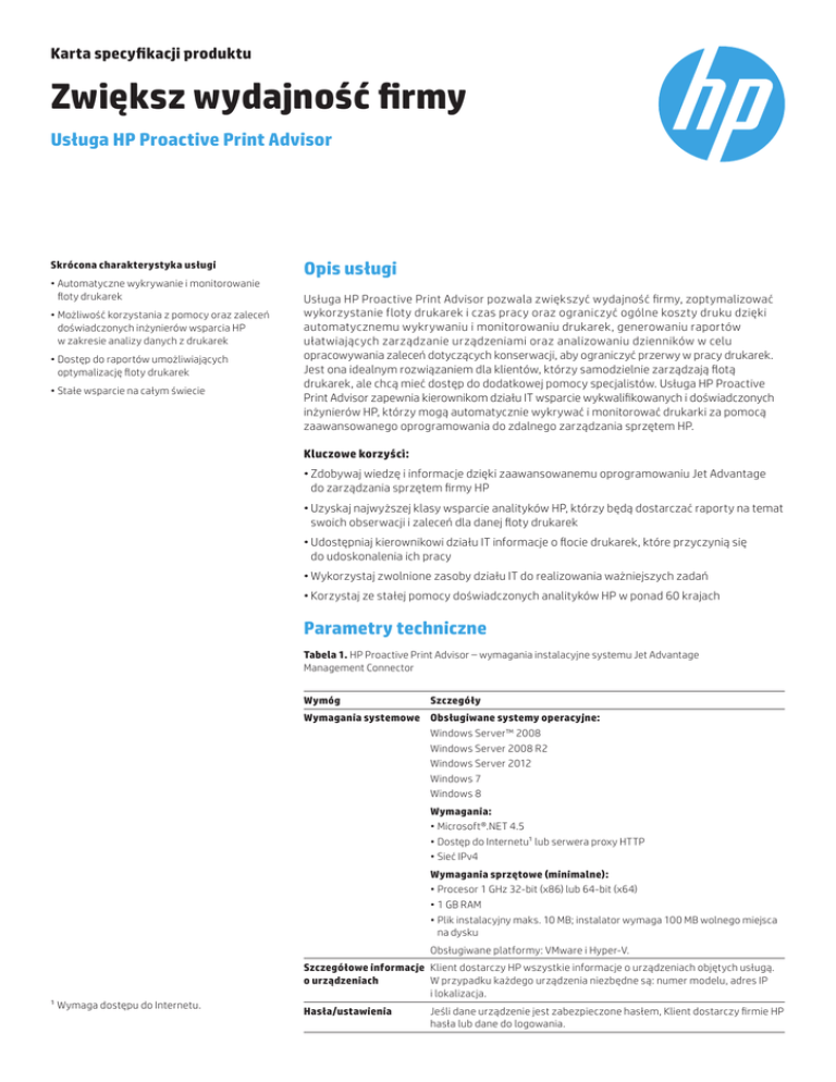 Karta specyfikacji produktu Zwiększ wydajność firmy Usługa HP Proactive Print Advisor Skrócona charakterystyka usługi •Automatyczne wykrywanie i monitorowanie floty drukarek •Możliwość korzystania z pomocy oraz zaleceń doświadczonych inżynierów wsparcia HP w zakresie analizy danych z drukarek •Dostęp do raportów umożliwiających optymalizację floty drukarek •Stałe wsparcie na całym świecie Opis usługi Usługa HP Proactive Print Advisor pozwala zwiększyć wydajność firmy, zoptymalizować wykorzystanie floty drukarek i czas pracy oraz ograniczyć ogólne koszty druku dzięki automatycznemu wykrywaniu i monitorowaniu drukarek, generowaniu raportów ułatwiających zarządzanie urządzeniami oraz analizowaniu dzienników w celu opracowywania zaleceń dotyczących konserwacji, aby ograniczyć przerwy w pracy drukarek. Jest ona idealnym rozwiązaniem dla klientów, którzy samodzielnie zarządzają flotą drukarek, ale chcą mieć dostęp do dodatkowej pomocy specjalistów. Usługa HP Proactive Print Advisor zapewnia kierownikom działu IT wsparcie wykwalifikowanych i doświadczonych inżynierów HP, którzy mogą automatycznie wykrywać i monitorować drukarki za pomocą zaawansowanego oprogramowania do zdalnego zarządzania sprzętem HP. Kluczowe korzyści: •Zdobywaj wiedzę i informacje dzięki zaawansowanemu oprogramowaniu Jet Advantage do zarządzania sprzętem firmy HP •Uzyskaj najwyższej klasy wsparcie analityków HP, którzy będą dostarczać raporty na temat swoich obserwacji i zaleceń dla danej floty drukarek •Udostępniaj kierownikowi działu IT informacje o flocie drukarek, które przyczynią się do udoskonalenia ich pracy •Wykorzystaj zwolnione zasoby działu IT do realizowania ważniejszych zadań •Korzystaj ze stałej pomocy doświadczonych analityków HP w ponad 60 krajach Parametry techniczne Tabela 1. HP Proactive Print Advisor – wymagania instalacyjne systemu Jet Advantage Management Connector Wymóg Szczegóły Wymagania systemowe Obsługiwane systemy operacyjne: Windows Server™ 2008 Windows Server 2008 R2 Windows Server 2012 Windows 7 Windows 8 Wymagania: •Microsoft®.NET 4.5 •Dostęp do Internetu1 lub serwera proxy HTTP •Sieć IPv4 Wymagania sprzętowe (minimalne): •Procesor 1 GHz 32-bit (x86) lub 64-bit (x64) •1 GB RAM •Plik instalacyjny maks. 10 MB; instalator wymaga 100 MB wolnego miejsca na dysku Obsługiwane platformy: VMware i Hyper-V. 1 Wymaga dostępu do Internetu. Szczegółowe informacje Klient dostarczy HP wszystkie informacje o urządzeniach objętych usługą. o urządzeniach W przypadku każdego urządzenia niezbędne są: numer modelu, adres IP i lokalizacja. Hasła/ustawienia Jeśli dane urządzenie jest zabezpieczone hasłem, Klient dostarczy firmie HP hasła lub dane do logowania. Data sheet | Usługa HP Proactive Print Advisor Tabela 2. Kluczowe składniki usługi HP Proactive Print Advisor Analizy i raporty •Analiza oprogramowania systemowego drukarek •Sposób wykorzystania floty drukarek •Ocena zakresu wykorzystania floty drukarek •Zdarzenia i problemy związane z flotą drukarek •Obserwacje i zalecenia Dane gromadzone przez HP2 •Informacje o urządzeniach i ich eksploatacji •Dzienniki (czas wystąpienia zdarzenia, błędy itd.) Dane nie gromadzone przez HP •Treść dokumentów, dane osobowe, ustawienia bezpieczeństwa itd. Bezpieczeństwo transmisji danych •Dane są przesyłane i odbierane za pośrednictwem protokołu HTTPS – czyli protokołu HTTP rozszerzonego o protokół bezpieczeństwa SSL/TLS z wykorzystaniem certyfikatu X.509 w celu uwierzytelniania i szyfrowania połączenia. •HP wykorzystuje certyfikat VeriSign Class 3 Secure Server CA szyfrowany 2048-bitowym kluczem RSA. Dane są przechowywane w zabezpieczonym centrum danych HP. Są one szyfrowane i zabezpieczone w postaci kopii zapasowych. Tabela 3. Dostępne poziomy usługi Opcja Specyfikacja usługi Czas trwania Usługa HP Proactive Print Advisor jest dostępna w wersjach rocznej oraz 3-, 4- i 5-letniej. Okres obowiązywania usługi jest wskazany w opisie zakupionego pakietu. W każdym przypadku dostępne są dwa poziomy: dla floty nieprzekraczającej 500 urządzeń i dla floty przekraczającej 500 urządzeń. Dostępność usługi •Usługa jest dostępna dla urządzeń sieciowych HP oraz urządzeń obsługiwanych przez HP sprzedawanych przez HP lub autoryzowanych sprzedawców HP. •Dane z drukarek sieciowych różnych producentów mogą różnić się od siebie3. •Aby HP mogło podjąć działania w oparciu o zalecenia opracowane w ramach tej usługi, Klient powinien posiadać ważną gwarancję HP lub rozszerzoną umowę serwisową na sprzęt HP. •HP zaleca, aby usługą HP Proactive Print Advisor Klient objął wszystkie drukarki sieciowe HP objęte gwarancją. •Klient powinien mieć także w firmie dział IT lub upoważnionego przez Klienta dostawcę usług wsparcia IT, który będzie uprawniony do otrzymywania miesięcznych raportów w ramach usługi. •Klient powinien posiadać flotę przynajmniej 100 drukarek sieciowych. Zakres geograficzny Tabela 4. Zakres geograficzny 2 Dane zbierane z drukarek i skanerów Klienta zostaną wykorzystane przez HP, aby pomóc Klientowi w optymalizacji funkcjonowania floty urządzeń, w tym także aby potencjalnie zaoferować dodatkowe produkty lub usługi wsparcia. 3 W przypadku urządzeń firm innych niż HP dostępność danych w raportach zależy od producenta urządzenia. 2 Region Kraje Ameryka Północna i Południowa Argentyna, Brazylia, Chile, Dominikana, Ekwador, Gwatemala, Honduras, Kanada, Kolumbia, Kostaryka, Meksyk, Nikaragua, Panama, Peru, Portoryko, Urugwaj, USA i Wenezuela Europa, Bliski Wschód i Afryka Arabia Saudyjska, Austria, Belgia, Czechy, Dania, Egipt, Finlandia, Francja, Grecja, Hiszpania, Holandia, Irlandia, Izrael, Katar, Luksemburg, Maroko, Niemcy, Nigeria, Norwegia, Polska, Portugalia, Rosja, RPA, Słowacja, Słowenia, Szwajcaria