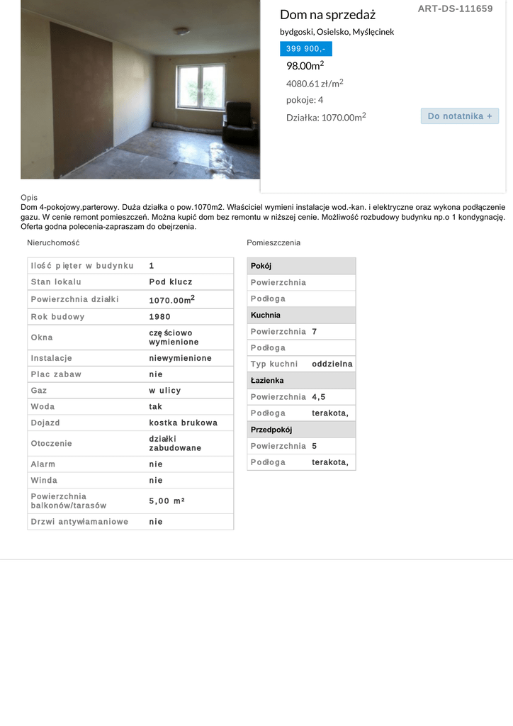 Dom na sprzedaż ART-DS-111659 bydgoski, Osielsko, Myślęcinek 399 900,- 98.00m2 4080.61 zł/m2 pokoje: 4 Działka: 1070.00m2 Do notatnika + Opis Dom 4-pokojowy,parterowy. Duża działka o pow.1070m2. Właściciel wymieni instalacje wod.-kan. i elektryczne oraz wykona podłączenie gazu. W cenie remont pomieszczeń. Można kupić dom bez remontu w niższej cenie. Możliwość rozbudowy budynku np.o 1 kondygnację. Oferta godna polecenia-zapraszam do obejrzenia. Nieruchomość Pomieszczenia I l oś ć p ię t e r w b u d y n k u 1 Pokój Stan lokalu Pod klucz Powierzchnia P o w i e r z c h n i a d z i ał k i 1 0 7 0 . 0 0 m2 P o dł o g a Rok budowy 1980 Kuchnia Okna czę śc i o w o wymienione Powierzchnia 7 Instalacje niewymienione Plac zabaw nie Gaz w ulicy Woda tak Dojazd kostka brukowa Otoczenie d z i ał k i zabudowane Powierzchnia 5 Alarm nie P o dł o g a Winda nie Powierzchnia balkonów/tarasów 5,00 m² D r z w i a n t y wł a m a n i o w e nie P o dł o g a Typ kuchni oddzielna Łazienka Powierzchnia 4 , 5 P o dł o g a terakota, Przedpokój terakota,