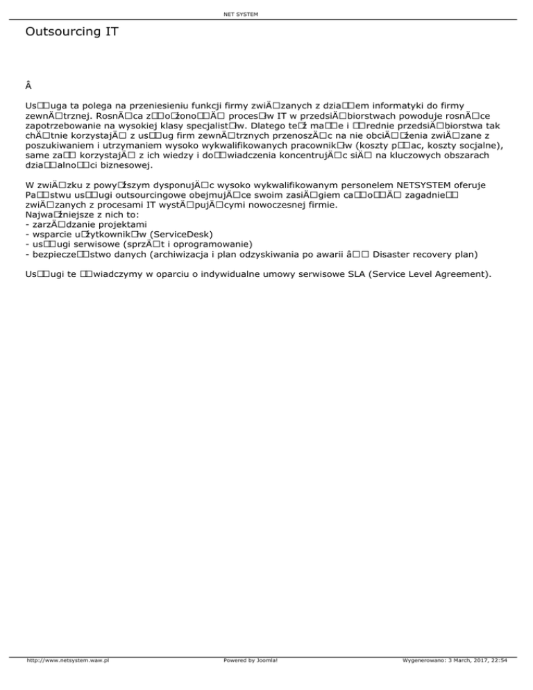 NET SYSTEM Outsourcing IT  UsÅ‚uga ta polega na przeniesieniu funkcji firmy zwiÄ…zanych z dziaÅ‚em informatyki do firmy zewnÄ™trznej. RosnÄ…ca zÅ‚oÅźoność procesÃłw IT w przedsiÄ™biorstwach powoduje rosnÄ…ce zapotrzebowanie na wysokiej klasy specjalistÃłw. Dlatego teÅź maÅ‚e i Å›rednie przedsiÄ™biorstwa tak chÄ™tnie korzystajÄ… z usÅ‚ug firm zewnÄ™trznych przenoszÄ…c na nie obciÄ…Åźenia zwiÄ…zane z poszukiwaniem i utrzymaniem wysoko wykwalifikowanych pracownikÃłw (koszty pÅ‚ac, koszty socjalne), same zaÅ› korzystajÄ… z ich wiedzy i doÅ›wiadczenia koncentrujÄ…c siÄ™ na kluczowych obszarach dziaÅ‚alnoÅ›ci biznesowej. W zwiÄ…zku z powyÅźszym dysponujÄ…c wysoko wykwalifikowanym personelem NETSYSTEM oferuje PaÅ„stwu usÅ‚ugi outsourcingowe obejmujÄ…ce swoim zasiÄ™giem caÅ‚ość zagadnieÅ„ zwiÄ…zanych z procesami IT wystÄ™pujÄ…cymi nowoczesnej firmie. NajwaÅźniejsze z nich to: - zarzÄ…dzanie projektami - wsparcie uÅźytkownikÃłw (ServiceDesk) - usÅ‚ugi serwisowe (sprzÄ™t i oprogramowanie) - bezpieczeÅ„stwo danych (archiwizacja i plan odzyskiwania po awarii – Disaster recovery plan) UsÅ‚ugi te Å›wiadczymy w oparciu o indywidualne umowy serwisowe SLA (Service Level Agreement). http://www.netsystem.waw.pl Powered by Joomla! Wygenerowano: 3 March, 2017, 22:54