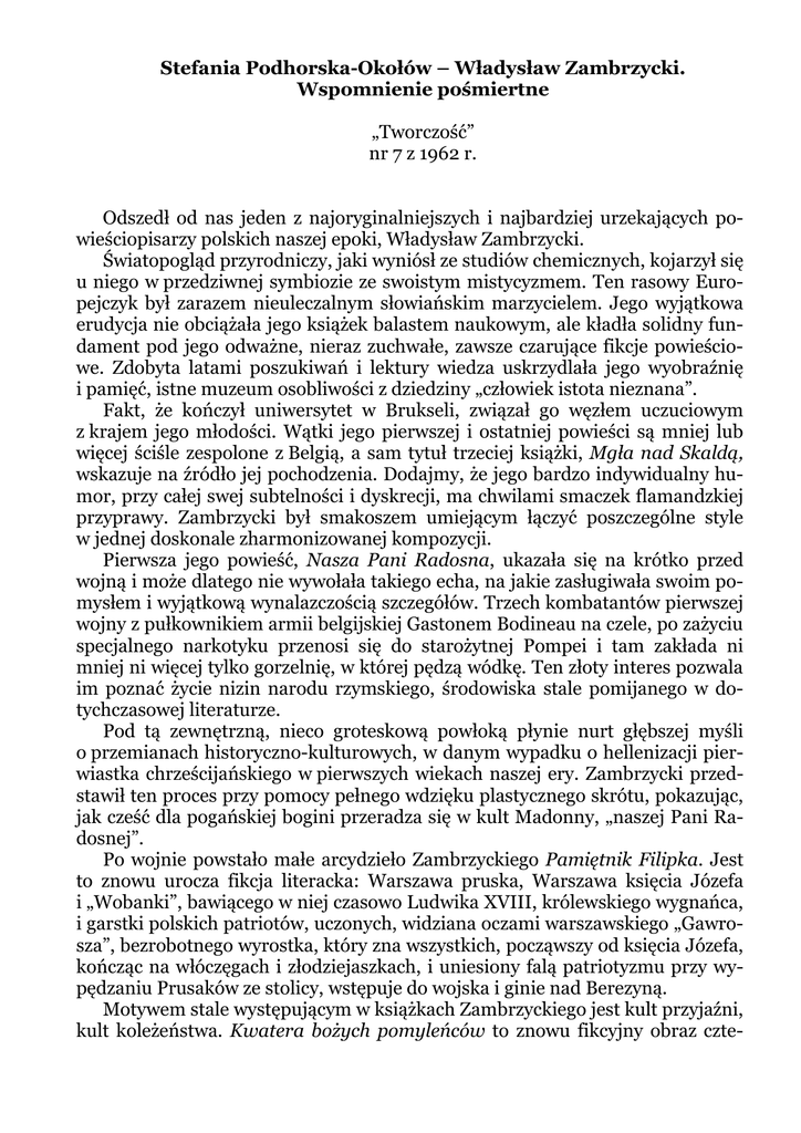 Stefania Podhorska-Okołów – Władysław Zambrzycki. Wspomnienie pośmiertne „Tworczość” nr 7 z 1962 r. Odszedł od nas jeden z najoryginalniejszych i najbardziej urzekających powieściopisarzy polskich naszej epoki, Władysław Zambrzycki. Światopogląd przyrodniczy, jaki wyniósł ze studiów chemicznych, kojarzył się u niego w przedziwnej symbiozie ze swoistym mistycyzmem. Ten rasowy Europejczyk był zarazem nieuleczalnym słowiańskim marzycielem. Jego wyjątkowa erudycja nie obciążała jego książek balastem naukowym, ale kładła solidny fundament pod jego odważne, nieraz zuchwałe, zawsze czarujące fikcje powieściowe. Zdobyta latami poszukiwań i lektury wiedza uskrzydlała jego wyobraźnię i pamięć, istne muzeum osobliwości z dziedziny „człowiek istota nieznana”. Fakt, że kończył uniwersytet w Brukseli, związał go węzłem uczuciowym z krajem jego młodości. Wątki jego pierwszej i ostatniej powieści są mniej lub więcej ściśle zespolone z Belgią, a sam tytuł trzeciej książki, Mgła nad Skaldą, wskazuje na źródło jej pochodzenia. Dodajmy, że jego bardzo indywidualny humor, przy całej swej subtelności i dyskrecji, ma chwilami smaczek flamandzkiej przyprawy. Zambrzycki był smakoszem umiejącym łączyć poszczególne style w jednej doskonale zharmonizowanej kompozycji. Pierwsza jego powieść, Nasza Pani Radosna, ukazała się na krótko przed wojną i może dlatego nie wywołała takiego echa, na jakie zasługiwała swoim pomysłem i wyjątkową wynalazczością szczegółów. Trzech kombatantów pierwszej wojny z pułkownikiem armii belgijskiej Gastonem Bodineau na czele, po zażyciu specjalnego narkotyku przenosi się do starożytnej Pompei i tam zakłada ni mniej ni więcej tylko gorzelnię, w której pędzą wódkę. Ten złoty interes pozwala im poznać życie nizin narodu rzymskiego, środowiska stale pomijanego w dotychczasowej literaturze. Pod tą zewnętrzną, nieco groteskową powłoką płynie nurt głębszej myśli o przemianach historyczno-kulturowych, w danym wypadku o hellenizacji pierwiastka chrześcijańskiego w pierwszych wiekach naszej ery. Zambrzycki przedstawił ten proces przy pomocy pełnego wdzięku plastycznego skrótu, pokazując, jak cześć dla pogańskiej bogini przeradza się w kult Madonny, „naszej Pani Radosnej”. Po wojnie powstało małe arcydzieło Zambrzyckiego Pamiętnik Filipka. Jest to znowu urocza fikcja literacka: Warszawa pruska, Warszawa księcia Józefa i „Wobanki”, bawiącego w niej czasowo Ludwika XVIII, królewskiego wygnańca, i garstki polskich patriotów, uczonych, widziana oczami warszawskiego „Gawrosza”, bezrobotnego wyrostka, który zna wszystkich, począwszy od księcia Józefa, kończąc na włóczęgach i złodziejaszkach, i uniesiony falą patriotyzmu przy wypędzaniu Prusaków ze stolicy, wstępuje do wojska i ginie nad Berezyną. Motywem stale występującym w książkach Zambrzyckiego jest kult przyjaźni, kult koleżeństwa. Kwatera bożych pomyleńców to znowu fikcyjny obraz czte- rech dziwaków, którzy podczas powstania warszawskiego postanowili wyłączyć się z ogólnych zdarzeń, dzieląc się jedynie swymi umiłowanymi maniami intelektualnymi. To daje autorowi okazję do popisu erudycją w sprawach mało znanych. Jest to jakby rozszerzony podręcznik osobliwości w stylu Kto chce niech czyta, działu, który przez szereg lat prowadził pisarz w „Expresie Wieczornym”. Ostatnia praca Zambrzyckiego to Kaskada Franchimont, nawiązująca do studenckich wspomnień autora, urocza opowieść o przygodach w Belgii starego belfra, jego pupila studenta-Polaka i studentki belgijskiej. Czytając tę słoneczną książkę, trudno uwierzyć, że wyszła ona spod pióra człowieka, który, trawiony ciężką chorobą serca, przez kilka lat nie opuszczał swego mieszkania na Saskiej Kępie, a w ostatnich miesiącach i szpitalnego łóżka. Pociechą były mu książki. Umiejętnością czerpania z nich i przetwarzania materiałów w nich zawartych przypominał Anatola France’a, bez zjadliwości francuskiego sceptyka.