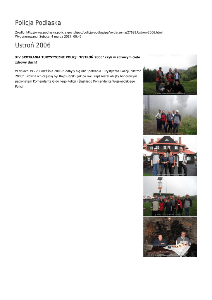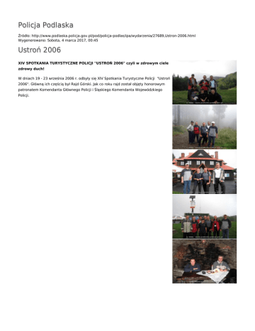 Policja Podlaska Źródło: http://www.podlaska.policja.gov.pl/pod/policja-podlas/ipa/wydarzenia/27689,Ustron-2006.html Wygenerowano: Sobota, 4 marca 2017, 00:45 Ustroń 2006 XIV SPOTKANIA TURYSTYCZNE POLICJI "USTROŃ 2006" czyli w zdrowym ciele zdrowy duch! W dniach 19 - 23 września 2006 r. odbyły się XIV Spotkania Turystyczne Policji "Ustroń 2006". Główną ich częścią był Rajd Górski. Jak co roku rajd został objęty honorowym patronatem Komendanta Głównego Policji i Śląskiego Komendanta Wojewódzkiego Policji. Organizatorzy XIV SPOTKAŃ TURYSTYCZNYCH POLICJI "USTROŃ 2006" to: Komisja Turystyki Rady Kultury Fizycznej przy Ministrze Spraw Wewnętrznych i Administracji, Zarząd Główny NSZZ Policjantów, Komisja Działalności w Miejscu Zamieszkania i Zakładzie Pracy Zarządu Głównego PTTK i Zarząd Oddziału PTTK w Kaliszu. Celem rajdu było doskonalenie umiejętności uprawiania turystyki górskiej - pieszej i rowerowej poprzez podnoszenie sprawności fizycznej, orientowanie się w terenie górskim, poznawanie piękna przyrody i kultury regionalnej Beskidu Śląskiego. W tegorocznej edycji Policyjnego Rajdu Górskiego udział wzięło 187 osób reprezentujących Policję, Straż Graniczną, ABW, PTTK, a także emeryci i renciści MSWiA. Rajd miał charakter imprezy otwartej – brały w nim udział także osoby niezwiązane z pracą w resorcie. U Komandora Rajdu Grzegorza Serbakowskiego zarejestrowało się łącznie 30 drużyn pieszych i jedna rowerowa. Resortowe drużyny pochodzące z różnych stron Polski występowały pod ciekawymi (nieraz wesoło brzmiącymi) nazwami: "Misie", "Kontra", "Tylko dla Orłów" KSP Warszawa, "Sami Swoi", "Trampol", "Szwendaczki" KPP Sieradz, "Kujawiak", "Dolnoślązacy", "Plasino", "Kormoran" KPP Giżycko, "Fregata", "Resorciaki", "Radar", "Emerki", "KWP Białystok - SKOK". Z Białegostoku wystąpiły dwie drużyny. Pierwszą z nich o nazwie "CBŚ KGP -IPA BIAŁYSTOK" tworzyli : Eligiusz Kubicki, Janusz Małyszko, Robert Kuśmierczyk, Leszek Skrodzki, zaś drugą drużynę o nazwie "KWP Białystok -SKOK" reprezentowali: Stanisław Dworakowski ( z KP II w Białymstoku), Zoja Olesiuk, Walery Jankowski, Piotr Kuźmicki i Stefan Kuźmicki. Organizatorzy Spotkań Turystycznych Policji zadbali o wygody miłośników górskich wędrówek i zakwaterowali nas w przepięknie położonym sanatoryjno uzdrowiskowym miasteczku Ustroń - Jaszowiec w Domu Wypoczynkowym "NAUCZYCIEL" przy ul. Wczasowej 21 położonym w dolinie Wisły, między Małą Czantorią (864 m) a Równicą (883 m). Dogodne położenie kwatery na skrzyżowaniu szlaków turystycznych stanowiło doskonałą bazę wypadową w góry Beskidu Śląskiego. To teren mocno zalesiony, licznie zaludniony, dysponujący wygodną siecią komunikacji drogowej i kolejowej, posiadający świetną bazę noclegową, liczne przejścia graniczne i niezwykle barwną historię. Rajd górski zorganizowany pod koniec lata zaoferował nam tego roku zmienną pogodę, jednak każdego dnia, po smacznym śniadaniu, drużyny punktualnie wyruszały na wyznaczone, świetnie oznakowane szlaki. Górskie trasy były prawdziwym wyzwaniem dla naszej debiutującej delegacji o nazwie: "CBŚ KGP -IPA Białystok". Większość jej składu stanowiły osoby, które po raz pierwszy stanęły do tego typu koleżeńskiej rywalizacji sportowej. Ostre podejścia, otarcia stóp, bóle stawów i mięśni i zmęczenie nie były w stanie zniechęcić naszej zgranej drużyny przed pokonywaniem kolejnych etapów pieszych wycieczek. Zgodnie z planami organizatorów meldowaliśmy się na punktach kontrolnych, w których wymagający sędziowie rygorystycznie sprawdzali wiedzę z zakresu policyjnej służby, regulaminu, historii Beskidu Śląskiego oraz niezbędnego wyposażenia turystycznego. Szybko zgraliśmy się z szumem melancholijnie szumiących świerków, jodeł i buków skupionych w Rezerwatach Przyrody takich jak: "Barania Góra", "Czantoria", "Wisła". Obcowanie z naturą uspakajało nasze skołatane codzienną służbą nerwy i zacierało w pamięci wizerunki niektórych byłych przełożonych. Co pewien czas schodziliśmy jednak z trasy, aby posilić się malinami, czarnymi jagodami i jeżynami, których wygląd cieszył nasze oczy, zaś ich cudowny smak zachwycał. Bajeczne widoki rozpościerające się ze szczytów Równicy (884m n.p.m), Wielkiego Stożka (978m n.p.m.) i Czantorii Wielkiej były ukoronowaniem naszych wielogodzinnych wędrówek górskich. Smak doskonałej kuchni czeskiej i napojów chłodzących w cieniu parasoli na szczycie Czantorii pozwolił zregenerować siły. Podczas delektowania się wybornym jadłem naszych południowych przyjaciół oddawaliśmy się historycznym refleksjom. Przypominaliśmy sobie piękną kartę historii przyjaźni polsko-czeskiej, zwłaszcza czasy istnienia na tym terenie Księstwa Cieszyńskiego. Warunki były ku temu bardzo sprzyjające, ponieważ udało się nam przemierzyć historyczny, wiodący przez Czantorię Wielką tzw. "Szlak Rycerski", stanowiący odwieczny trakt łączący niegdyś nasze dwa spokrewnione narody. Magiczny charakter tego miejsca sprawiał, że w każdym z nas uzewnętrzniły się najlepsze cechy, świadczące o tym że jesteśmy spadkobiercami tradycji rycerskiej. Niepodważalnym potwierdzeniem tej tezy są przypisane herby naszych przodków: Ślepowron, Sas, Abdank, jak również rodzinne legendy. To szerokie spojrzenie z perspektywy minionych wieków pozwoliło nam na wysnucie filozoficznej refleksji i zarazem umożliwiło podjęcie wysiłku odpowiedzi na pytania odwiecznie nurtujące ludzkość: skąd jesteśmy i dokąd zmierzamy. Dziś mało kto przywiązuje do tego wagę, ale przecież historia tworzy się w naszej obecności. Bo przecież to co dla nas teraz jest historią, niegdyś było rzeczywistością przodków, tak nasza teraźniejszość stanie się historią dla potomnych. Sporym zaskoczeniem okazała się dla nas wiadomość o zabytku 
