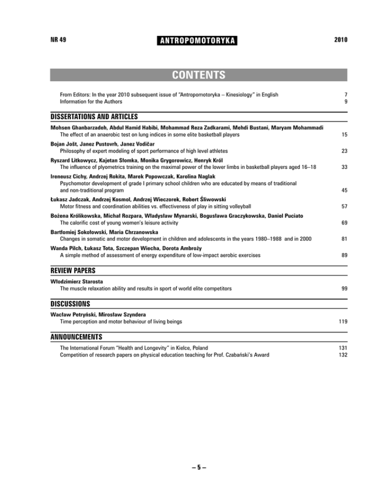 NR 49 AN TRO PO MO TO RY KA 2010 CONTENTS From Editors: In the year 2010 subsequent issue of “Antropomotoryka – Kinesiology” in English Information for the Authors 7 9 DISSERTATIONS AND ARTICLES Mohsen Ghanbarzadeh, Abdul Hamid Habibi, Mohammad Reza Zadkarami, Mehdi Bustani, Maryam Mohammadi The effect of an anaerobic test on lung indices in some elite basketball players 15 Bojan Jošt, Janez Pustovrh, Janez Vodiar Philosophy of expert modeling of sport performance of high level athletes 23 Ryszard Litkowycz, Kajetan Somka, Monika Grygorowicz, Henryk Król The influence of plyometrics training on the maximal power of the lower limbs in basketball players aged 16–18 33 Ireneusz Cichy, Andrzej Rokita, Marek Popowczak, Karolina Naglak Psychomotor development of grade I primary school children who are educated by means of traditional and non-traditional program 45 ukasz Jadczak, Andrzej Kosmol, Andrzej Wieczorek, Robert liwowski Motor fitness and coordination abilities vs. effectiveness of play in sitting volleyball 57 Boena Królikowska, Micha Rozpara, Wadysaw Mynarski, Bogusawa Graczykowska, Daniel Puciato The calorific cost of young women’s leisure activity 69 Bartomiej Sokoowski, Maria Chrzanowska Changes in somatic and motor development in children and adolescents in the years 1980–1988 and in 2000 81 Wanda Pilch, ukasz Tota, Szczepan Wiecha, Dorota Ambroy A simple method of assessment of energy expenditure of low-impact aerobic exercises 89 REVIEW PAPERS Wodzimierz Starosta The muscle relaxation ability and results in sport of world elite competitors 99 DISCUSSIONS Wacaw Petryski, Mirosaw Szyndera Time perception and motor behaviour of living beings 119 ANNOUNCEMENTS The International Forum “Health and Longevity” in Kielce, Poland Competition of research papers on physical education teaching for Prof. Czabaski’s Award –5– 131 132 NR 49 AN TRO PO MO TO RY KA 2010 SPIS TREŚCI Od Redakcji: W roku 2010 kolejny numer czasopisma „Antropomotoryka – Kinesiology” po angielsku Informacje dla Autorów 7 11 ROZPRAWY I ARTYKUŁY Mohsen Ghanbarzadeh, Abdul Hamid Habibi, Mohammad Reza Zadkarami, Mehdi Bustani, Maryam Mohammadi Wpyw testu wydolnoci beztlenowej RAST na wskaniki czynnoci puc u koszykarzy wysokiego wyczynu 15 Bojan Jošt, Janez Pustovrh, Janez Vodiar Filozofia eksperckiego modelowania wystpu sportowego wysokiego wyczynu 23 Ryszard Litkowycz, Kajetan Somka, Monika Grygorowicz, Henryk Król Wpyw treningu plajometrycznego na popraw poziomu siy eksplozywnej koczyn dolnych u koszykarzy w wieku 16–18 lat 33 Ireneusz Cichy, Andrzej Rokita, Marek Popowczak, Karolina Naglak Rozwój psychomotoryczny uczniów pierwszej klasy szkoy podstawowej edukowanych programem tradycyjnym i nietradycyjnym 45 ukasz Jadczak, Andrzej Kosmol, Andrzej Wieczorek, Robert liwowski Sprawno motoryczna i zdolnoci koordynacyjne a skuteczno gry w siatkówce na siedzco 57 Boena Królikowska, Micha Rozpara, Wadysaw Mynarski, Bogusawa Graczykowska, Daniel Puciato Koszt kaloryczny aktywnoci wolnoczasowej modych kobiet 69 Bartomiej Sokoowski, Maria Chrzanowska Zmiany w rozwoju somatycznym i motorycznym u dzieci i modziey w latach 1980–1988 i w roku 2000 81 Wanda Pilch, ukasz Tota, Szczepan Wiecha, Dorota Ambroy Prosta ocena wydatku energetycznego aerobiku typu low-impact 89 PRACE PRZEGLĄDOWE Wodzimierz Starosta Zdolno rozluniania mini a wyniki sportowe zawodników wiatowej elity 99 POLEMIKI I DYSKUSJE Wacaw Petryski, Mirosaw Szyndera Postrzeganie czasu a zachowanie ruchowe istot ywych 119 INFORMACJE Midzynarodowe Forum „Zdrowie i dugowieczno”, Kielce, 20–22 maja 2010 131 Konkurs publikacji naukowych z zakresu dydaktyki wychowania fizycznego o Nagrod Profesora Bogdana Czabaskiego 132 –6–