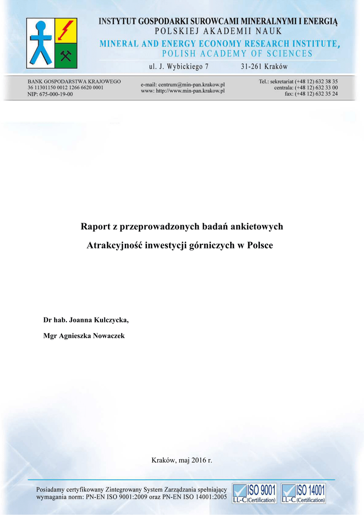 Raport z przeprowadzonych badań ankietowych Atrakcyjność inwestycji górniczych w Polsce Dr hab. Joanna Kulczycka, Mgr Agnieszka Nowaczek Kraków, maj 2016 r. Wprowadzenie Atrakcyjność inwestycyjna to zgodnie z definicją zdolność do skłonienia inwestorów do wyboru danego miejsca celem ulokowania inwestycji [1]. Pojęcie atrakcyjności inwestycyjnej jest ściśle powiązane z pojęciem konkurencyjności danego obszaru, co oznacza zdolność do osiągania sukcesu w rywalizacji gospodarczej. W regionalnym wymiarze konkurencyjności gospodarki, podkreślić należy fakt przebiegu całego procesu w przestrzenni, rozpatrując go równolegle na płaszczyźnie światowej, kontynentalnej, krajowej a także regionalnej i lokalnej [2]. Najczęściej konkurencyjność rozumiana jest jako zdolność przedsiębiorstw, gałęzi gospodarki, regionów, państw oraz regionów ponadnarodowych do generowania relatywnie wysokich dochodów i zapewnienia wysokiego poziomu zatrudnienia w warunkach międzynarodowej konkurencji. 1. METODOLOGIA BADAŃ Instytut Gospodarki Surowcami Mineralnymi i Energią PAN w Krakowie wraz ze Związkiem Pracodawców Polska Miedź w Lubinie przeprowadził badania dotyczące poziomu atrakcyjności inwestycji w sektorze wydobywczym. Badania prowadzone były od listopada 2015 roku do maja 2016 roku na próbie badawczej 165 respondentów. Jako narzędzie badawcze wybrano kwestionariusz ankiety ponieważ umożliwia on ilościową i jakościową analizę dostarczonego materiału. Ankieta podzielona jest na trzy części, a w każdej z nich znajduje się kilkanaście pytań, które są oceniane na podstawie skali Likerta. Wybrano formę pytań i odpowiedzi pozwalającą ocenić „siłę poparcia” danego poglądu. Skala składa się z pięciu kategorii odpowiedzi („zdecydowanie się zgadzam”, „zgadzam się”, „trudno powiedzieć”, „nie zgadzam się”, „zdecydowanie się nie zgadzam”). Skala określa trudność/łatwość twierdzeń dotyczących sektora wydobywczego. Dodatkowo zostały umieszczone dwa pytania otwarte, w których respondenci mogą udzielić dłuższej odpowiedzi. Pytania otwarte dotyczą wskazania innych czynników wpływających na atrakcyjności inwestycji oraz problemów dotyczących inwestowania w górnictwo. W ankiecie zamieszczono również pytania o wielkość i rodzaj prowadzonej działalności oraz prowadzenie inwestycji poza granicami kraju. Respondentami byli przedstawiciele kadry zarządzającej różnych szczebli przedsiębiorstw wydobywczych i poszukiwawczych, jak również przedstawiciele firm konsultingowych, instytucji finansowych i naukowo – 2 badawczych oraz administracji publicznej i organizacji pozarządowych. Ankieta została rozesłana drogą mailową oraz umieszczona na stronie internetowej. Respondenci mogli również wybrać formę „on line” dla wypełnienia kwestionariusza. Głównym celem projektu było określenie poziomu atrakcyjności inwestycji w sektorze wydobywczym oraz zidentyfikowanie najlepszych praktyk technologicznych, prawnych, środowiskowych i społecznych dotyczących pozyskiwania surowców mineralnych w Polsce. Realizacja badania ankietowego stanowi próbę zdiagnozowania podstawowych czynników decydujących o atrakcyjności inwestycji w sektorze wydobywczym, a także wskazania barier z jakimi muszą spotkać się inwestorzy z przemysłu wydobywczego. 2. WYNIKI BADAŃ W prowadzonym badaniu największy udział miały podmioty prowadzące działalność wydobywczą (34%), poszukiwawczą (26%) oraz firmy doradcze/ konsultingowe (14,5%). Instytucje naukowe w szczególności uczelnie wyższe stanowiły 12% badanych, a instytucje finansowe 5,5%. Na ankietę odpowiedziało 3% przedstawicieli administracji państwowej i samorządowej. Wspomnieć należy, że uzyskane odpowiedzi pochodzą z Urzędów Marszałkowskich kilku województw Polski, co ma znaczenie ze względów atrakcyjności inwestycji górniczych na danym regionie. Jako inną działalność (1%) respondenci najczęściej podawali działalność związaną z usługami dla górnictwa. Organizacje pozarządowe również stanowiły 1% badanych podmiotów. 34% Działalność wydobywcza 26% Działaność poszukiwawcza 14,5% Firma doradcza 12% Instytucja naukowa 5,5% Instytucja finansowa Administracja samorządowa 3% Administracja państwowa 3% Organizacja pozarządowa 1% Inna działalność 1% 0% 10% 20% Rys.1. Podmioty biorące udział w badaniu 3 30% 40% Na ankietę najczęściej odpowiadali przedstawiciele firmy na szczeblu specjalisty (36%) oraz przedstawiciele managementu (18%). Respondenci wybierający odpowiedź „inne stanowisko” najczęściej podawali stanowiska techniczne (16%). Na ankietę odpowiedziało tylko 15% członków organu zarządczego i 16% ankietowanych zajmujących stanowisko kierownicze. kierownik 16% organ zarządczy 15% 16% stanowisko techniczne przedstawiciel managmentu 18% 36% specjalista 0% 5% 10% 15% 20% 25% 30% 35% 40% Rys. 2. Pozycje osób ankietowanych W ankiecie zawarte zostały pytania dotyczące min: źródła finansowania przedsiębiorstwa, udziału Skarbu Państwa, wielkość zatrudnienia oraz wysokość zaangażowanych środków finansowych w działalność poszukiwawczą bądź wydobywczą. Respondenci niechętnie udzielali odpowiedzi na wyżej wymienione pytania. Tylko 20% ankietowanych udzieliło odpowiedzi dotyczącej źródła finasowania, z czego ponad 17% stanowiły firmy z kapitałem krajowym i bez udziału skarbu państwa. 12% ankietowanych przedsiębiorstw to firmy zatrudniające od 31 do 100 pracowników. Zdecydowana większość przedsiębiorstw to firmy z długoletnią tradycją wydobywczą, poszukiwawczą i rozpoznawczą. Respondenci najczęściej podwali kopaliny wydobywane lub przerabiane takie jak: węgiel kamienny 23%, węgiel brunatny 21%, rudy metali 18% oraz surowce skalne 14% (najczęściej wymieniany surowiec to bazalt). Polska pod względem ilości zasobów surowców mineralnych na