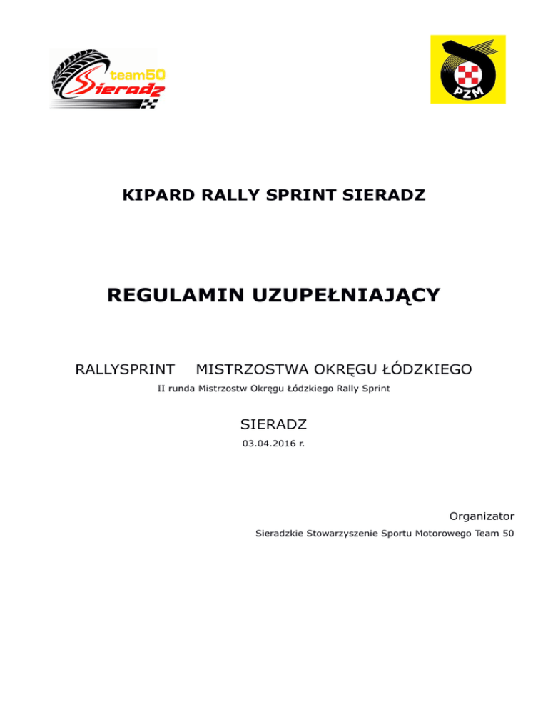 KIPARD RALLY SPRINT SIERADZ REGULAMIN UZUPEŁNIAJĄCY RALLYSPRINT MISTRZOSTWA OKRĘGU ŁÓDZKIEGO II runda Mistrzostw Okręgu Łódzkiego Rally Sprint SIERADZ 03.04.2016 r. Organizator Sieradzkie Stowarzyszenie Sportu Motorowego Team 50 SPIS TREŚCI: 1. USTALENIA OGÓLNE 2. ORGANIZACJA 3. ZGŁOSZENIA 4. UBEZPIECZENIE 5. NUMERY IDENTYFIKACYJNE 6. REKLAMA 7. ODBIÓR ADMINISTRACYJNY 8. ZAPOZNANIE Z TRASĄ 9. BADANIA KONTROLNE 10. OPONY 11. ODPRAWA UCZESTNIKÓW 12. PRZEBIEG IMPREZY 13. PROCEDURA STARTU 14. POMIAR CZASU 15. META RALLYSPRINTU 16. BEZPIECZEŃSTWO 17. IDENTYFIKACJA OSÓB OFICJALNYCH PODCZAS RALLYSPRINTU 18. NAGRODY 19. PROTESTY 20. KARY 21. POSTANOWIENIA KOŃCOWE • Rallysprint zostanie przeprowadzony zgodnie z postanowieniami: • Międzynarodowego Kodeksu Sportowego FIA, • Regulaminu Konkursowej Jazdy Samochodem, • Regulaminu Ochrony Środowiska w Sportach Motorowych, • Ustawy „Prawo o ruchu drogowym”, • Niniejszego regulaminu uzupełniającego. • Regulaminu ramowego Mistrzostw Okręgu Łódzkiego w Rally Sprincie wraz z załącznikami Modyfikacje, zmiany i/lub uzupełnienia do niniejszego regulaminu uzupełniającego będą publikowane wyłącznie w numerowanych i datowanych komunikatach ogłaszanych przez organizatora lub ZSS. • Otwarcie listy zgłoszeń 21.03.2016 r. godzina 24:00 • Zamknięcie listy zgłoszeń 30.03.2016 r. godzina 24:00 • Odbiór administracyjny dla zawodników mieszkających do 15 km od Sieradza obowiązkowy w dniu 02.04.2016 r. od godziny 16:00 do 17:00 w biurze rajdu, dla reszty zawodników w dniu 03.04.2016 r. od godziny 7:00 do 8:00 w biurze rajdu. Ponadto dla wszystkich chętnych zawodników odbiór administracyjny jest możliwy(zalecany) także w dniu 02.04.2016 r. w godzinach 16:00 – 17:00 Wybrany termin OA proszę podać w zgłoszeniu. • Badanie kontrolne BK 1 dla zawodników mieszkających do 15 km od Sieradza obowiązkowe w dniu 02.04.2016 r. od godziny 16:00 do 17:00 w biurze rajdu, dla reszty zawodników w dniu 03.04.2016 r. od godziny 7:00 do 8:00 w biurze rajdu. Ponadto dla wszystkich chętnych zawodników BK 1 jest możliwe (zalecane) także w dniu 02.04.2016 r. w godzinach 16:00 – 17:00 • Pierwsze posiedzenie ZSS 03.04.2016 r. godz. 9:10 • Odprawa uczestników 03.04.2016 r. godz. 9:30 park przedstartowy • Publikacja listy załóg dopuszczonych do startu 03.04.2016 r. godz. 9:40 park przedstartowy • Start 03.04.2016 r. godz.10:00 • Meta 03.04.2016 • Końcowe badanie kontrolne organizator nie przewiduje • Opublikowanie końcowej klasyfikacji prowizorycznej 03.04.2016 godz. 16:30 • Rozdanie nagród 03.04.2016 godz. 17:30 godz. 15:30 1. USTALENIA OGÓLNE 1.1. Miejsce i termin imprezy Impreza odbędzie się w dniu 03.04.2016 r. na terenie MPK Sieradz, Hurtownia Elektryk, Sklep Arsen, Szwed Meble Sieradz, wjazd od ul. Jana Pawła II 63 1.2. Nazwa i ranga imprezy KipArd Rally Sprint Sieradz rozgrywany jest jako II Runda Mistrzostw Okręgu Łódzkiego w Rally Sprincie 1.3. Numer wizy ZO PZM Numer wizy 9/2016 wydana przez OKSS PZM w Łodzi w dniu 17.03.2016 r. 1.4. Lokalizacja biura W dniu imprezy pod adresem Lokajskiego 1/12, 98-200 Sieradz w godzinach 7:00 – 9:30 W Sobotę tj. 02.04.2016 r. w godzinach 16:00 – 17:00 1.5. Lokalizacja startu, mety Start – 98-200 Sieradz Jana Pawła II 63 godz. 10:00 Obowiązuje park przedstartowy, wjazd do godziny 9:20 Do parku przedstartowego obowiązuje zakaz wjazdu lawet!!!!! Meta – 98-200 Sieradz Jana Pawła II 63b godz. 15:30 1.6. Charakterystyka Impreza zostanie przeprowadzona w ciągu jednego dnia i składa z 1 sekcji. Na trasie zlokalizowane będzie jedna próba, pokonywana 3 razy Nawierzchnia trasy i prób : asfalt, kostka, Długość próby: 2,35 km 2. ORGANIZACJA 2.1. Nazwa organizatora Sieradzkie Stowarzyszenie Sportu Motorowego Team 50 współorganizator Automobilklub Łódzki 2.2. Adres Sieradzkie Stowarzyszenie Sportu Motorowego Team 50 98-200 Sieradz, ul. Lokajskiego 1/12 tel: 509-075-983 e-mail: [email protected] 2.3. Władze Rallysprint 2.3.1. Zespół Sędziów Sportowych Przewodniczący Bartłomiej Archman 2.3.2. Osoby oficjalne Dyrektor Imprezy Marek Wojtanka Kierownik trasy i bezpieczeństwa Patryk Dąbrowski Kierownik biura Arkadiusz Lechowicz Kierownik komisji obliczeń Adam Wojtanka Delegat techniczny ZO PZM w Łodzi Tomasz Łysoniewski Kierownik badań kontrolnych Artur Majewski Komisarz ds. ochrony środowiska Piotr Płaczek Kierownik pomiaru czasu Mirosław Kister 3. ZGŁOSZENIA 3.1. Załoga 3.1.1. Załogę stanowi kierowca z lub bez pilota 3.1.2. Kierowca nie może posiadać jakiejkolwiek licencji kierowcy sportu samochodowego w rozumieniu przepisów Polskiego Związku Motorowego, za wyjątkiem zawodników posiadających licencję, wymienionych w art. 1.1 regulaminu ramowego KJS. 3.1.3. Pilot nie może prowadzić samochodu podczas imprezy. W przypadku stwierdzenia prowadzenia samochodu przez pilota, załoga zostanie wykluczona. 3.2. Obowiązki załogi Do obowiązków załogi należy: 3.2.1. Obecność na odprawie uczestników 3.2.2Przejechanie trasy Rallysprint zgodnie z harmonogramem ogłoszonym przez organizatora w kolejności oraz kierunku zgodnym z dokumentami dostarczonymi przez organizatora, 3.2.3. Odbycie wszystkich prób w zapiętych pasach bezpieczeństwa, zapiętych kaskach ochronnych, z włączonymi światłami mijania lub światłami do jazdy dziennej oraz zamkniętymi szybami i szyberdachem. Nieprzestrzeganie powyższych przepisów pociągnie za sobą karę do wykluczenia włącznie. 3.3. Procedura zgłoszeń 3.3.1. Uczestnik zamierzający wziąć udział w Rally Sprincie musi wypełnione zgłoszenie przesłać do dnia 30.03.2016 do godz. 24:00 na adres: e-mail: [email protected] Zgłoszenie dostępne na stronie www.team50.pl Organizator przewiduje możliwość złożenia zgłoszenia w dniu imprezy w biurze, w przypadku zwolnienia się miejsca na liście startowej bądź niepełnej listy startowej. 3.3.2. Jeżeli zgłoszen