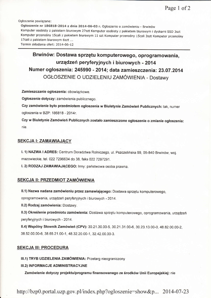 Page 1 of2 ogłoszenie poWiązane: ogłoszenie nr 1a6818-2o14 ż duia 2014-06-03 r. ogłoszenie o zamóWieniu - BrWinóW Komputer osobisty z pakietem biurowym 27szt Komputer osobisty z pakietem biurowym i dyskami ssD 3szt Komputer przenoŚny 15cali z pakietem biurowym 11 szt Komputer przenośny1scali 3szt Komputer przenośny 17cali z pakietem biurowym 65zt.,. Termin składania ofert; 2014-06-12 przętu kom puterowego, oprog ramowa n ia, urządzeń peryferyjnych i biurowych - 2014 Numer ogłoszenia: 245990 - 2014; data zamieszczenaai 23.07.2014 OGŁOSZEN|E O UDZ|ELEN|U ZAMOW|ENIA - Dostawy Brwi n ów: Dostawa s Zamieszczanie ogłoszenia: obowiązkowe. ogłoszenie dotyczy: zamóWienia publicznego. Czy zamówienie było przedmiotem ogłoszenia W Biuletynie zamóWień Pub|icznych: tak, numer ogłoszenia w BZP: 186818 - 2o14r. CzY W Biuletynie Zamówień Publicznych zostało zamieszczone ogłoszenie o zmianie ogłoszenia: n ie. SEKCJA l, l: ZAMAW|AJACY 1)NAZWA lADRES: Centrum Doradztwa Rolniczego. ul. Pszczelińska 99, o5-84o BrWinóW, Woj. mazowieckie, te|. 022 7296634 do 38, faks 022 7297291. l. 2) RoDzAJ zAMAWlAJĄcEGo: lnny: państwowa osoba prawna. l1.1) Nazwa nadana zamóWieniu przez zamawiającego: Dostawa spźętu komputerowego, oprogramowania, urządzeń peryferyjnych i biurowych - 2014. l1.2) Rodzaj zamówienia: Dostawy, 11,3) Określenie plzedmiotu zamówienia: Dostawa spżętu komputerowego, oprogramowania, użądzeń peryferyjnych i biurowych - 2014, l1.4) Wspólny Słownik Zamówień (CPV): 30.21 ,30.00-5, 30.21 ,31 ,00-6, 30,23.13,oo-o, 48.82,0o.oo-2, 38,52,00.00-6, 38.65.21.00-1, 48.32.20.00-1, 32,42,00.00_3. SEKCJA lll: PROCEDURA ll1.1) TRYB UDzlELENlA zAMÓwerull: ll1.2) lNFoRMAcJE ADMlNlsTRAcYJNE Pzetarg nieograniczony zamówienie dotyczy projektu/programu finansowanego ze środkóW Unii Europeiskiej: nie http:llbzpO.portal.uzp.gov.pl/index.php?ogloszenie:show&p.,. 20I4-07-23 Page2 ofŻ SEKCJA lV: UDZ|ELEN|E ZAMOW|ENlA lv.1) DATA UDZIELENlA lV.2) zAMóweHn: LlczBA oTRZYMANYCH oFERT: 22.07.2014. 18, lV.3) L|CZBA ODRZUCONYCH OFERT; 5. lV.4) NAZWA l ADRES WYKoNAWCY, KTÓREMU UDzlELoNo ZAMÓWEN|A: FORT| Klzysztof Jurek, ul. M,C, Skłodowskiej 181204,26-600 Radom, ką/woj. mazowieckie. lv.s) szacunkowa WańośćzamóWienia (bez yAI): 166062,00 PLN, lv.6) lNFoRMAcJA o cENlE WYBRANEJ oFERTY oRAz o oFERTACH z NAJNlŻszĄ l NAJWYZSZĄCENĄ Cena wybranej oferty; 167956,50 ofeńa z najniższą ceną: 159900,00 / ofeńa z najwyższą ceną: 233842,72 Waluta: PLN- http:lhzpO.portal.uzp.gov.pl/index,php?ogloszenie:show&p... 201,4-07-23