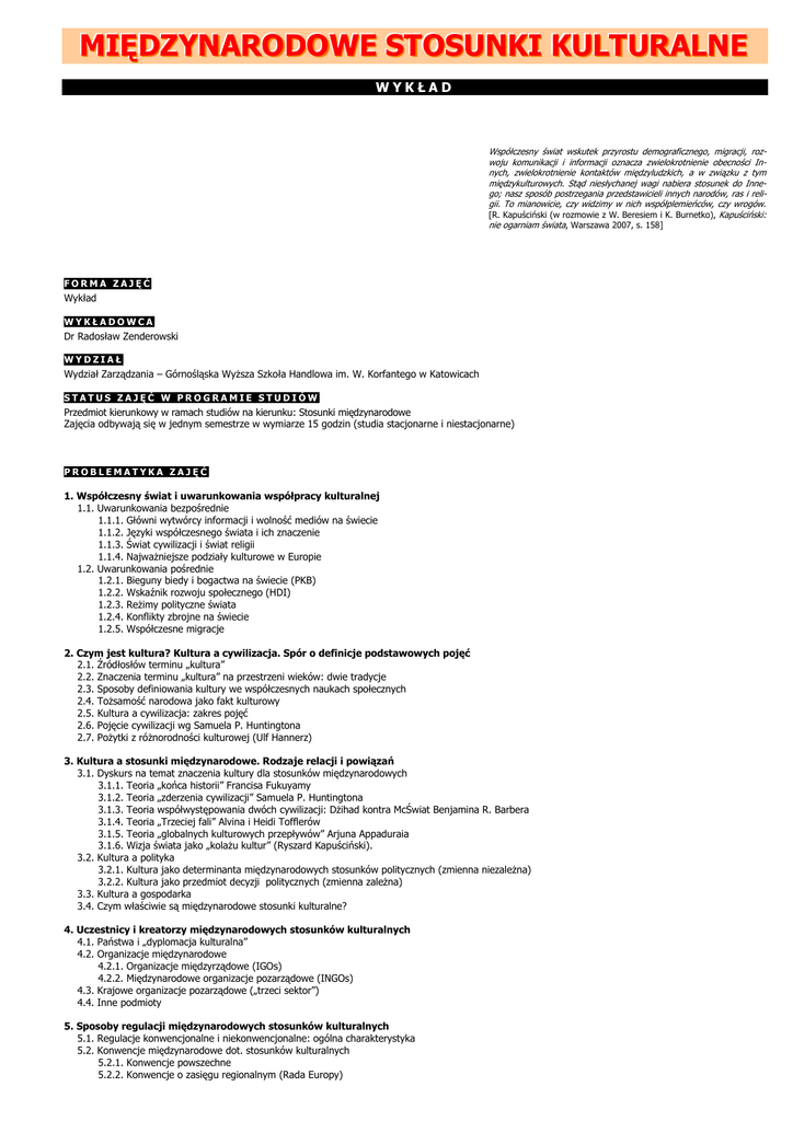 MIĘDZYNARODOWE STOSUNKI KULTURALNE WYKŁAD Współczesny świat wskutek przyrostu demograficznego, migracji, rozwoju komunikacji i informacji oznacza zwielokrotnienie obecności Innych, zwielokrotnienie kontaktów międzyludzkich, a w związku z tym międzykulturowych. Stąd niesłychanej wagi nabiera stosunek do Innego; nasz sposób postrzegania przedstawicieli innych narodów, ras i religii. To mianowicie, czy widzimy w nich współplemieńców, czy wrogów. [R. Kapuściński (w rozmowie z W. Beresiem i K. Burnetko), Kapuściński: nie ogarniam świata, Warszawa 2007, s. 158] FORMA ZAJĘĆ Wykład WYKŁADOWCA Dr Radosław Zenderowski WYDZIAŁ Wydział Zarządzania – Górnośląska Wyższa Szkoła Handlowa im. W. Korfantego w Katowicach STATUS ZAJĘĆ W PROGRAMIE STUDIÓW Przedmiot kierunkowy w ramach studiów na kierunku: Stosunki międzynarodowe Zajęcia odbywają się w jednym semestrze w wymiarze 15 godzin (studia stacjonarne i niestacjonarne) PROBLEMATYKA ZAJĘĆ 1. Współczesny świat i uwarunkowania współpracy kulturalnej 1.1. Uwarunkowania bezpośrednie 1.1.1. Główni wytwórcy informacji i wolność mediów na świecie 1.1.2. Języki współczesnego świata i ich znaczenie 1.1.3. Świat cywilizacji i świat religii 1.1.4. Najważniejsze podziały kulturowe w Europie 1.2. Uwarunkowania pośrednie 1.2.1. Bieguny biedy i bogactwa na świecie (PKB) 1.2.2. Wskaźnik rozwoju społecznego (HDI) 1.2.3. Reżimy polityczne świata 1.2.4. Konflikty zbrojne na świecie 1.2.5. Współczesne migracje 2. Czym jest kultura? Kultura a cywilizacja. Spór o definicje podstawowych pojęć 2.1. Źródłosłów terminu „kultura” 2.2. Znaczenia terminu „kultura” na przestrzeni wieków: dwie tradycje 2.3. Sposoby definiowania kultury we współczesnych naukach społecznych 2.4. Tożsamość narodowa jako fakt kulturowy 2.5. Kultura a cywilizacja: zakres pojęć 2.6. Pojęcie cywilizacji wg Samuela P. Huntingtona 2.7. Pożytki z różnorodności kulturowej (Ulf Hannerz) 3. Kultura a stosunki międzynarodowe. Rodzaje relacji i powiązań 3.1. Dyskurs na temat znaczenia kultury dla stosunków międzynarodowych 3.1.1. Teoria „końca historii” Francisa Fukuyamy 3.1.2. Teoria „zderzenia cywilizacji” Samuela P. Huntingtona 3.1.3. Teoria współwystępowania dwóch cywilizacji: Dżihad kontra McŚwiat Benjamina R. Barbera 3.1.4. Teoria „Trzeciej fali” Alvina i Heidi Tofflerów 3.1.5. Teoria „globalnych kulturowych przepływów” Arjuna Appaduraia 3.1.6. Wizja świata jako „kolażu kultur” (Ryszard Kapuściński). 3.2. Kultura a polityka 3.2.1. Kultura jako determinanta międzynarodowych stosunków politycznych (zmienna niezależna) 3.2.2. Kultura jako przedmiot decyzji politycznych (zmienna zależna) 3.3. Kultura a gospodarka 3.4. Czym właściwie są międzynarodowe stosunki kulturalne? 4. Uczestnicy i kreatorzy międzynarodowych stosunków kulturalnych 4.1. Państwa i „dyplomacja kulturalna” 4.2. Organizacje międzynarodowe 4.2.1. Organizacje międzyrządowe (IGOs) 4.2.2. Międzynarodowe organizacje pozarządowe (INGOs) 4.3. Krajowe organizacje pozarządowe („trzeci sektor”) 4.4. Inne podmioty 5. Sposoby regulacji międzynarodowych stosunków kulturalnych 5.1. Regulacje konwencjonalne i niekonwencjonalne: ogólna charakterystyka 5.2. Konwencje międzynarodowe dot. stosunków kulturalnych 5.2.1. Konwencje powszechne 5.2.2. Konwencje o zasięgu regionalnym (Rada Europy) 6. Komunikowanie międzynarodowe i komunikowanie międzykulturowe 6.1. Pojęcie komunikowania 6.1.1. Definicja komunikowania (społecznego) 6.1.2. Elementy procesu komunikowania 6.1.3. Cechy procesu komunikowania 6.1.4. Funkcje komunikowania 6.2. Komunikowanie międzynarodowe 6.3. Komunikowanie międzykulturowe 7. Udział Polski w międzynarodowych stosunkach kulturalnych 7.1. Miejsce Polski na mapie kulturalnej świata 7.2. Promocja kultury polskiej za granicą (i jej recepcja) 7.3. Udział Polski w międzynarodowej wymianie kulturalnej i naukowej CELE ZAJĘĆ Celem zajęć jest przekazanie słuchaczom podstawowej wiedzy z zakresu międzynarodowych stosunków kulturalnych oraz rozbudzenie zainteresowań współczesnymi procesami dyfuzji, współistnienia i zderzenia kultur dokonujących się w zglobalizowanym świecie. Celem zajęć jest także wyrobienie krytycznego spojrzenia na wiele obiegowych i stereotypowych sądów na temat kultury i cywilizacji oraz ich znaczenia w procesie kształtowania międzynarodowych stosunków politycznych i gospodarczych. METODY NAUCZANIA Wykłady obejmujące zarówno teoretyczne rozważania dotyczące kluczowych pojęć i relacji zachodzących między najważniejszymi faktami i procesami kulturowymi we współczesnym świecie, jak również dyskusje na temat znaczenia współczesnych zjawisk kulturowych występujących w skali międzynarodowej. Zachęcanie studentów do współmyślenia i krytycznej analizy (obowiązkowa lektura jednej książki). Prezentacje multimedialne. LITERATURA PRZEDMIOTU PODRĘCZNIKI 1. 2. 3. 4. 5. 6. 7. Burszta W.J., Antropologia kultury, Poznań 1998. Dobek-Ostrowska B., Komunikowanie polityczne i publiczne, Warszawa 2006. Michałowska G., Międzynarodowe stosunki kulturalne, Warszawa 1986. Michałowska G., Zmienność i instytucjonalizacja międzynarodowych stosunków kulturalnych, Warszawa 1991. Ociepka B., Komunikowanie międzynarodowe, Wrocław 2002. Szacka B., Wprowadzenie do socjologii, Warszawa 2003, s. 73-91. Szopski M., Komunikowanie międzykulturowe, Warszawa 2005. MONOGRAFIE 1. 2. 3. 4. 5. 6. 7. 8. 9. 10. 11. 12. 13. 14. 15. 16. 17. 18. 19. 20. 21. 22. 23. 24. 25. 26. 27. 28. 29. 30. 31. 32. 33. 34. 35. 36. 37. 38. 39. Appadurai A. Nowoczesność bez granic. Kulturowe wymiary globalizacji, Kraków 2005. Bagby P., Kultura i historia, Warszawa 1958. Bańka J., Filozofia cywilizacji, Katowice 1991. Bauman Z., Globalizacja, Warszawa 2000. Benedict R., Wzory kultury, Warszawa 2005. Błuszkowski J., Stereotypy narodowe w świadomości P