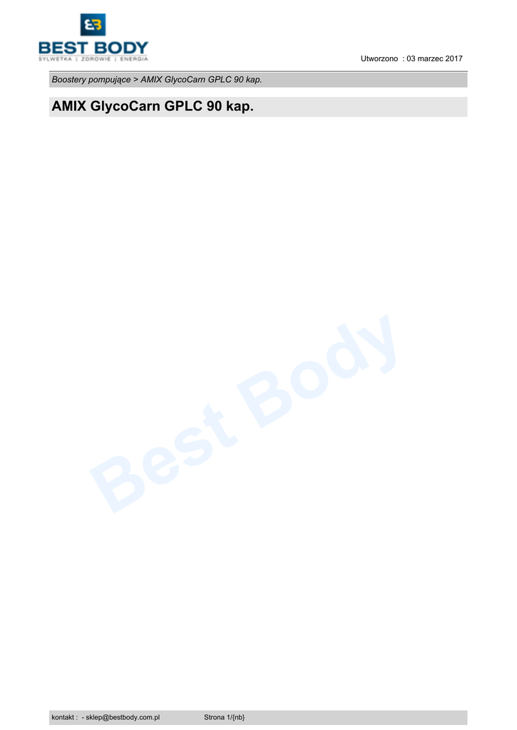 Utworzono : 03 marzec 2017 Boostery pompujące > AMIX GlycoCarn GPLC 90 kap. AMIX GlycoCarn GPLC 90 kap. t s e B kontakt : - [email protected] Strona 1/{nb} o B y d Utworzono : 03 marzec 2017 Boostery pompujące > AMIX GlycoCarn GPLC 90 kap. AMIX GlycoCarn GPLC 90 kap. Model : AMIX GlycoCarn GPLC 90 kap. Producent : Amix GlycoCarn GPLC - powoduje zwiększone rozszerzenie naczyń krwionośnych, daje uczucie niesamowitej pompy mięśni i wydajności, usuwa kwas mlekowy - znikają zakwasy. Wspomaga również spalanie tłuszczu i dodaje energii podczas treningu. Posiada także moc przeciwutleniaczy, jest bowiem aktywny w organizmie przez długi czas. � Jedyna substancja na rynku, która ma potwierdzoną skuteczność w zwiększaniu tlenku azotu � Najmocniejszy wolumizer tlenku azotu na rynku � Kilkukrotnie większa pompa miężniowa niż w przypadku argininy � Usuwa kwas mlekowy z mięśni � Potężna waskularyzacja włókien mięśniowych � Polepszony transport składników odżywczych � Zwiększenie wytrzymałości i objętości treningu y d o B Amix GPLC Glycocarn wykazuje zdolność do rozszerzania naczyń krwionośnych, pozwalając na jeszcze lepsze ukrwienie mięśni i tkanek miękkich. Dzięki tak dużemu napływowi krwi do mięśni, pompa jest silnie odczuwalna i długo utrzymująca się. GlycoCarn - połączenie cząsteczek Glicyny i L-Karnityny. Uczestniczy w procesie powstawania czerwonych krwinek, tym samym wpływa na transport tlenu we krwi, odgrywa istotną rolę w procesach syntezy Glukozy i Kreatyny. t s e B Amix GPLC (Glicyn Propionyl L-karnityny) jest opatentowaną formą L-karnityny GlycoCarn. Przyspiesza tempo splania tkanki tłuszczowej, reguluje metabolizm komórkowy (jej obecność jest niezbędna do zajścia procesu utleniania kwasów tłuszczowych), podnosi wydolność, pomaga w ochronie układu sercowo-naczyniowego, działa antyoksydacyjnie, a także poprawia utlenienie kontakt : - [email protected] Strona 2/{nb} Utworzono : 03 marzec 2017 Boostery pompujące > AMIX GlycoCarn GPLC 90 kap. AMIX GlycoCarn GPLC 90 kap. mięśni. Uczestniczy w procesie powstawania czerwonych krwinek, tym samym wpływa na transport tlenu we krwi, odgrywa istotną rolę w procesach syntezy Glukozy i Kreatyny. Na Uniwersytecie w Memphis (Stany Zjednoczone) przeprowadzono podwójnie ślepą próbę krzyżową, w której wytrenowani ochotnicy (trening oporowy) poddani zostali obserwacji przekrwienia odczynowego po przyjęciu GPLC. Badanie to polega na wywołaniu gwałtownej wazodylatacji w odpowiedzi na czasowe ograniczenie przepływu krwi. Wiadomo, że zjawisko wazodylatacji pojawia się w odpowiedzi na produkcję tlenku azotu (NO) w naczyniach krwionośnych. W naszym eksperymencie jedenaście osób z piętnastoosobowej grupy, której przez okres czterech tygodni podawano 4,5 g/dz. GlycoCarn wykazało znacząco większą odpowiedź tlenku azotu w porównaniu do placebo. Mechanizm, w jaki NO reguluje odpowiedź naczyniową, polega na zaangażowaniu przekaźnika drugiego rzędu, cyklicznego guanozynomonofosforanu (cGMP). W pracujących mięśniach tlenek azotu aktywuje enzym zwany cyklazą guanylanową, w wyniku czego dochodzi do wzrostu poziomu cGMP, co rozluźnia mięśnie gładkie naczyń krwionośnych. To prowadzi do zaistnienia zjawiska wazodylatacji (w ten sam sposób działa Viagra). Zwiększony przez pracujące mięśnie przepływ krwi jest konieczny do przeciwdziałania efektowi wazokonstrykcyjnemu katecholamin (czyli adrenaliny i noradrenaliny). Proces wykorzystujący NO odpowiada za efekt ‘pompy’ na treningu. Lokalne zwiększenia przepływu krwi umożliwiają także lepsze dostarczanie składników odżywczych do mięśni, takich jak kreatyna i aminokwasy. t s e B y d o B Skład: 1 kapsułka zawiera 500 mg GPLC (Glycine Propionyl-L-Carnitine) Wielkość porcji: 1 kap. Ilość porcji w opakowaniu: 90 Dawkowanie i sposób użycia: stosować 2-3 kap. GPLC Glycocarn na 30 minut przed treningiem. UWAGA - kopiowanie oraz rozpowrzechnianie opisów jest zabronione przez BEST BODY © 2010. Ustawa z dnia 4 lutego 1994 r. o prawie autorskim i prawach pokrewnych (Dz. U. z 2006 r. Nr 90, poz. 631 z późn. zm.). Ochrona autorskich praw osobistych: Twórca, którego autorskie prawa osobiste zostały zagrożone cudzym działaniem, może żądać zaniechania tego działania. W razie dokonanego naruszenia może także żądać, aby osoba, która dopuściła się naruszenia, dopełniła czynności potrzebnych do usunięcia jego skutków, w szczególności, aby złożyła publiczne oświadczenie o odpowiedniej treści i formie. Jeżeli naruszenie było zawinione, sąd może przyznać twórcy odpowiednią sumę pieniężną tytułem zadośćuczynienia za doznaną krzywdę albo - na żądanie twórcy - zobowiązać sprawcę, aby uiścił odpowiednią sumę pieniężną na wskazany przez twórcę cel społeczny. Cena : 109,00 zł Brutto ( 101,87 zł Netto) kontakt : - [email protected] Strona 3/{nb} Utworzono : 03 marzec 2017 Boostery pompujące > AMIX GlycoCarn GPLC 90 kap. AMIX GlycoCarn GPLC 90 kap. Dostępność: Produkt dostępny w naszym sklepie od 28 luty 2012 t s e B kontakt : - [email protected] Strona 4/{nb} o B y d
