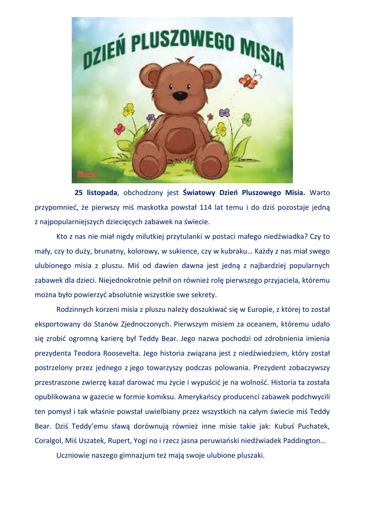 25 listopada, obchodzony jest Światowy Dzień Pluszowego Misia. Warto przypomnied, że pierwszy miś maskotka powstał 114 lat temu i do dziś pozostaje jedną z najpopularniejszych dziecięcych zabawek na świecie. Kto z nas nie miał nigdy milutkiej przytulanki w postaci małego niedźwiadka? Czy to mały, czy to duży, brunatny, kolorowy, w sukience, czy w kubraku… Każdy z nas miał swego ulubionego misia z pluszu. Miś od dawien dawna jest jedną z najbardziej popularnych zabawek dla dzieci. Niejednokrotnie pełnił on również rolę pierwszego przyjaciela, któremu można było powierzyd absolutnie wszystkie swe sekrety. Rodzinnych korzeni misia z pluszu należy doszukiwad się w Europie, z której to został eksportowany do Stanów Zjednoczonych. Pierwszym misiem za oceanem, któremu udało się zrobid ogromną karierę był Teddy Bear. Jego nazwa pochodzi od zdrobnienia imienia prezydenta Teodora Roosevelta. Jego historia związana jest z niedźwiedziem, który został postrzelony przez jednego z jego towarzyszy podczas polowania. Prezydent zobaczywszy przestraszone zwierzę kazał darowad mu życie i wypuścid je na wolnośd. Historia ta została opublikowana w gazecie w formie komiksu. Amerykaoscy producenci zabawek podchwycili ten pomysł i tak właśnie powstał uwielbiany przez wszystkich na całym świecie miś Teddy Bear. Dziś Teddy’emu sławą dorównują również inne misie takie jak: Kubuś Puchatek, Coralgol, Miś Uszatek, Rupert, Yogi no i rzecz jasna peruwiaoski niedźwiadek Paddington… Uczniowie naszego gimnazjum też mają swoje ulubione pluszaki. Uczniowie klasy I B Spotkanie na auli