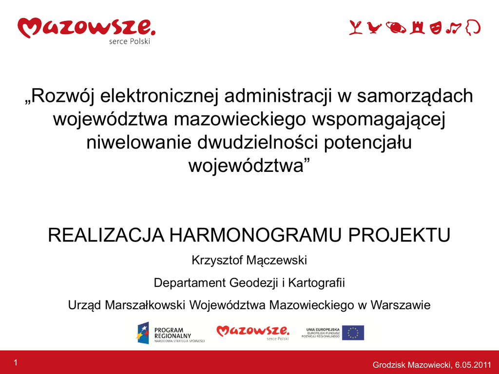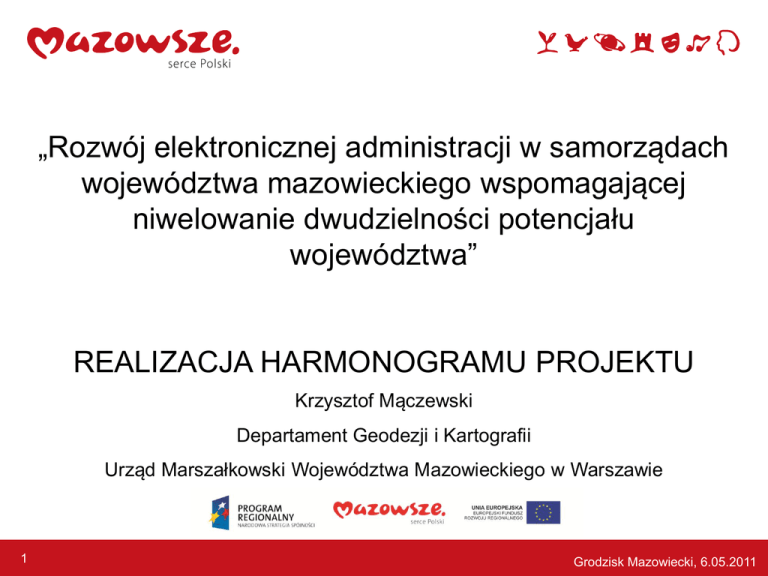 „Rozwój elektronicznej administracji w samorządach województwa mazowieckiego wspomagającej niwelowanie dwudzielności potencjału województwa” REALIZACJA HARMONOGRAMU PROJEKTU Krzysztof Mączewski Departament Geodezji i Kartografii Urząd Marszałkowski Województwa Mazowieckiego w Warszawie 1 Grodzisk Mazowiecki, 6.05.2011 Plan prezentacji Zadania projektowe Stan realizacji zamówień publicznych Informacja o złożonych wnioskach o płatność 2 Grodzisk Mazowiecki, 6.05.2011 Zadanie nr 1 - 3 056 100 zł Opracowanie, w oparciu o rezultaty projektu MSIP-GPW, systemu informatycznego e-Urząd, który będzie umożliwiał elektroniczny obieg dokumentów oraz elektroniczną obsługę obywateli, a także wspomagał realizację ustawowych zadań gmin i powiatów oraz opracowanie standardu komunikacji elektronicznej pomiędzy JST Województwa Mazowieckiego Zadanie nr 2 - 44 936 600 zł Wdrożenie oprogramowania e-Urząd w powiatach i gminach w tym przeprowadzenie instruktażu dla pracowników starostw powiatowych i urzędów gmin (EOO, EOD, SP, PE, szyna ESB, Systemy Dziedzinowe) 3 Grodzisk Mazowiecki, 6.05.2011 Zamówienia w ramach Zadania 1 i 2 opracowanie i wdrożenie podstawowych komponentów systemu informatycznego e-Urząd (tzw. rdzenia systemu – EOD, EOO, SPB, eFormularze) Kwota: 17,5 mln zł Zaawansowanie: postępowanie w trybie dialogu konkurencyjnego Czas wykonania: 12 miesięcy opracowanie i wdrożenie systemów dziedzinowych wspomagających realizację ustawowych zadań gmin i powiatów Kwota: 30,4 mln zł Zaawansowanie: opracowanie dokumentacji przetargowej Czas wykonania: 10-12 miesięcy 4 Grodzisk Mazowiecki, 6.05.2011 Zadanie nr 3 - 1 400 000 zł Dostawa i instalacja sprzętu komputerowego na szczeblu wojewódzkim (serwery, macierz, urządzenie do wykonywania kopii bezpieczeństwa danych, urządzenia sieciowe, szafa serwerowa) (LCC) Zadanie nr 4 - 2 124 000 zł Dostawa i instalacja sprzętu komputerowego dla powiatów Zadanie nr 5 - 5 429 000 zł Dostawa i instalacja sprzętu komputerowego dla gmin 5 Grodzisk Mazowiecki, 6.05.2011 Zamówienia w ramach Zadania 3, 4, 5 zakup sprzętu komputerowego i systemów operacyjnych na potrzeby realizacji projektu „Przyspieszenie wzrostu konkurencyjności województwa mazowieckiego, przez budowanie społeczeństwa informacyjnego i gospodarki opartej na wiedzy poprzez stworzenie zintegrowanych baz wiedzy o Mazowszu” oraz projektu „Rozwój elektronicznej administracji w samorządach województwa mazowieckiego wspomagającej niwelowanie dwudzielności potencjału województwa” Kwota: 25,5 mln zł w tym w ramach projektu EA 8 953 000 zł Zaawansowanie: dokonano wyboru najkorzystniejszej oferty, oczekujemy na rozprawę przed KIO Czas wykonania: 5 miesięcy 6 Grodzisk Mazowiecki, 6.05.2011 Zamówienia w ramach Zadania 3, 4, 5 zamówienia uzupełniające do zamówienia na zakup sprzętu komputerowego i systemów operacyjnych na potrzeby realizacji projektu „Przyspieszenie wzrostu konkurencyjności województwa mazowieckiego, przez budowanie społeczeństwa informacyjnego i gospodarki opartej na wiedzy poprzez stworzenie zintegrowanych baz wiedzy o Mazowszu” oraz projektu „Rozwój elektronicznej administracji w samorządach województwa mazowieckiego wspomagającej niwelowanie dwudzielności potencjału województwa” Kwota: do 10% wartości zamówienia podstawowego Zaawansowanie: rozpoczęcie działań w tym zakresie uzależnione od podpisania umowy dot. zamówienia podstawowego oraz woli Partnerów Czas wykonania: w zależności od skali dodatkowych potrzeb Partnerów 7 Grodzisk Mazowiecki, 6.05.2011 Zadanie nr 6 - 364 304 zł Informacja i promocja projektu Zamówienia w ramach Zadania 6 zakup usługi prowadzenia działań informacyjnych i promocyjnych dla Projektu, Kwota: 347 700,00 zł, wydatkowano 90 402,00 zł Zaawansowanie: umowa zawarta w dniu 09.06.2010 r. Czas wykonania: do dnia 15 listopada 2012 r. 8 Grodzisk Mazowiecki, 6.05.2011 Zamówienia w ramach Zadania 6 Zakup tablic informacyjnych: Kwota: 439,20zł Zaawansowanie: umowa zawarta w dniu 8.11.2010, zrealizowano Czas wykonania: 2 dni robocze od akceptacji projektu Ewentualne zamówienia uzupełniające do zamówienia na zakup usługi prowadzenia działań informacyjnych i promocyjnych dla Projektu Kwota: 15 000 zł Zaawansowanie: rozpoczęcie działań uzależnione od oceny potrzeb Czas wykonania: do grudnia 2012 r. 9 Grodzisk Mazowiecki, 6.05.2011 Zadanie nr 7 - 1 700 000 zł Doradztwo techniczne i finansowe w tym obsługa prawna zamówień publicznych Zadanie nr 10 - 570 000 zł Monitoring i kontrola prac instalacyjnych oraz testowanie i czynności techniczne odbioru systemów IT realizowanych w ramach projektu 10 Grodzisk Mazowiecki, 6.05.2011 Zamówienia w ramach Zadania 7 i 10 zakup obsługi prawnej dla Projektu: Kwota: 234 240,00 zł wydatkowano 46.848,00 zł Zaawansowanie: umowa zawarta 19 maja 2010 (w trakcie realizacji) Czas wykonania: do 10 grudnia 2012r. usługi w zakresie doradztwa technicznego i finansowego oraz koordynacji zadań wynikających z harmonogramu rzeczowofinansowego projektu, monitorowania i rozliczenia projektu Kwota: 1 127 280,00 zł Zaawansowanie: umowa podpisana w lutym 2011r. Czas wykonania: do dnia 10 grudnia 2012 r. 11 Grodzisk Mazowiecki, 6.05.2011 Zamówienia w ramach Zadania 7 i 10 usług odbioru technicznego dostaw sprzętu komputerowego i systemów operacyjnych do Urzędu Marszałkowskiego Województwa Mazowieckiego oraz do 325 siedzib jednostek samorządu terytorialnego województwa mazowieckiego (starostwa powiatowe i urzędy gmin / miast) będących Partnerami Projektu EA oraz Projektu BW: Kwota: 310 050,80 zł w tym 108 827,83 zł w ramach projektu EA Zaawansowanie: umowa zawarta w grudniu 2010 Czas wykonania: do 31 sierpnia 2011 r. 12 Grodzisk Mazowiecki, 6.05.2011 Zamówienia w ramach Zadania 7 i 10 Zamówienie dodatkowe do zamówienia na usługi w zakresie doradztwa technicznego i finansowego oraz koordynacji zada