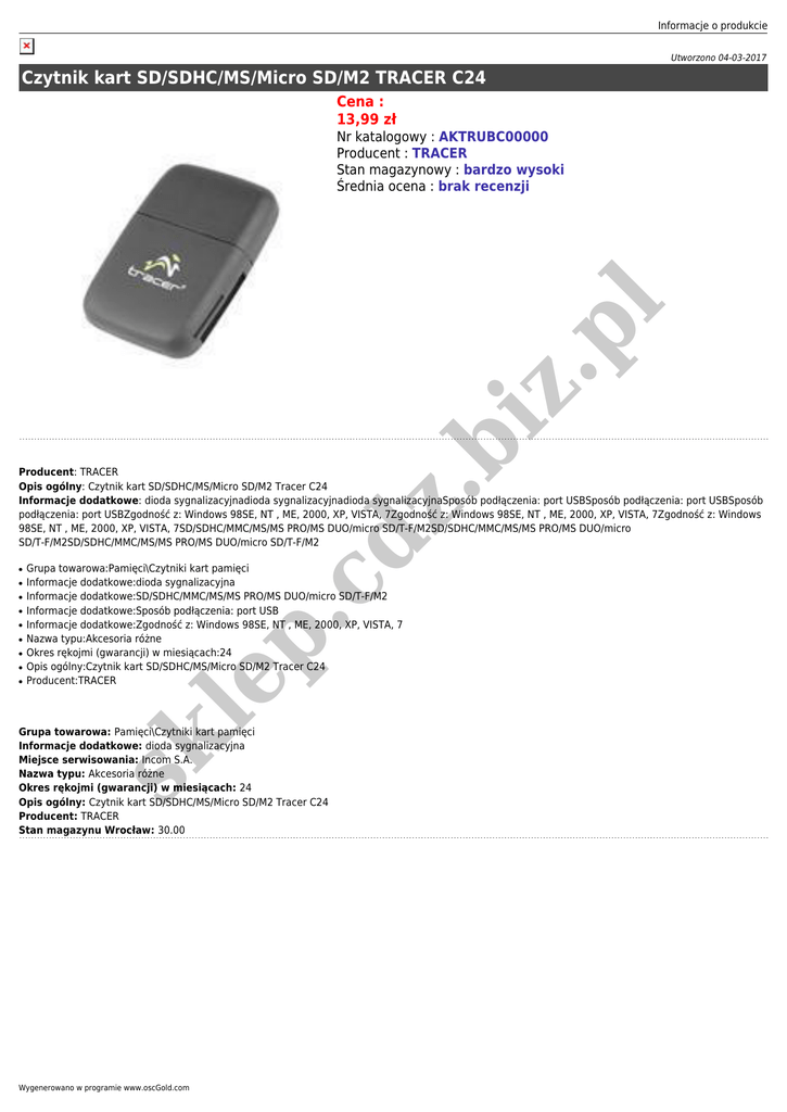 Informacje o produkcie Utworzono 04-03-2017 Czytnik kart SD/SDHC/MS/Micro SD/M2 TRACER C24 Cena : 13,99 zł .b iz .p l Nr katalogowy : AKTRUBC00000 Producent : TRACER Stan magazynowy : bardzo wysoki Średnia ocena : brak recenzji ● ● ● ● ● ● ● Grupa towarowa:Pamięci\Czytniki kart pamięci Informacje dodatkowe:dioda sygnalizacyjna Informacje dodatkowe:SD/SDHC/MMC/MS/MS PRO/MS DUO/micro SD/T-F/M2 Informacje dodatkowe:Sposób podłączenia: port USB Informacje dodatkowe:Zgodność z: Windows 98SE, NT , ME, 2000, XP, VISTA, 7 Nazwa typu:Akcesoria różne Okres rękojmi (gwarancji) w miesiącach:24 Opis ogólny:Czytnik kart SD/SDHC/MS/Micro SD/M2 Tracer C24 Producent:TRACER .c ● le p ● dz Producent: TRACER Opis ogólny: Czytnik kart SD/SDHC/MS/Micro SD/M2 Tracer C24 Informacje dodatkowe: dioda sygnalizacyjnadioda sygnalizacyjnadioda sygnalizacyjnaSposób podłączenia: port USBSposób podłączenia: port USBSposób podłączenia: port USBZgodność z: Windows 98SE, NT , ME, 2000, XP, VISTA, 7Zgodność z: Windows 98SE, NT , ME, 2000, XP, VISTA, 7Zgodność z: Windows 98SE, NT , ME, 2000, XP, VISTA, 7SD/SDHC/MMC/MS/MS PRO/MS DUO/micro SD/T-F/M2SD/SDHC/MMC/MS/MS PRO/MS DUO/micro SD/T-F/M2SD/SDHC/MMC/MS/MS PRO/MS DUO/micro SD/T-F/M2 sk Grupa towarowa: Pamięci\Czytniki kart pamięci Informacje dodatkowe: dioda sygnalizacyjna Miejsce serwisowania: Incom S.A. Nazwa typu: Akcesoria różne Okres rękojmi (gwarancji) w miesiącach: 24 Opis ogólny: Czytnik kart SD/SDHC/MS/Micro SD/M2 Tracer C24 Producent: TRACER Stan magazynu Wrocław: 30.00 Wygenerowano w programie www.oscGold.com