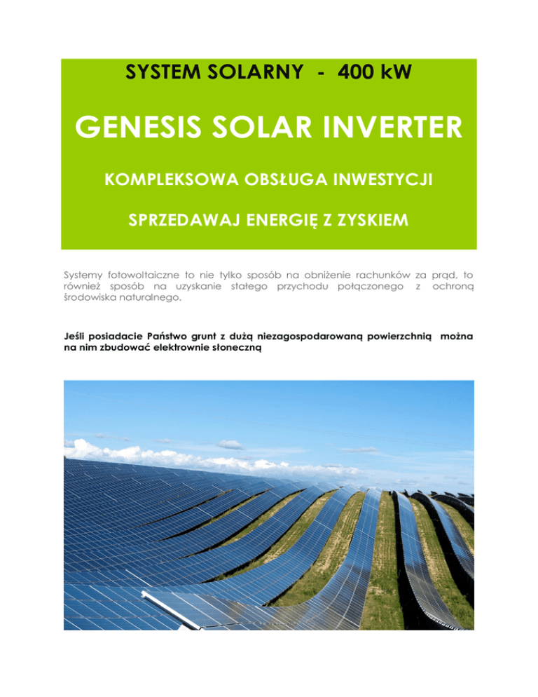SYSTEM SOLARNY - 400 kW GENESIS SOLAR INVERTER KOMPLEKSOWA OBSŁUGA INWESTYCJI SPRZEDAWAJ ENERGIĘ Z ZYSKIEM Systemy fotowoltaiczne to nie tylko sposób na obniżenie rachunków za prąd, to również sposób na uzyskanie stałego przychodu połączonego z ochroną środowiska naturalnego. Jeśli posiadacie Państwo grunt z dużą niezagospodarowaną powierzchnią można na nim zbudować elektrownie słoneczną Jeśli posiadacie Państwo halę produkcyjną lub inny obiekt z dużą niezagospodarowaną powierzchnią dachu, można na nim zbudować elektrownie słoneczną Jeśli planujecie Państwo budowę osiedla mieszkaniowego można na nim zaplanować instalacje mini elektrowni fotowoltaicznych Każdy tego typu system można dowolnie rozbudowywać o kolejne budynki monitorując wszystkie budynki z jednego miejsca SYSTEM GENESIS SOLAR INVERTER Systemy tego typu są zawsze połączone z siecią energetyczną w celu zapewnienia bezpieczeństwa w przypadku występujących okresowo mniej korzystnych warunków atmosferycznych (minimalne usłonecznienie). Systemy dołączone do sieci mogą mieć postać elektrowni z dużą ilością paneli fotowoltaicznych oddających energię do sieci elektroenergetycznej. Innym wykorzystaniem takich systemów może być zasilanie budynków dołączonych do sieci, gdzie energię z sieci pobiera się tylko wtedy, gdy zapotrzebowanie na nią przewyższa jej produkcję w ogniwach fotowoltaicznych. Systemy te dołączone są do sieci poprzez falownik. Akumulatory w tym typie systemu nie są potrzebne, ponieważ sieć jest w stanie przyjąć całą energię wyprodukowaną przez system fotowoltaiczny. Projektowanie systemów fotowoltaicznych jest zazwyczaj optymalizowane przy użyciu programów komputerowych, które dopasowują przewidywany profil obciążenia w ciągu roku i dnia do przeciętnego słonecznego napromieniowania na danym obszarze. Takie programy potrzebne są aby zdeterminować optymalną wielkość zestawu modułów i akumulatora, dobrać kontroler i falownik. Wydajność systemu zależy od promieniowania słonecznego podającego na zestaw modułów PV. Na przykład, wysoce użyteczny system wiejski ze współczynnikiem sprawności 50% w południowej Europie, gdzie promieniowanie słoneczne wynosi 1600 kWh/m2/rok może dać 800 kWh/kWp/rok. Jednakże na północy Europy, gdzie promieniowanie słoneczne wynosi 1000 kWh/m2/rok, system ten mógłby dać jedynie 500 kWh/kWp/rok. Generatory fotowoltaiczne podłączone do sieci mają największy potencjał uzyskiwania wysokich współczynników sprawności i wydajności, ponieważ cała energia którą wytwarzają może być zużyta albo na miejscu, albo przekazana sieci elektroenergetycznej. Dobrze kontrolowany system, który współpracuje z wysokiej sprawności falownikiem, może osiągnąć współczynniki sprawności wyższe niż 80% (równowartość wydajności powyżej 800 - 1400 kWh/kWp/rok). Na terenie Polski roczna suma usłonecznienia wynosi: 1600 godzin. Ten obiektywny wynik potwierdzony przez IMIGW pozwala uznać, iż koncepcja inwestowania w ogniwa fotowoltaiczne jest uzasadniona nie tylko z punktu widzenia wykorzystania energii dla własnych potrzeb ale także z myślą o jej odsprzedaży do sieci energetycznej. Coraz niższe ceny ogniw i systemów podwyższają opłacalność tego typu inwestycji, a funkcjonujące oraz nowowprowadzane programy dotacji jak również będąca w końcowej fazie negocjacji ustawa o Odnawialnych Źródłach Energii, skutecznie wspomoże te działania. SYSTEM GENESIS SOLAR INVERTER Koncepcja instalacji 400 kW System Genesis przeznaczony jest do wytwarzania prądu przemiennego we współpracy z siecią energetyczną. Zestaw nie posiada urządzeń magazynujących energię. Jest ona spożytkowana przez użytkownika lub odbierana przez sieć energetyczną. Energia produkowana przez system jest stale dostarczana do sieci, użytkownik kontroluje ilość wyprodukowanej energii i na tej podstawie dokonuje rozliczeń z miejscowym zakładem energetycznym. System Genesis jest całkowicie bezobsługowy, oznacza to, że nie wymaga dozoru użytkownika. Uproszczony przykład działania instalacji na gruncie System monitorowania instalacji Solar Log System monitorowania instalacji służy nam do pomiarów aktualnej produkcji, monitoruje prawidłową pracę systemu a w razie awarii powiadamia nas o tym za pomocą modułu GSM lub email. Charakterystyka produktu: Monitoruje na bieżąco pracę 1 do 100 inwerterów Komunikacja przy użyciu przeglądarki komputerowej WiFi, GPRS, Bluetooth Sterowanie za pomocą wyświetlacza dotykowego lub przeglądarki internetowej Różne możliwości komunikatów ostrzegawczych Możliwość montażu alarmu antykradzieżowego paneli słonecznych. Geneza zapewnia serwis gwarancyjny i pogwarancyjny Geneza zapewnia kompleksową realizację inwestycji: wniosek, projekt, montaż Opcjonalnie proponujemy także pomoc w uzyskaniu finansowania i dotacji, w ramach programów unijnych, które będą dostępne do 2020 roku. Gwarancja na elementy systemu: Moduły PV: 10 lat gwarancja produktu Moduły PV: 25 lat gwarancji wydajności Inwertery: 10 lat Konstrukcja: 10 lat Okablowanie: 10 lat Dane techniczne do pobrania: http://www.trinasolar.com/images/PDF/datasheets/eu/EN_datasheet_PC05A.pdf http://www.power-one.com/sites/power-one.com/files/documents/renewableenergy/datasheet/pvi-3.0_3.6_4.2-tl-de.pdf http://www.alumero.com/ http://www.helukabel.pl/katalog/index.html?q=00340 Elektrownia fotowoltaiczna 400 kW Roczna produkcja prądu Moc elektrowni słonecznej 400 kWp Roczna ekspozycja słońca 1040 kWh/m2 5 % 395200 kWh/rok Straty systemu Roczna produkcja energii elektrycznej Prognozowany przychód ze sprzedaży energii w PLN Orientacyjny koszt inwestycji wynosi 2 400 000 zł netto Proponowana cena energii Przychód ze sprzedaży 2016 Kolejne lata pracy elektrowni 1 0,65 256880 2017 2 0,65 256880 2018 3 0,65 256880 2019 4 0,65 256880 2020 5 0,65 256880 2021 6 0,65