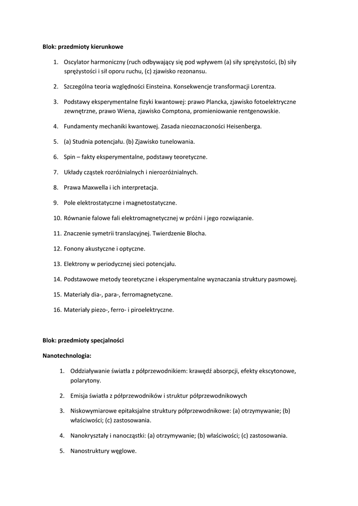 Blok: przedmioty kierunkowe 1. Oscylator harmoniczny (ruch odbywający się pod wpływem (a) siły sprężystości, (b) siły sprężystości i sił oporu ruchu, (c) zjawisko rezonansu. 2. Szczególna teoria względności Einsteina. Konsekwencje transformacji Lorentza. 3. Podstawy eksperymentalne fizyki kwantowej: prawo Plancka, zjawisko fotoelektryczne zewnętrzne, prawo Wiena, zjawisko Comptona, promieniowanie rentgenowskie. 4. Fundamenty mechaniki kwantowej. Zasada nieoznaczoności Heisenberga. 5. (a) Studnia potencjału. (b) Zjawisko tunelowania. 6. Spin – fakty eksperymentalne, podstawy teoretyczne. 7. Układy cząstek rozróżnialnych i nierozróżnialnych. 8. Prawa Maxwella i ich interpretacja. 9. Pole elektrostatyczne i magnetostatyczne. 10. Równanie falowe fali elektromagnetycznej w próżni i jego rozwiązanie. 11. Znaczenie symetrii translacyjnej. Twierdzenie Blocha. 12. Fonony akustyczne i optyczne. 13. Elektrony w periodycznej sieci potencjału. 14. Podstawowe metody teoretyczne i eksperymentalne wyznaczania struktury pasmowej. 15. Materiały dia-, para-, ferromagnetyczne. 16. Materiały piezo-, ferro- i piroelektryczne. Blok: przedmioty specjalności Nanotechnologia: 1. Oddziaływanie światła z półprzewodnikiem: krawędź absorpcji, efekty ekscytonowe, polarytony. 2. Emisja światła z półprzewodników i struktur półprzewodnikowych 3. Niskowymiarowe epitaksjalne struktury półprzewodnikowe: (a) otrzymywanie; (b) właściwości; (c) zastosowania. 4. Nanokryształy i nanocząstki: (a) otrzymywanie; (b) właściwości; (c) zastosowania. 5. Nanostruktury węglowe. 6. Mikroskopia sił atomowych (AFM), skaningowa mikroskopia tunelowa (STM). 7. Najważniejsze przyrządy półprzewodnikowe: złącze p-n, fotodioda, laser półprzewodnikowy, tranzystor polowy, MOSFET. 8. Źródła promieniowania elektromagnetycznego. 9. Metody detekcji i detektory promieniowania elektromagnetycznego 10. Interferencja światła i jej zastosowania 11. Dyfrakcja w przybliżeniuFresnela i Fraunhofera. Siatki dyfrakcyjne. 12. Polaryzacja światła, propagacja fali elektromagnetycznej w ośrodkach anizotropowych Fotonika: 1. Rodzaje światłowodów, sposoby wytwarzania, zastosowania 2. Dyspersja w światłowodach telekomunikacyjnych 3. Lasery, zasada działania, cechy promieniowania laserowego 4. Polaryzacja światła, sposoby opisy 5. Rodzaje interferometrów, zastosowania 6. Efekt plamkowania, zastosowania w metrologii 7. Kryteria oceny jakości odwzorowania w układach optycznych. 8. Zasada działania podstawowych układów optycznych (lupa, mikroskop, luneta), powiększenie, zdolnośd rozdzielcza, położenia źrenic, apertura numeryczna, otwór względny. 9. Efekt fotowoltaiczny na złączu p-n. 10. Zasada działania tranzystora. 11. Metody wytwarzania i zastosowania cienkich warstw 12. Metody pomiaru współczynnika załamania szkła. 13. Dyfrakcji światła w przybliżeniu bliskiego i dalekiego pola, strefy Fresnela, soczewka Fresnela 14. Spójnośd światła czasowa i przestrzenna, znaczenie spójności czasowej w interferometrii.