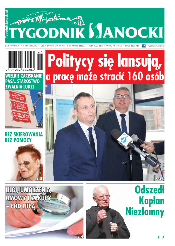 TygodnikSanocki.pl 6 LISTOPADA 2015 | NR 45 (1245) | CENA: 2,50 zł w tym 5% VAT | nr indeksu 338907 | ISSN 1232-6534 | PKWiU 58.14.11.0 | Nakład 3500 egz. | /TYGODNIK.SANOCKI Politycy się lansują, a pracę może stracić 160 osób WIELKIE ZACISKANIE PASA. STAROSTWO ZWALNIA LUDZI s. 3 s. 5 DOROTA MEĘARSKA BEZ SKIEROWANIA BEZ POMOCY s. 13 Odszedł Kapłan Niezłomny ULGI, UMORZENIA, UMOWY I ZAKUPY – POD LUPĄ s. 4 s. 7 2 Z TYGODNIA NA TYDZIEŃ 6 listopada 2015 r. „Bieszczadzki Żaczek” już wkrótce na torach! W związku ze spektakularnym sukcesem weekendowych połączeń kolejowych relacji Jasło–Komańcza promowanych w ramach kampanii społecznej KochamKolej.pl, Zarząd Województwa Podkarpackiego pozytywnie zaopiniował następny projekt zespołu kolejowych pasjonatów w postaci tytułowego pociągu relacji Rzeszów–Komańcza–Rzeszów. Stowarzyszenie Pomocy Rodzinie przejęło stację Sanok Miasto Stowarzyszenie w Sanoku działa od ośmiu lat. Jego prezesem jest Wanda Wojtuszewska. Głównym celem formacji jest niesienie pomocy osobom potrzebującym. Przede wszystkim niezamożnym i wielodzietnym rodzinom. Od kilku lat jego członkowie dokładają też starań, by w Sanoku powstał Dom Samotnej Matki. Z powodu braku odpowiedniego lokalu, w którym mogłaby powstać siedziba działaczy społecznych do- tychczas spotykali się oni w mieszkaniu Wandy Wojtuszewskiej lub w lokalu przy kościele pw. Przemienienia Pańskiego w Sanoku. Było to niewielkie pomieszczenie w piwnicy świątyni, w którym stowarzyszenie nie mogło sprawnie funkcjonować. – O lokal, w którym mogłaby powstać nasza siedziba staraliśmy się od 7 lat. Cieszę się, że w końcu władze miasta udostępniły nam budynek, w którym będziemy mogli prowadzić i rozwijać naszą działalność – mówi Wanda Wojtuszewska. Włodarze zdecydowali się na trzy lata bezpłatnie użyczyć stowarzyszeniu placówkę. Działacze społeczni będą płacić jedynie za bieżące rachunki. Budynek niedawno przeszedł gruntowny remont. Wymieniono dach, okna i drzwi. Wykonano też nową elewację. Natomiast wnętrze budynku podzielono na biuro stowarzyszenia i świetlicę, która ma służyć najmłodszym i seniorom. – Przygotowujemy się do przeprowadzenia naboru do klubu seniora i świetlicy dla dzieci. Dotychczas osoby star- Przepełnione kontenery i sterty liści Cudny labrador i słodka sunia. Czyje to psy?! Po uroczystości Wszystkich Świętych dotarł do nas sygnał, że na cmentarzu przy ul. Rymanowskiej w czasie obchodów 1 listopada panował bałagan. W przytulisku, w Olchowcach, czekają na właścicieli dwa psy: młody, energiczny, zadbany labrador oraz starsza już, ale słodka i garnąca się do ludzi suczka. Czy ktoś wie, do kogo należą? Psy bardzo źle się czują w kojcach – suczka cała się trzęsie, a labrador „tłucze” się jak oszalały. Na pewno chcą wrócić do domu. – Piękny labrador tra�ł do nas kilka dni temu. Błąkał się na ulicy Daszyńskiego. Pies jest młody i bardzo charakterystyczny. Widać domieszkę psa husky – jedno oko jest niebieskie, a drugie brązowe. Do naszych kojców w zeszłą sobotę tra�ła również maleńka suczka z guzem na brzuchu. Sunia została znaleziona na cmentarzu Centralnym w Sanoku. Kto rozpoznaje te psiaki? Prosimy o kontakt – apeluje gorąco Aneta Zaleska ze Społecznego – Po łydki chodziło się w liściach – skarży się jedna z czytelniczek. – Kontenery były przepełnione już od piątku. Tak nie powinno być! Widać, że cmentarz na przestrzeni lat zmienia się na lepsze. Powstały nowe miejsca parkingowe, odnowiono ogrodzenie, ale szacunek należy się przede wszystkim zmarłym, a nie samochodom – mówi wzburzona kobieta. Czytelniczka zastanawia się, dlaczego służby porządkowe nie zadbały o to, by w tym wyjątkowym dniu cmentarz wyglądał schludnie i czysto. Zwłaszcza że w poprzednich latach takie sytuacje nie miały miejsca. O sprawie poinformowaliśmy zarządcę cmentarza. Do tematu powrócimy w kolejnym numerze. aes www.TygodnikSanocki.pl [email protected] /TYGODNIK.SANOCKI sze nie miały miejsca, w którym mogłyby się spotykać. Mamy nadzieję, że dzięki naszemu klubowi to się zmieni – dodaje prezes stowarzyszenia. – Placówka nie jest jeszcze w pełni wyposażona. Staramy się jednak zdobyć środki, które umożliwią nam zakup niezbędnego sprzętu. Chcemy stworzyć warunki, w których zarówno dzieci, jak i osoby starsze będą mogły czuć się komfortowo. Członkom formacji pomysłów na rozwinięcie działalności nie brakuje. W przyszłości mają zamiar organizować między innymi konferencje, spotkania z rodzicami i dziećmi oraz zabawy dla najmłodszych. aes STONZ Stowarzyszenie Pomocy Rodzinie im. św. księdza Zygmunta Gorazdowskiego w końcu ma swoją siedzibę. Biuro formacji powstało w wyremontowanym budynku stacji Sanok. Oprócz niego w odnowionym lokalu mieścić będzie się również klub seniora i świetlica socjoterapeutyczna dla dzieci. Towarzystwa Opieki nad Zwierzętami. Jeśli nie zgłoszą się właściciele, stowarzyszenie poszuka im nowych domów. Kontakt: tel. 793 16 08 73 – Aneta Zaleska lub 501 428 255 – Jolanta Tomasik, prezes STOnZ. (z) Wydawca: Miejska Biblioteka Publiczna w Sanoku Adres redakcji: 38-500 Sanok, ul. Rynek 10, tel. 13 464 27 00 Redaktor naczelna: Dorota Mękarska – [email protected] Redaguje zespół: Bartosz Błażewicz – [email protected] Aneta Skóbel – [email protected] Jolanta Ziobro – [email protected] Redaktor techniczny: Artur Kucharski Korekta: Tomasz Kulpiński Biuro Reklam i Ogłoszeń: tel. 13-464-02-21, fax: 13-463-16-34 Druk: Media Regionalne Sp. z o.o. ul. Prosta 51, 00-838 Warszawa Oddział w Kielcach Drukarnia ul. Mechaniczna 12 39-402 Tarnobrzeg Materiałów niezamówionych redakcja nie zwraca. Zastrzegamy sobie prawo skracania i poprawiania tekstów, własnych tytułów i śródtytułów. W sprawie reklam i ogłosze