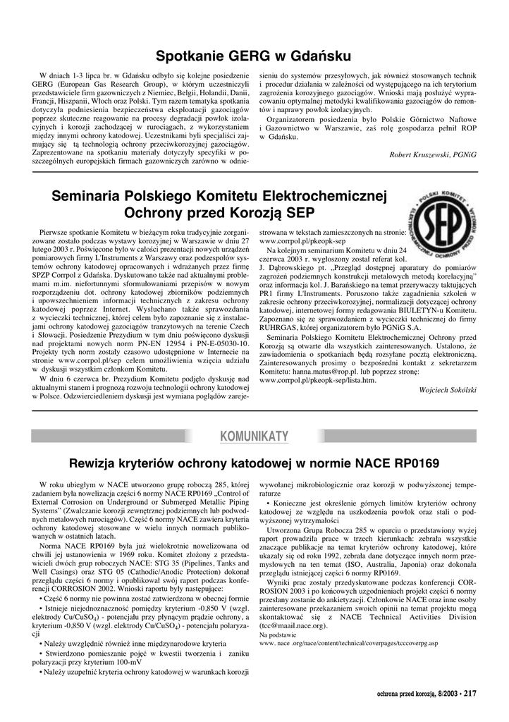 Spotkanie GERG w Gdaƒsku W dniach 1-3 lipca br. w Gdaƒsku odby∏o si´ kolejne posiedzenie GERG (European Gas Research Group), w którym uczestniczyli przedstawiciele firm gazowniczych z Niemiec, Belgii, Holandii, Danii, Francji, Hiszpanii, W∏och oraz Polski. Tym razem tematyka spotkania dotyczy∏a podniesienia bezpieczeƒstwa eksploatacji gazociàgów poprzez skuteczne reagowanie na procesy degradacji pow∏ok izolacyjnych i korozji zachodzàcej w rurociàgach, z wykorzystaniem mi´dzy innymi ochrony katodowej. Uczestnikami byli specjaliÊci zajmujàcy si´ tà technologià ochrony przeciwkorozyjnej gazociàgów. Zaprezentowane na spotkaniu materia∏y dotyczy∏y specyfiki w poszczególnych europejskich firmach gazowniczych zarówno w odnie- sieniu do systemów przesy∏owych, jak równie˝ stosowanych technik i procedur dzia∏ania w zale˝noÊci od wyst´pujàcego na ich terytorium zagro˝enia korozyjnego gazociàgów. Wnioski majà pos∏u˝yç wypracowaniu optymalnej metodyki kwalifikowania gazociàgów do remontów i naprawy pow∏ok izolacyjnych. Organizatorem posiedzenia by∏o Polskie Górnictwo Naftowe i Gazownictwo w Warszawie, zaÊ rol´ gospodarza pe∏ni∏ ROP w Gdaƒsku. Robert Kruszewski, PGNiG Seminaria Polskiego Komitetu Elektrochemicznej Ochrony przed Korozjà SEP Pierwsze spotkanie Komitetu w bie˝àcym roku tradycyjnie zorganizowane zosta∏o podczas wystawy korozyjnej w Warszawie w dniu 27 lutego 2003 r. PoÊwi´cone by∏o w ca∏oÊci prezentacji nowych urzàdzeƒ pomiarowych firmy L'Instruments z Warszawy oraz podzespo∏ów systemów ochrony katodowej opracowanych i wdra˝anych przez firm´ SPZP Corrpol z Gdaƒska. Dyskutowano tak˝e nad aktualnymi problemami m.im. niefortunnymi sformu∏owaniami przepisów w nowym rozporzàdzeniu dot. ochrony katodowej zbiorników podziemnych i upowszechnieniem informacji technicznych z zakresu ochrony katodowej poprzez Internet. Wys∏uchano tak˝e sprawozdania z wycieczki technicznej, której celem by∏o zapoznanie si´ z instalacjami ochrony katodowej gazociàgów tranzytowych na terenie Czech i S∏owacji. Posiedzenie Prezydium w tym dniu poÊwi´cono dyskusji nad projektami nowych norm PN-EN 12954 i PN-E-05030-10. Projekty tych norm zosta∏y czasowo udost´pnione w Internecie na stronie www.corrpol.pl/sep celem umo˝liwienia wzi´cia udzia∏u w dyskusji wszystkim cz∏onkom Komitetu. W dniu 6 czerwca br. Prezydium Komitetu podj´∏o dyskusj´ nad aktualnymi stanem i prognozà rozwoju technologii ochrony katodowej w Polsce. Odzwierciedleniem dyskusji jest wymiana poglàdów zareje- strowana w tekstach zamieszczonych na stronie: www.corrpol.pl/pkeopk-sep Na kolejnym seminarium Komitetu w dniu 24 czerwca 2003 r. wyg∏oszony zosta∏ referat kol. J. Dàbrowskiego pt. „Przeglàd dost´pnej aparatury do pomiarów zagro˝eƒ podziemnych konstrukcji metalowych metodà korelacyjnà” oraz informacja kol. J. Baraƒskiego na temat przerywaczy taktujàcych PR1 firmy L'Instruments. Poruszono tak˝e zagadnienia szkoleƒ w zakresie ochrony przeciwkorozyjnej, normalizacji dotyczàcej ochrony katodowej, internetowej formy redagowania BIULETYN-u Komitetu. Zapoznano si´ ze sprawozdaniem z wycieczki technicznej do firmy RUHRGAS, której organizatorem by∏o PGNiG S.A. Seminaria Polskiego Komitetu Elektrochemicznej Ochrony przed Korozjà sà otwarte dla wszystkich zainteresowanych. Ustalono, ˝e zawiadomienia o spotkaniach b´dà rozsy∏ane pocztà elektronicznà. Zainteresowanych prosimy o bezpoÊredni kontakt z sekretarzem Komitetu: [email protected]. lub poprzez stron´: www.corrpol.pl/pkeopk-sep/lista.htm. Wojciech Sokólski KOMUNIKATY Rewizja kryteriów ochrony katodowej w normie NACE RP0169 W roku ubieg∏ym w NACE utworzono grup´ roboczà 285, której zadaniem by∏a nowelizacja cz´Êci 6 normy NACE RP0169 „Control of External Corrosion on Underground or Submerged Metallic Piping Systems” (Zwalczanie korozji zewn´trznej podziemnych lub podwodnych metalowych rurociàgów). Cz´Êç 6 normy NACE zawiera kryteria ochrony katodowej stosowane w wielu innych normach publikowanych w ostatnich latach. Norma NACE RP0169 by∏a ju˝ wielokrotnie nowelizowana od chwili jej ustanowienia w 1969 roku. Komitet z∏o˝ony z przedstawicieli dwóch grup roboczych NACE: STG 35 (Pipelines, Tanks and Well Casings) oraz STG 05 (Cathodic/Anodic Protection) dokona∏ przeglàdu cz´Êci 6 normy i opublikowa∏ swój raport podczas konferencji CORROSION 2002. Wnioski raportu by∏y nast´pujàce: • Cz´Êç 6 normy nie powinna zostaç zatwierdzona w obecnej formie • Istnieje niejednoznacznoÊç pomi´dzy kryterium -0,850 V (wzgl. elektrody Cu/CuSO4) - potencja∏u przy p∏ynàcym pràdzie ochrony, a kryterium -0,850 V (wzgl. elektrody Cu/CuSO4) - potencja∏u polaryzacji • Nale˝y uwzgl´dniç równie˝ inne mi´dzynarodowe kryteria • Stwierdzono pomieszanie poj´ç w kwestii tworzenia i zaniku polaryzacji przy kryterium 100-mV • Nale˝y uzupe∏niç kryteria ochrony katodowej w warunkach korozji wywo∏anej mikrobiologicznie oraz korozji w podwy˝szonej temperaturze • Konieczne jest okreÊlenie górnych limitów kryteriów ochrony katodowej ze wzgl´du na uszkodzenia pow∏ok oraz stali o podwy˝szonej wytrzyma∏oÊci Utworzona Grupa Robocza 285 w oparciu o przedstawiony wy˝ej raport prowadzi∏a prace w trzech kierunkach: zebra∏a wszystkie znaczàce publikacje na temat kryteriów ochrony katodowej, które ukaza∏y si´ od roku 1992, zebra∏a dane dotyczàce innych norm przemys∏owych na ten temat (ISO, Australia, Japonia) oraz dokona∏a przeglàdu istniejàcej cz´Êci 6 normy RP0169. Wyniki prac zosta∏y przedyskutowane podczas konferencji CORROSION 2003 i po koƒcowych uzgodnieniach projekt cz´Êci 6 normy przes∏any zostanie do ankietyzacji. Cz∏onkowie NACE oraz inne osoby zainteresowane przekazaniem swoich opinii na temat projektu mogà skontaktowaç si´ z NACE Technical Activities Division ([email prote