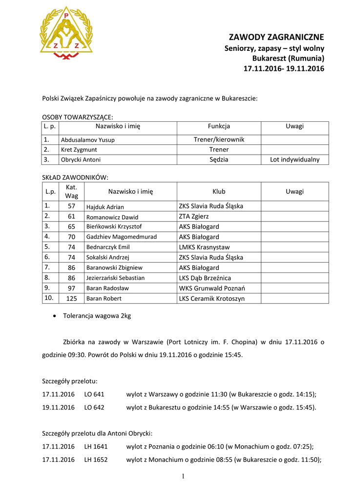 ZAWODY ZAGRANICZNE Seniorzy, zapasy – styl wolny Bukareszt (Rumunia) 17.11.2016- 19.11.2016 Polski Związek Zapaśniczy powołuje na zawody zagraniczne w Bukareszcie: OSOBY TOWARZYSZĄCE: L. p. Nazwisko i imię 1. 2. 3. Abdusalamov Yusup Kret Zygmunt Obrycki Antoni SKŁAD ZAWODNIKÓW: Kat. L.p. Nazwisko i imię Wag 1. 57 Hajduk Adrian 2. 61 Romanowicz Dawid 3. Bieńkowski Krzysztof 65 4. Gadzhiev Magomedmurad 70 5. Bednarczyk Emil 74 6. Sokalski Andrzej 74 7. Baranowski Zbigniew 86 8. Jezierzański Sebastian 86 9. Baran Radosław 97 10. 125 Baran Robert Funkcja Uwagi Trener/kierownik Trener Sędzia Lot indywidualny Klub Uwagi ZKS Slavia Ruda Śląska ZTA Zgierz AKS Białogard AKS Białogard LMKS Krasnystaw ZKS Slavia Ruda Śląska AKS Białogard LKS Dąb Brzeźnica WKS Grunwald Poznań LKS Ceramik Krotoszyn Tolerancja wagowa 2kg Zbiórka na zawody w Warszawie (Port Lotniczy im. F. Chopina) w dniu 17.11.2016 o godzinie 09:30. Powrót do Polski w dniu 19.11.2016 o godzinie 15:45. Szczegóły przelotu: 17.11.2016 LO 641 wylot z Warszawy o godzinie 11:30 (w Bukareszcie o godz. 14:15); 19.11.2016 LO 642 wylot z Bukaresztu o godzinie 14:55 (w Warszawie o godz. 15:45). Szczegóły przelotu dla Antoni Obrycki: 17.11.2016 LH 1641 wylot z Poznania o godzinie 06:10 (w Monachium o godz. 07:25); 17.11.2016 LH 1652 wylot z Monachium o godzinie 08:55 (w Bukareszcie o godz. 11:50); 1 19.11.2016 LH 1657 wylot z Bukaresztu o godzinie 06:05 (w Monachium o godz. 07:10); 19.11.2016 LH 1636 wylot z Monachium o godzinie 11:30 (w Poznaniu o godz. 12:45). W przypadku braku możliwości uczestnictwa w zawodach prosimy o tym niezwłocznie powiadomić biuro PZZ na e-mail: [email protected] lub tel. (22) 624 81 11. Zawodnik zobowiązany jest posiadać aktualne badania lekarskie oraz paszport ważny minimum 6 miesięcy. Przysługuje zwrot kosztów podróży (PKP II kl. posp. lub PKS) na podstawie załączonego biletu (bez kosztów diety i dojazdów) przesłanego zgodnie z obowiązującymi przepisami do biura PZZ w Warszawie w terminie nieprzekraczającym 14 dni od dnia zakończenia akcji. PRZEPISY WJAZDOWE. Od 1 stycznia 2007 r. obywatele polscy mogą wjeżdżać do Rumunii i przebywać w niej przez 90 dni, liczonych w ciągu 6 miesięcy od daty pierwszego wjazdu, oraz przejeżdżać tranzytem przez terytorium tego kraju na podstawie paszportów lub dowodów osobistych. Obywatele RP korzystają z prawa do swobodnego przepływu osób w ramach Unii Europejskiej/Europejskiego Obszaru Gospodarczego. 2