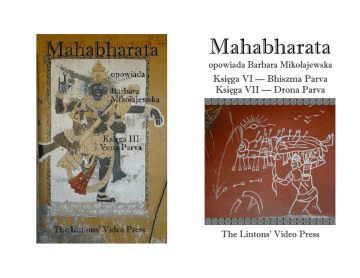 Mahabharata opowiada Barbara Mikołajewska Ksie˛ga VI — Bhiszma Parva Ksie˛ga VII — Drona Parva The Lintons’ Video Press Mikołajewska ● Mahabharata Księga III ● Vana Parva Mahabharata opowiada Barbara Mikołajewska Księga III, Vana Parva (w dwudziestu dwóch opowieściach) Napisane na podstawie Mahābharāta, 3. The Book of the Forest, w angielskim tłumaczeniu z sanskrytu J.A.B. van Buitenen, The University of Chicago Press. The Lintons’ Video Press New Haven, CT, USA 2007, 2012 Copyright © 2007-12 by Barbara Mikolajewska. All rights reserved. Technical and editorial advisor: F. E. J. Linton. e-mail inquiries: tlvpress @ yahoo.com. Printed in the United States of America. History: Episode 17 first posted on the Internet in late 2004. Subsequent episodes, updates and corrections added at irregular intervals. URL at first: http://home.att.net/~b.mikolajewska/booknook/Mahabharata/ ; now: http://tlvp.net/~b.mikolajewska/booknook/Mahabharata/ . First printed edition reflects status of Internet edition as of February, 2007. Current updated printing amends several earlier typographical infelicities. Look for further episodes, updates and corrections sporadically in the future. Typography and page layout accomplished using Microsoft Word 2000. Published in the United States in 2007 by The Lintons’ Video Press New Haven, CT USA ISBN-10: 1-929865-35-X ISBN-13: 978-1-929865-35-2 Spis treści strona 7 Księga III (Vana Parva) Synopsis 9 Opowieść 17: Poszukiwanie spokoju umysłu 13 Opowieść 18: Wyjaśnienie nieobecności Kryszny podczas gry w kości 29 Opowieść 19: Powstrzymywanie gniewu i gotowość do ofiar w imię wierności Prawu 39 Opowieść 20: Bogowie oddają umartwiającemu się Ardżunie swoją broń i czynią z niego wojownika we własnej sprawie 53 Opowieść 21: Król Prawa poznaje tajemnicę gry w kości zbrojąc się do walki z Kali 69 Opowieść 22: Król Prawa wyrusza na pielgrzymkę do świętych brodów 105 Opowieść 23: O sile duchowej mędrca Agastji 113 Opowieść 24: O ofiarach, ołtarzach i miejscach ofiarnych 127 Opowieść 25: Bezkarny występek Bhimy 147 Opowieść 26: Ardżuna opowiada o swej walce z wrogami bogów 173 Opowieść 27: Król Prawa dzięki swej prawości ratuje Bhimę z uścisku głodnego węża boa 183 Opowieść 28: O obrotach Koła Czasu 193 Opowieść 29: O tym, jak bramin Utanka otrzymał od boga Wisznu dar jogi 213 Opowieść 30: O dharmie (Prawie), jodze i poznawaniu własnej duszy 219 Opowieść 31: Tajemnica znikania i odradzania się ognia 239 Opowieść 32: Chaos narodzin boga wojny i chorób, Skandy, który stając się dowódcą armii bogów umacnia władzę Indry i pokonuje demony 247 Opowieść 33: Durjodhana dowiaduje się, że jest bóstwem, które ma prowadzić demony asury do zwycięstwa 265 Opowieść 34: Draupadi ponownie pada ofiarą żądzy 291 Opowieść 35: O tym jak Rama uwalnia światy od terroru rakszasy Rawany 301 Opowieść 36: O potędze oddanej swemu mężowi żony 331 Opowieść 37: O prawości Karny i jego ofierze 345 Opowieść 38: Król Prawa zadowala boga Prawa swą łagodnością 357 Dodatki Słowniczek Mahabharaty (księga III) Indeks imion 367 369 387 Księga III Vana Parva (w dwudziestu dwóch opowieściach) Księga III Synopsis 9 Synopsis W księdze trzeciej Mahabharaty Pandawowie próbują sprostać konsekwencjom podstępnej gry w kości, do której sprowokowali ich Kaurawowie. Okradzieni ze swego królestwa i wygnani na trzynaście lat podejmują różne praktyki duchowe, próbując opanować swój słuszny skądinąd gniew i określić dla siebie właściwą linię postępowania. Doświadczają konfliktu między naciskiem na natychmiastowy odwet, do którego popycha ich przynależność do kasty wojowników, a powstrzymywaniem się od odwetu, aby nie łamać obietnicy danej Kaurawom przez Króla Prawa, że w przypadku przegranej udadzą się na wygnanie. Pod kierunkiem Króla Prawa, którego umysł potrafi podążać jedynie ścieżką najwyższego dobra, Pandawowie ujarzmiają coraz bardziej swój gniew i potrzebę natychmiastowego impulsywnego odwetu, gdyż to właśnie niekończący się łańcuch odwetu doprowadził do upadku Króla Prawa podczas gry w kości. Choć opóźniają odwet, wiedzą, że we właściwym czasie jest on nieunikniony, gdyż upokorzenie i znęcanie się nad ich żoną Draupadi musi być ukarane. Chcą jednakże zrealizować swą zemstę w formie wymierzenia sprawiedliwości bez schodzenia ze ścieżki Prawa, która jest ścieżką dobra prowadzącą do wyzwolenia duszy i utrzymania istnienia wszechświata. Odwet za poniżenie ich żony w Gmachu Gry, choć odroczony jest nieunikniony, gdyż padło zbyt wiele przysiąg, a także jej własny gniew potrafi uciszyć jedynie krew jej prześladowców. Realizację zemsty obiecuje jej sam Kryszna, który w odpowiedzi na jej gniewne słowa wyjaśnia, że nie było go w Hastinapurze podczas doprowadzającej do ich upadku gry w kości i nie mógł udzielić im pomocy, gdyż cierpiał konsekwencje w gruncie rzeczy nieudanej ofiary koronacyjnej Króla Prawa i musiał walczyć z tymi, którzy szukali na nim zemsty za zabicie króla Sziśupali. Król Prawa świadomy nieuchronności wojny domowej za radą bramina Wjasy wysyła Ardżunę—od którego umiejętności posługiwania się bronią zależy ich przyszła wygrana—w Himalaje do świata Indry z zadaniem zdobycia boskiej broni, gdyż tylko w ten sposób zdoła on pokonać tych członków swej rodziny, którzy ze względu na swą lojalność wobec Hastinapury będą zmuszeni do walki po stronie Durjodhany, a którzy dzięki swej prawości i swym dotychczasowym zasługom są w posiadaniu boskiej broni—jak ich dziadek Bhiszma i ich nauczyciele bramini Drona i Krypa. Posłuszny rozkazowi swego najstarszego brata Ardżuna poddaje się surowym umartwieniom i podejmuje walkę z Najwyższym Bogiem Śiwą i w ten sposób dostaje się za życia do nieba Indry, gdzie zdobywa bosk